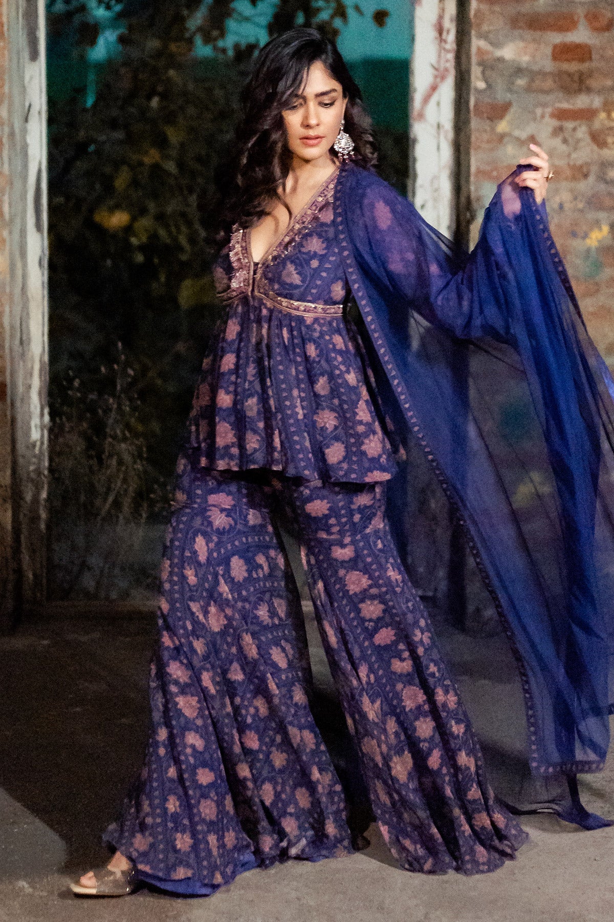 Navy printed chiffon embroidered peplum with printed chiffon garara and net dupatta with small printed four side border