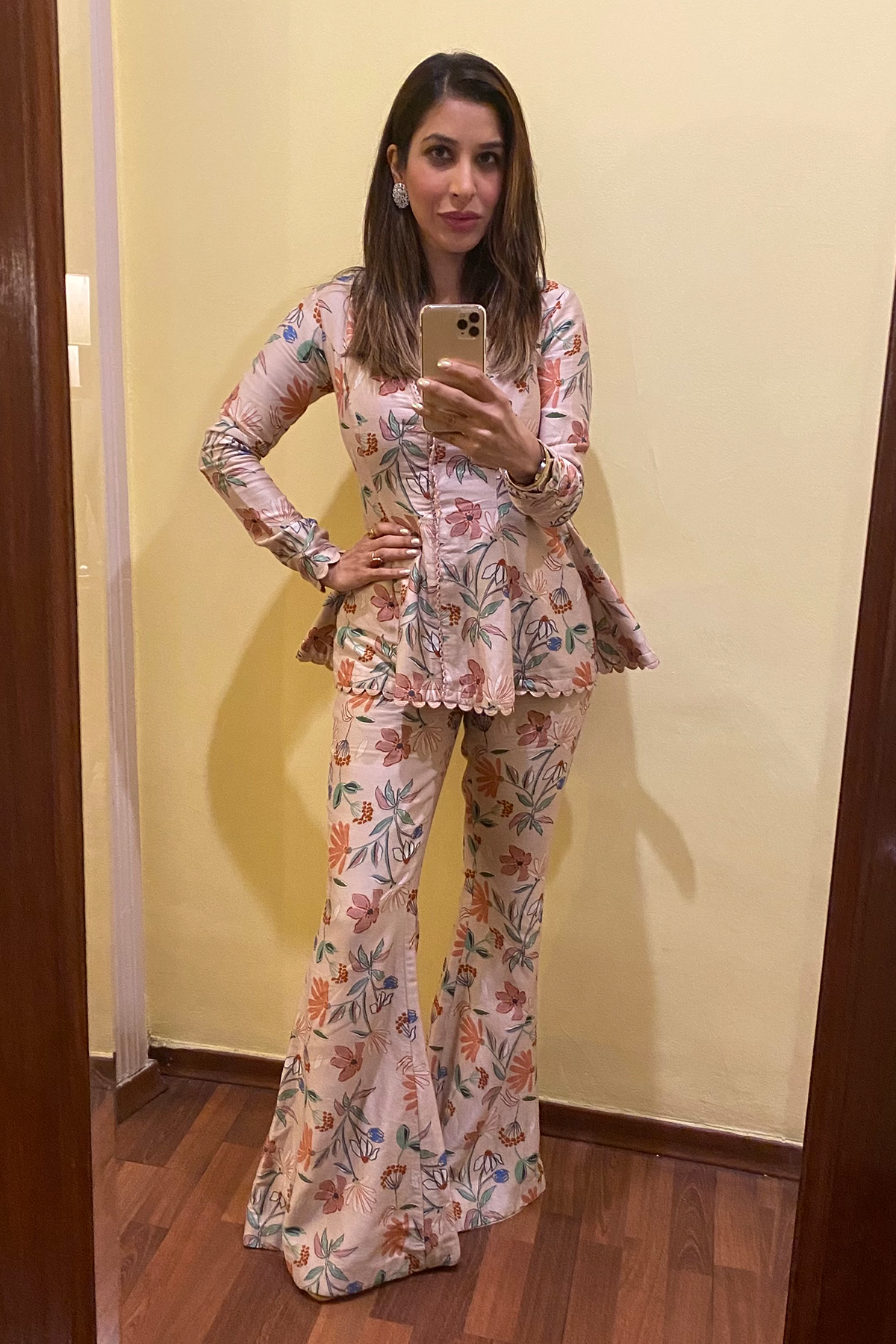 Beige Big Floral printed Chanderi Peplum top. Beige big floral printed chanderi flared pants.