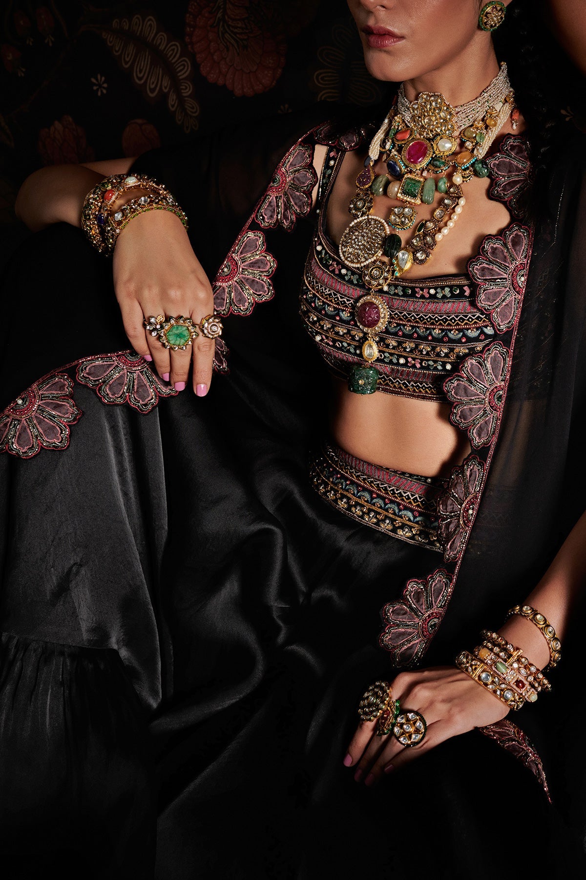 Organza tiered gharara with embroidered blouse and georgette cape.