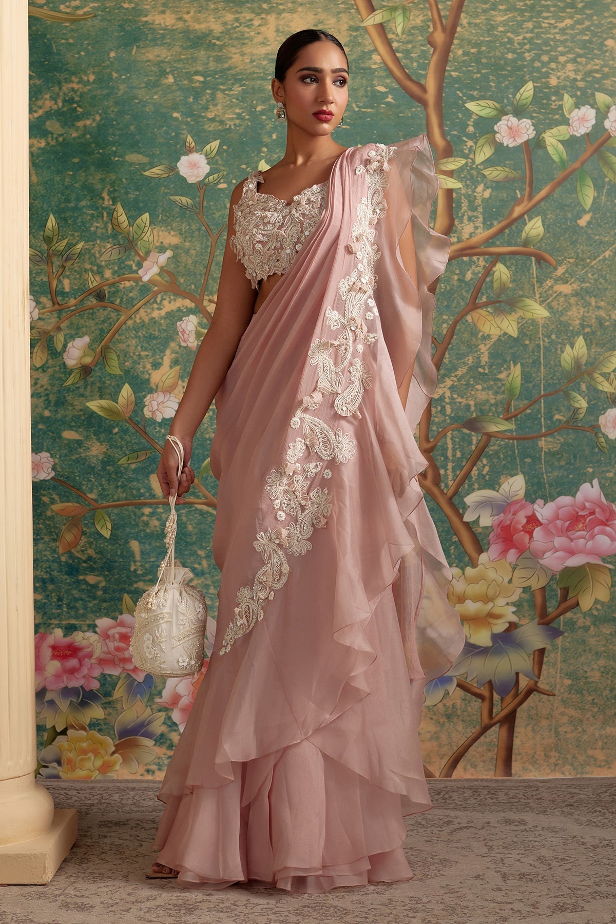 Elevate your style with our exquisite saree set featuring a net embroidered blouse paired seamlessly with a chiffon-draped saree adorned with delicate organza ruffles. this monotone handwork ensemble exudes sophistication, with meticulous embroidery enhancing the allure of the drape. perfect for special occasions and festivities, this saree set effortlessly combines traditional craftsmanship with contemporary design. the lightweight chiffon draping and intricate details make it a comfortable yet stylish choice. make a statement at any event with this stunning saree set that promises to captivate attention and leave a lasting impression.