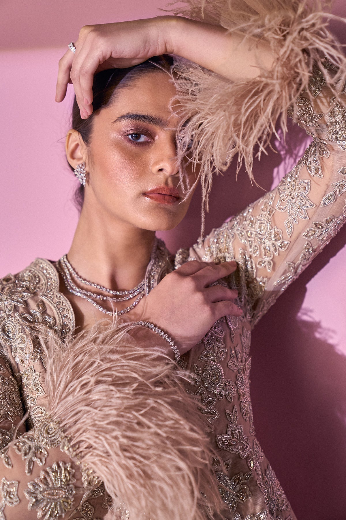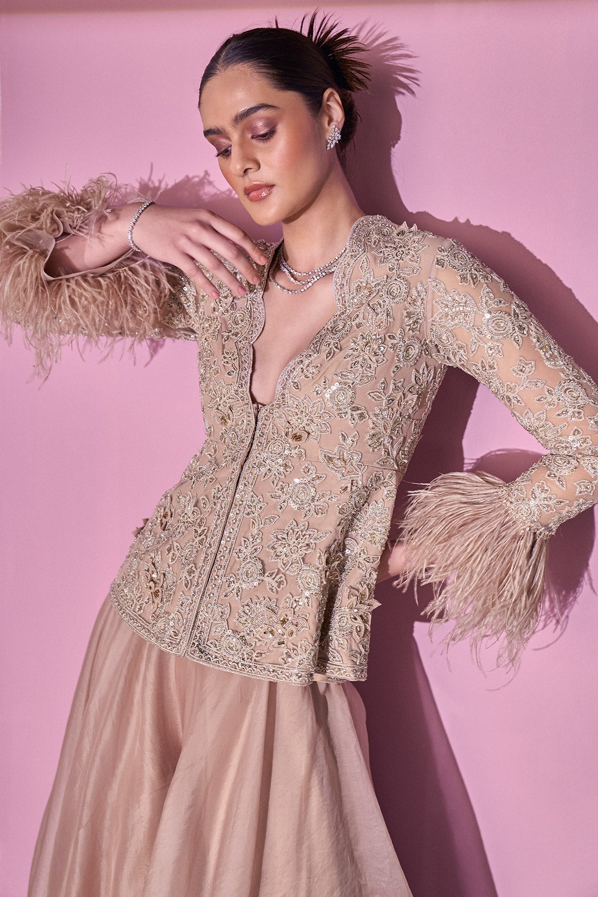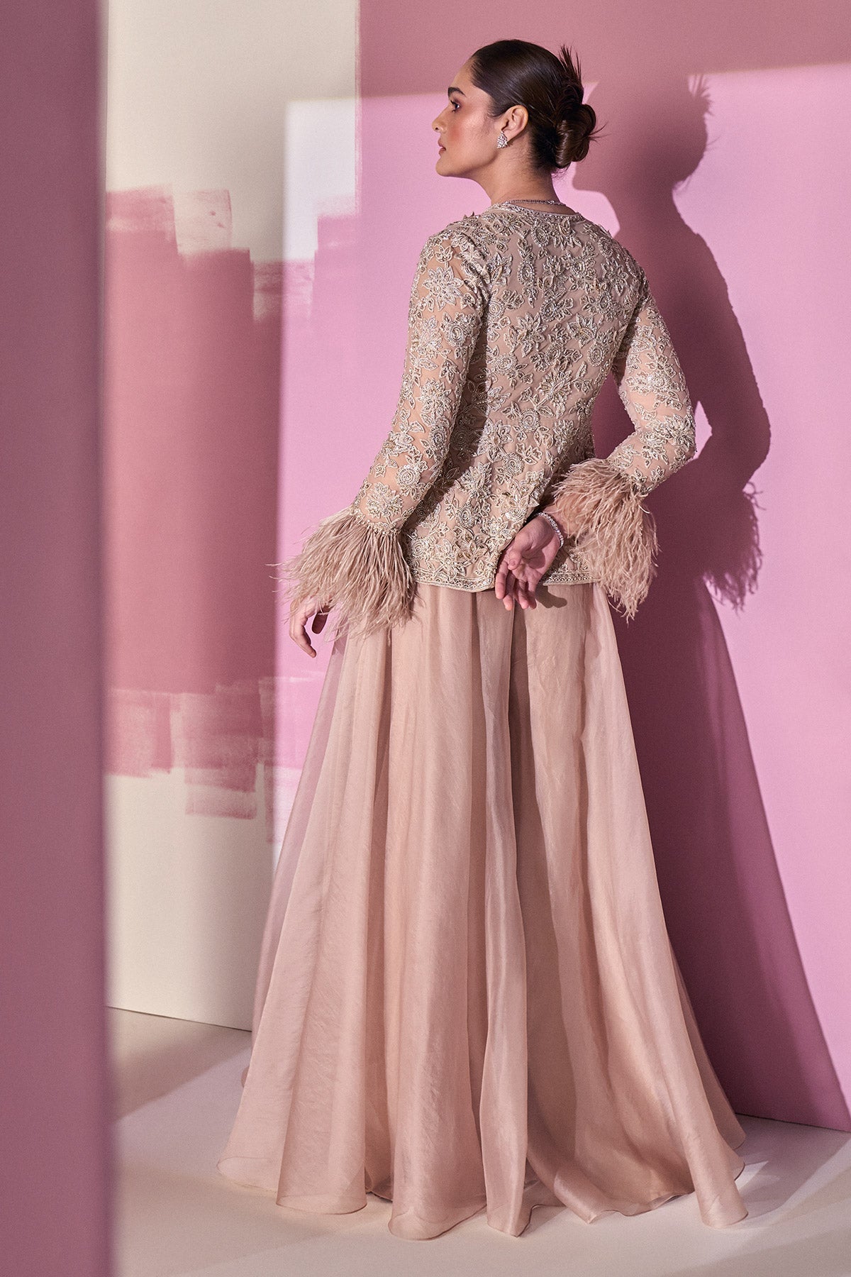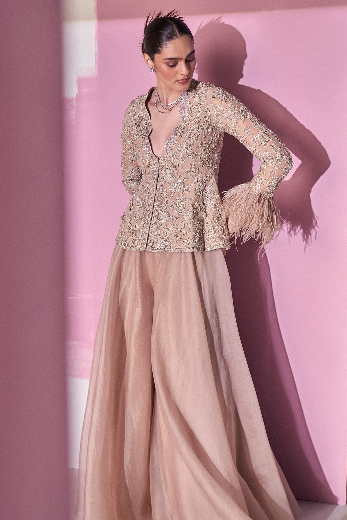 Dark Champagne Net Full Embroidered Peplum With Feathers On Cuff Paired With Organza Flared Sharara