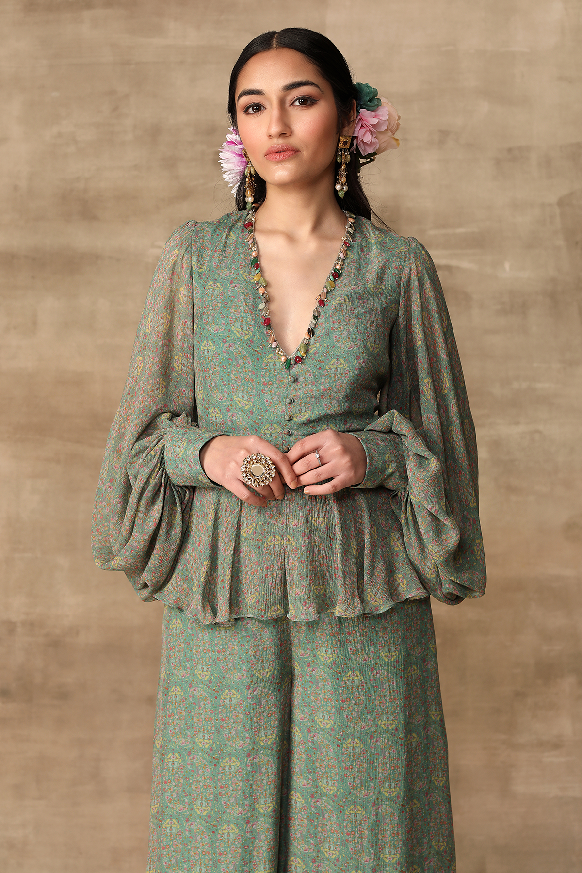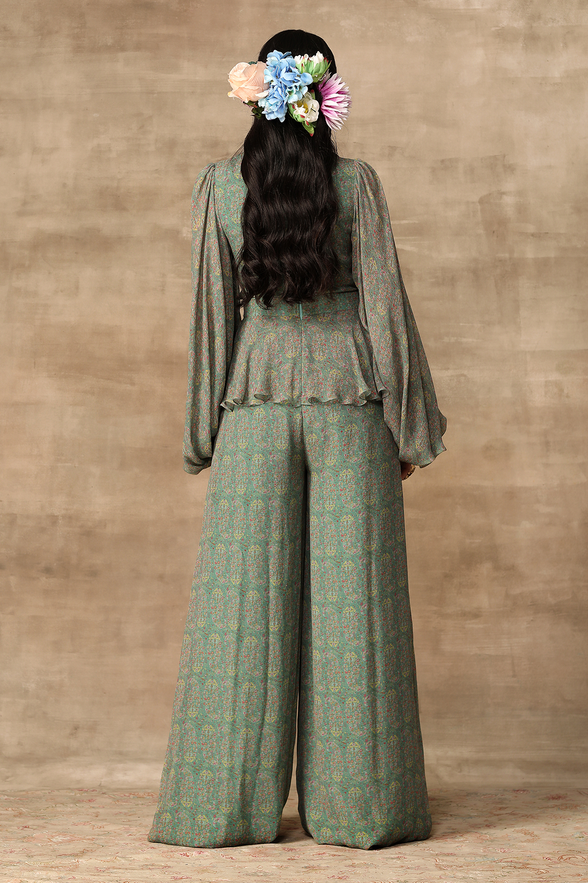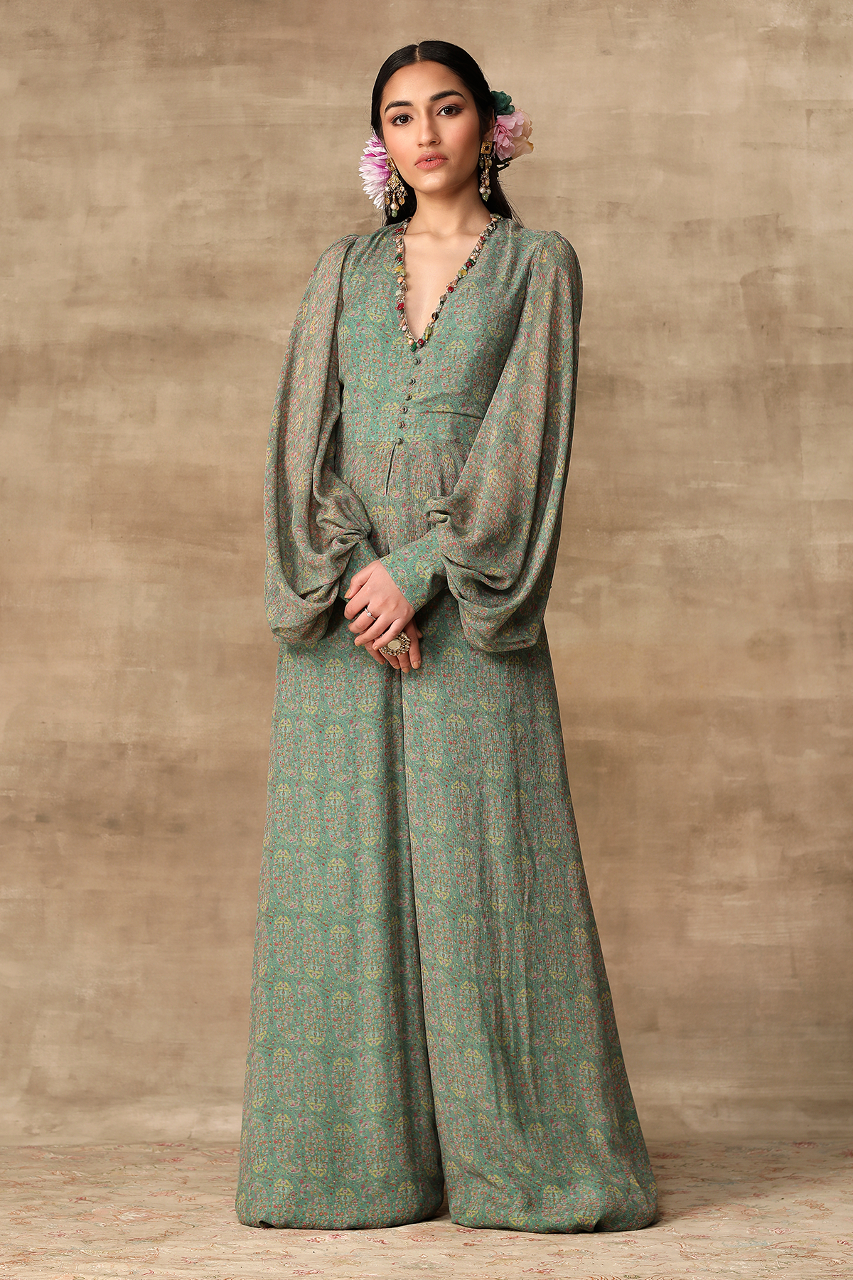 Turquoise paisley printed chiffon peplum jumpsuit with multicolour jewel neckline and exaggerated sleeves.