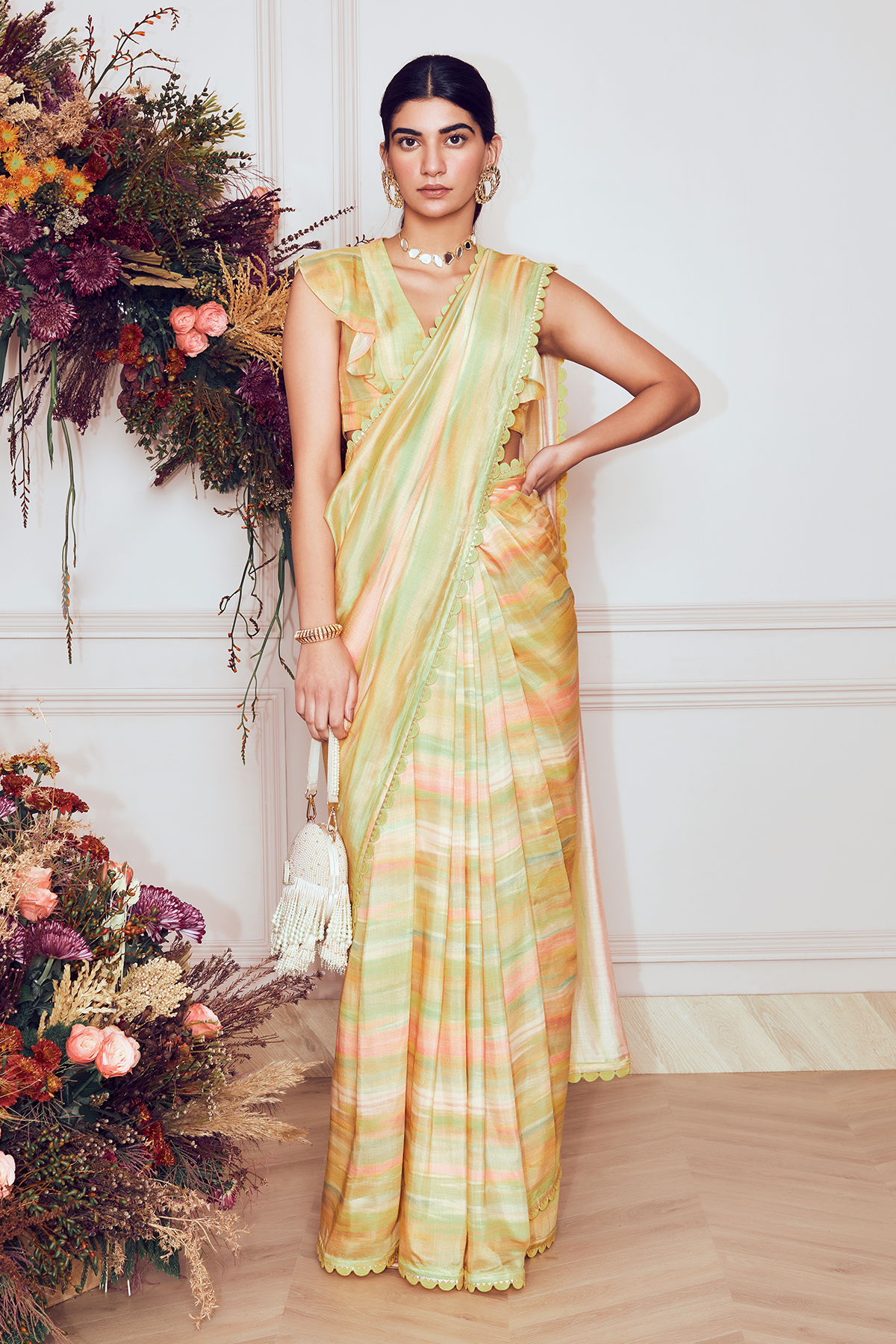 Yellow ombre printed silk saree with frilled sleeveless blouse and crepe petticoat