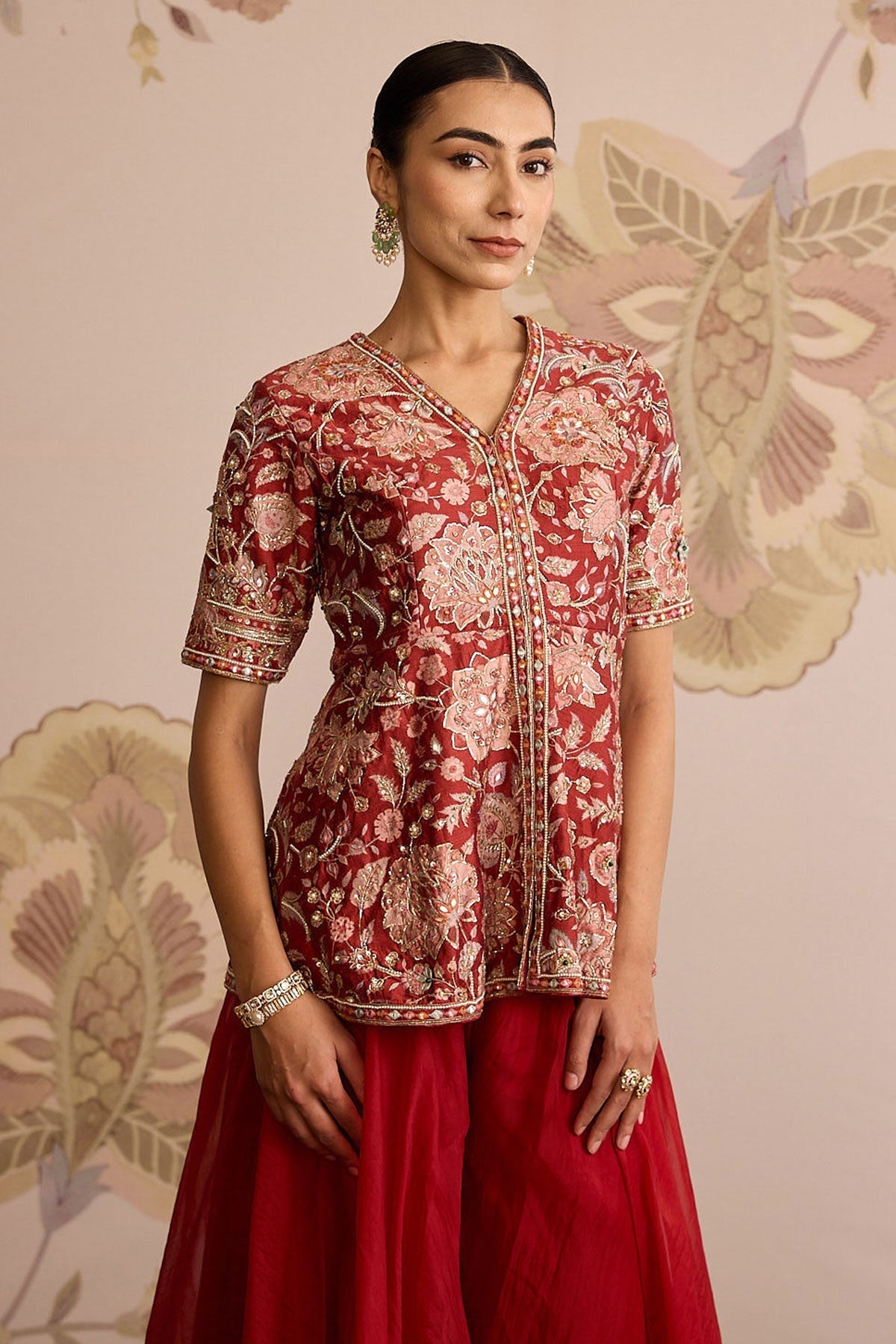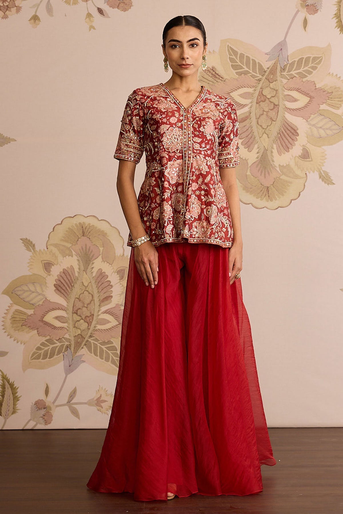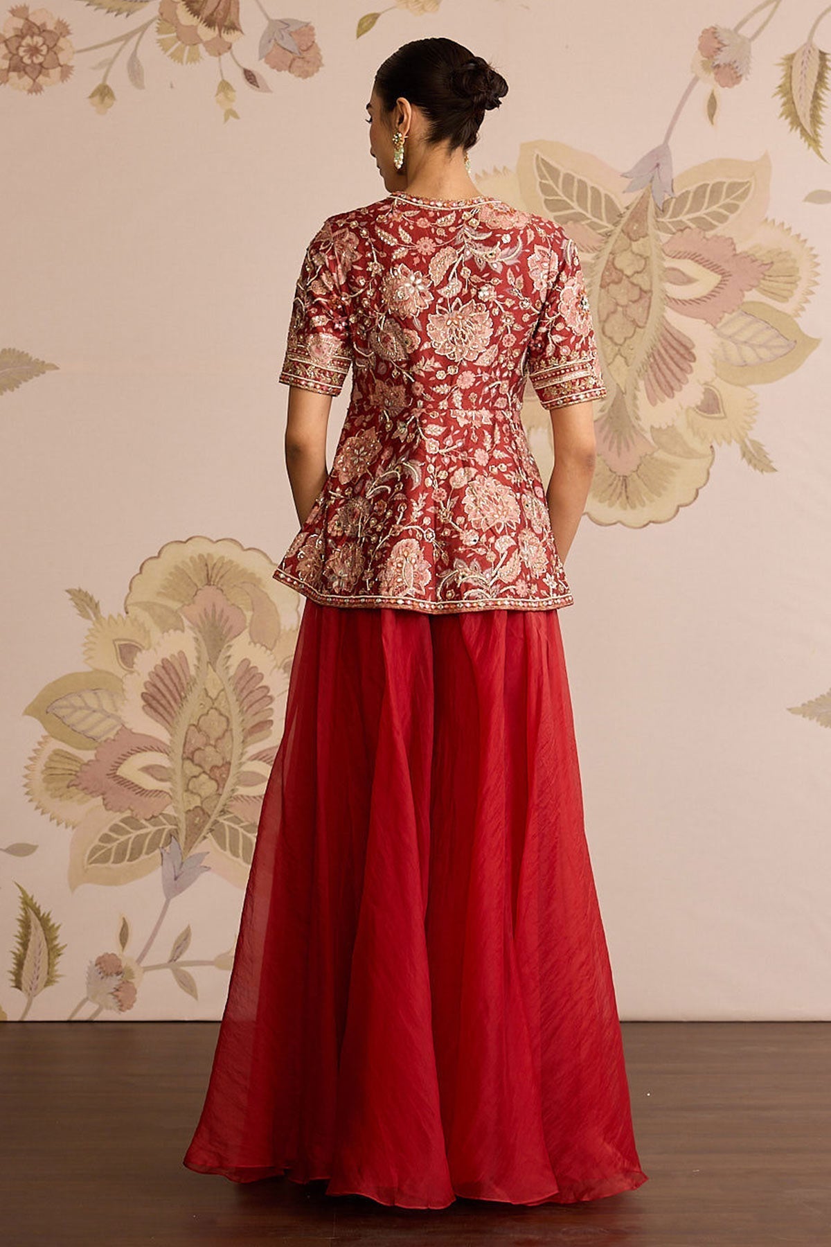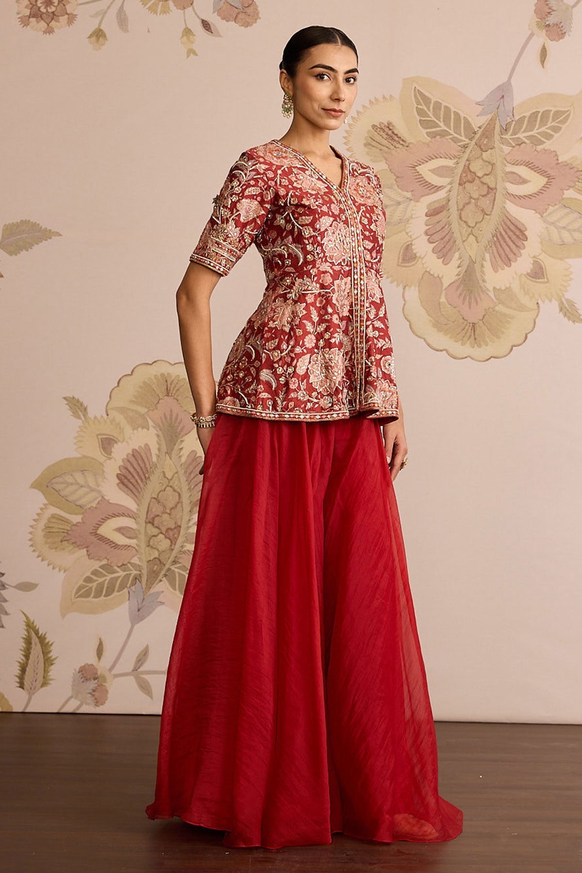 Red Printed Raw Silk Embroidered Peplum With Red Solid Organza Flared Sharara