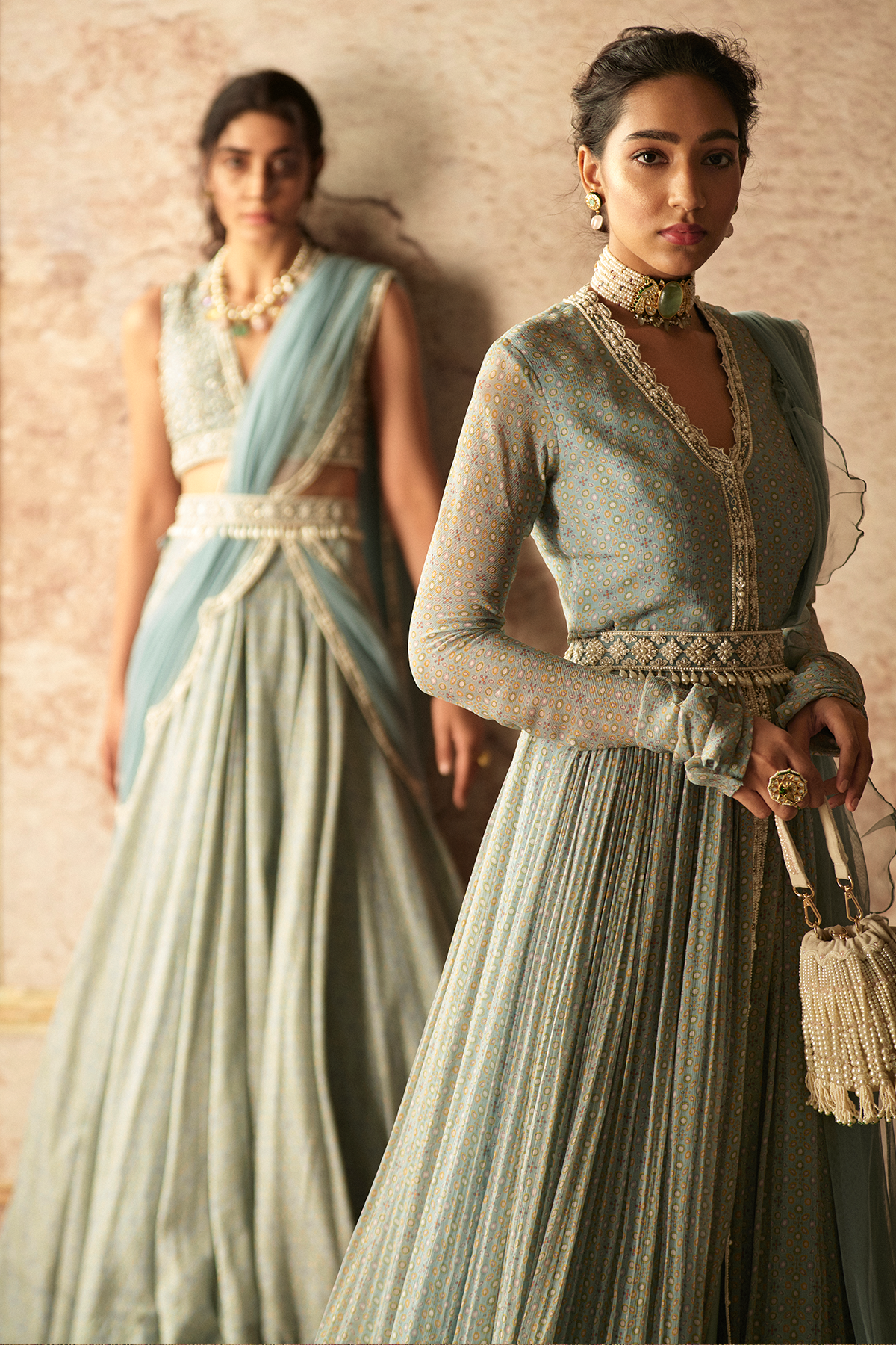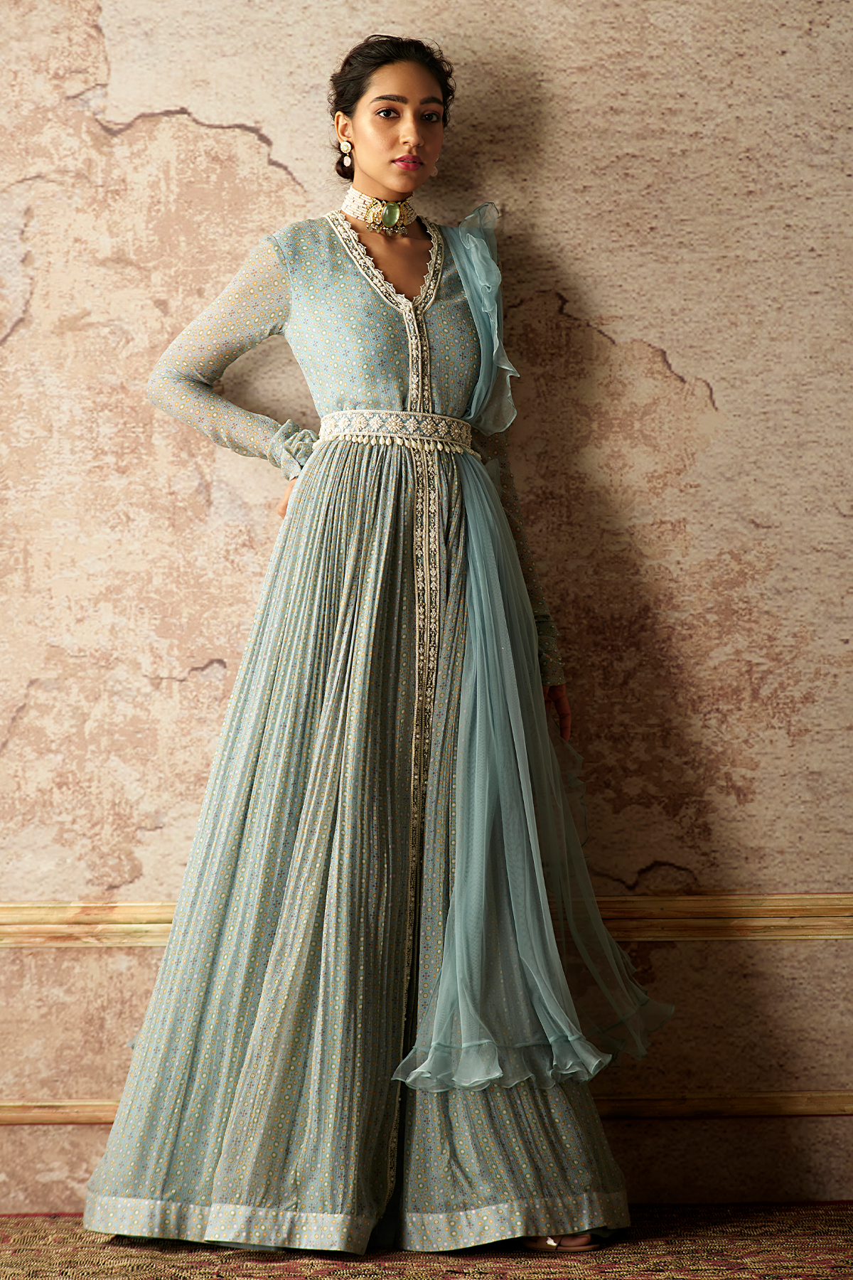 Powder blue folk printed and embroidered anarkali paired with net ruffled dupatta and an embroidered pearl drop belt.