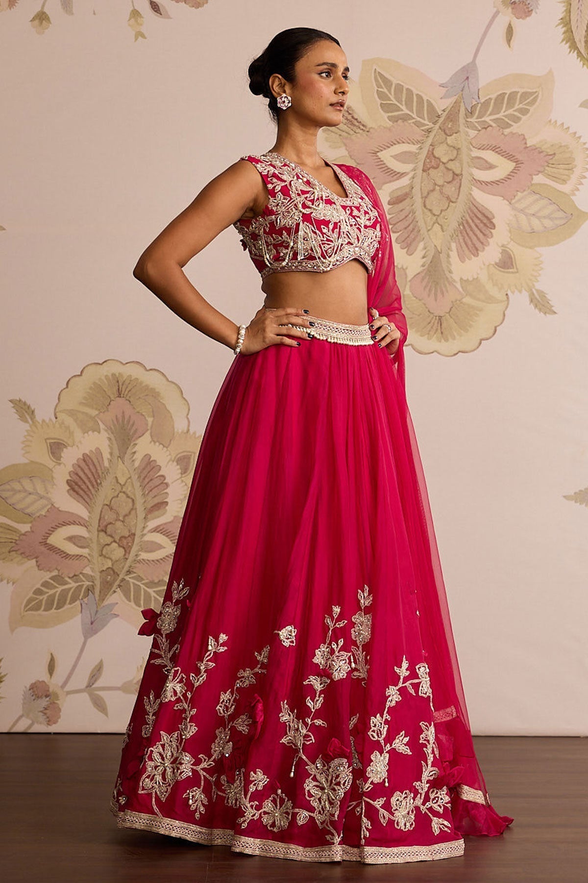 Embroidered organza lehenga with a net blouse and ruffled dupatta