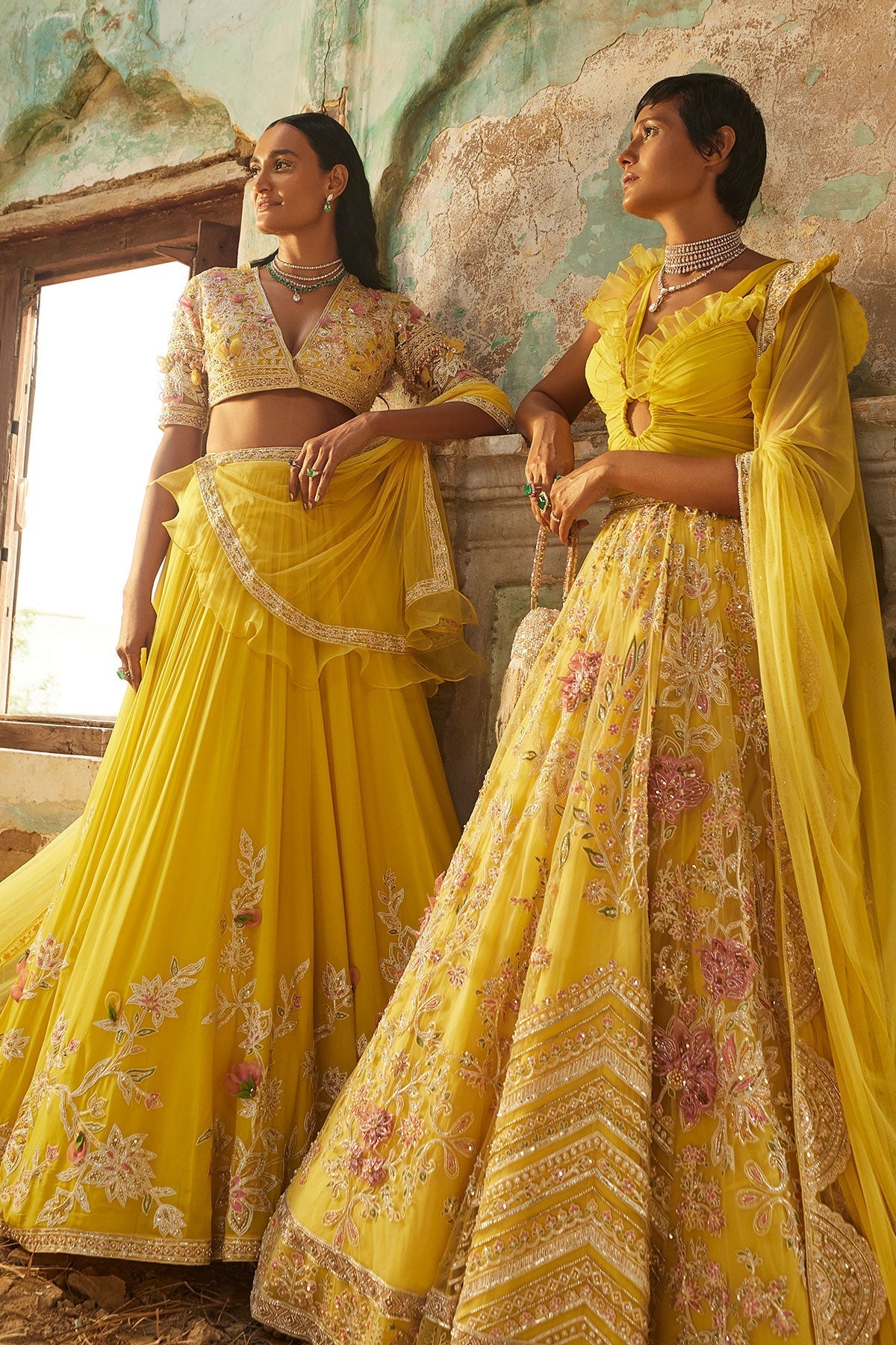 Yellow Georgette Ruffled Bodysuit With Net Embroidered Lehenga And Dupatta