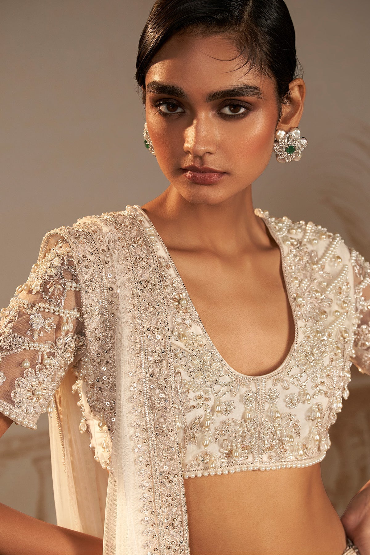 Geometric Ivory Saree Skirt Set ensemble features an intricately embroidered heavy saree, a stylish bustier, and a versatile dupatta. The modern geometric pattern in timeless ivory adds a contemporary flair, perfect for special occasions. The dupatta offers multiple styling options—drape it as a saree or get creative with freestyle draping. Elevate your ethnic wardrobe with this chic set, blending tradition and trend effortlessly.
