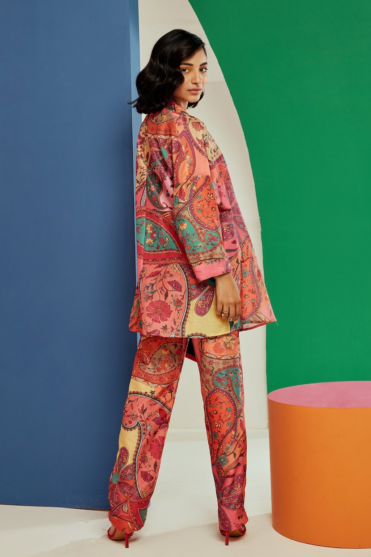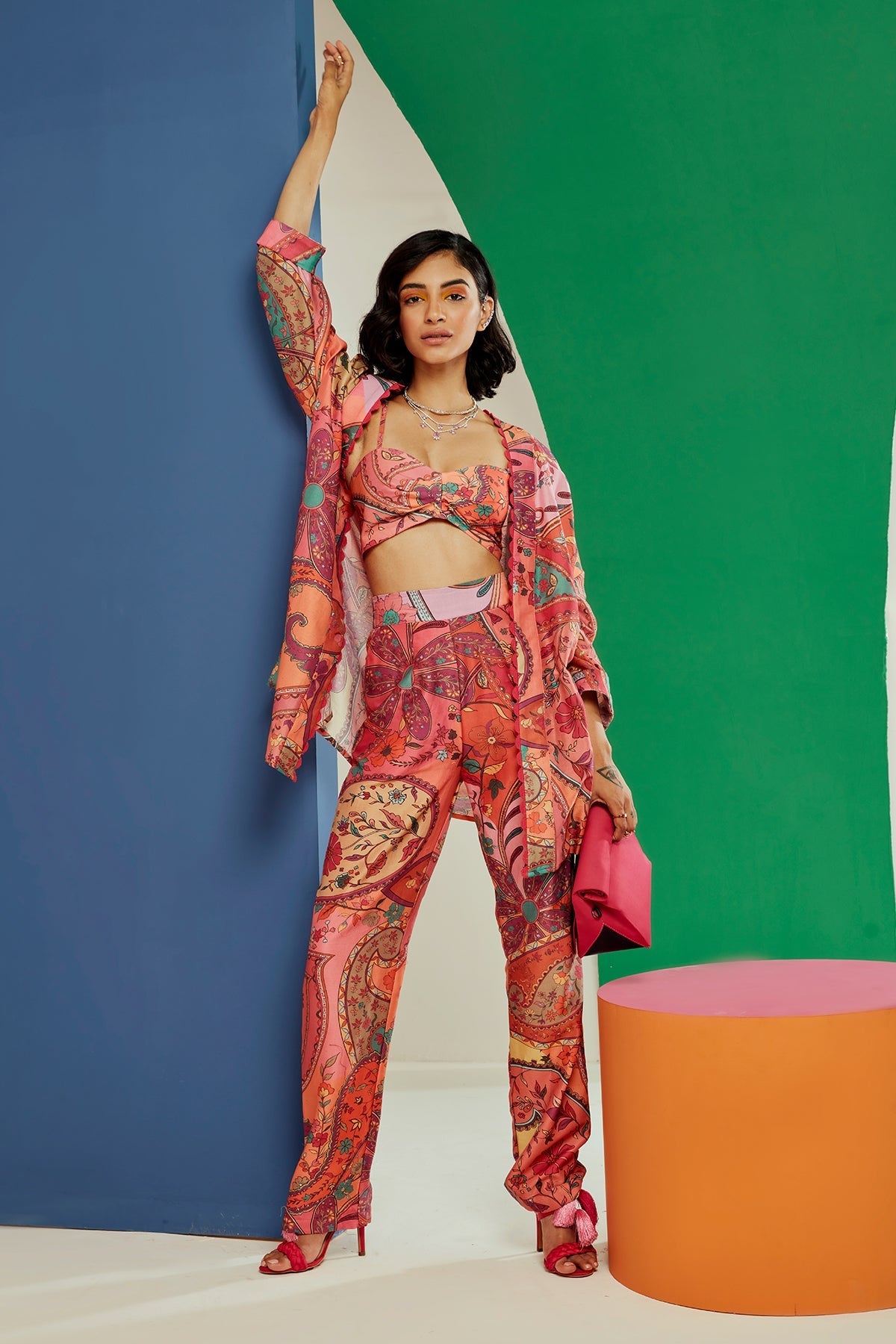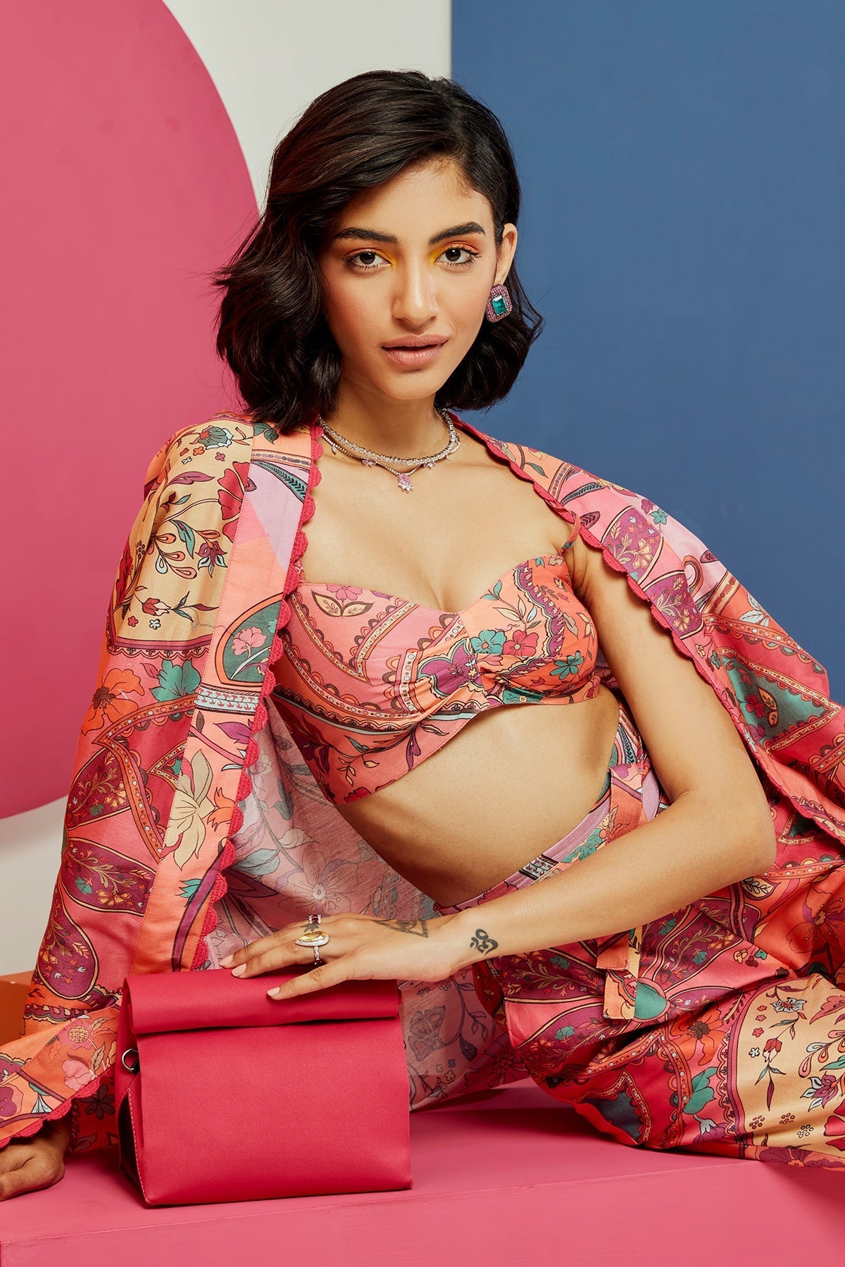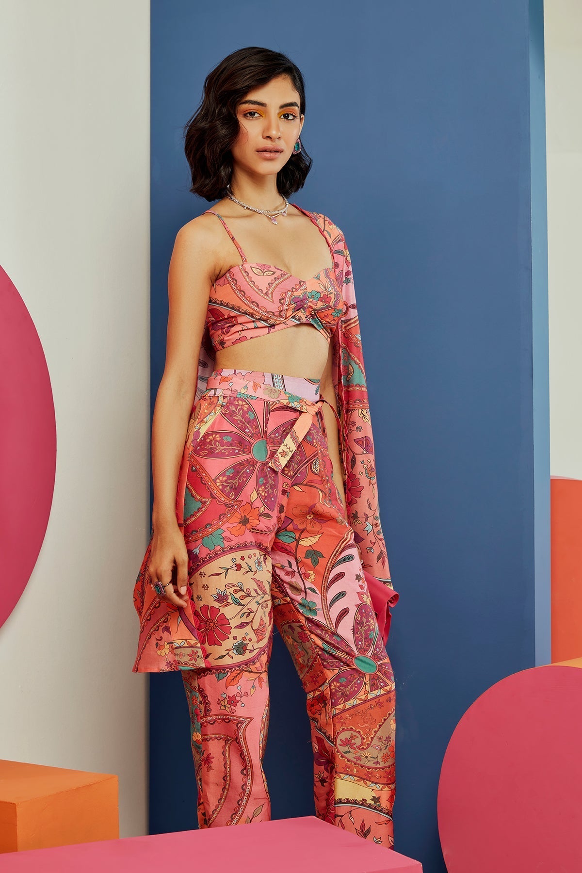 Multicoloured printed cape and bustirer paired with pants and tie up belt.