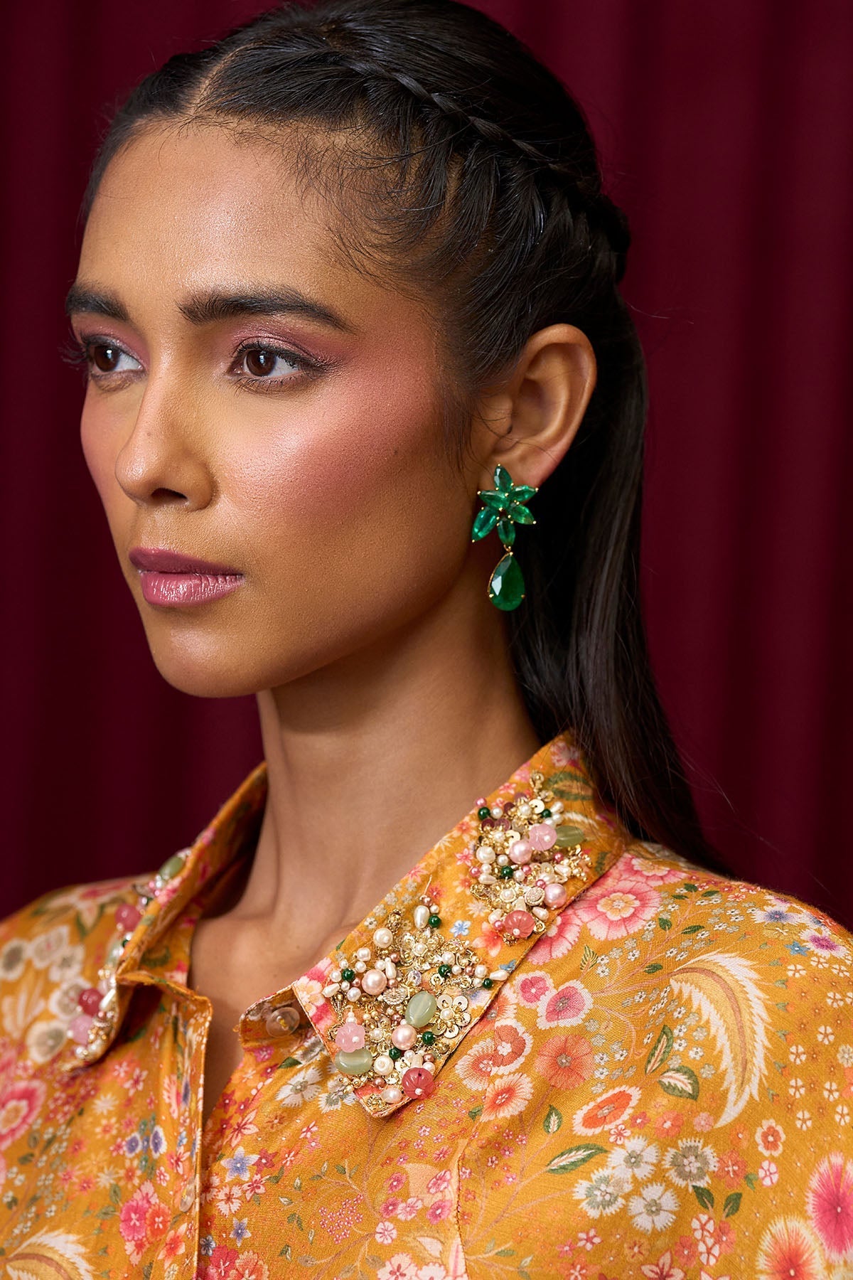Yellow fine silk printed shirt beautifully paired with a skirt.