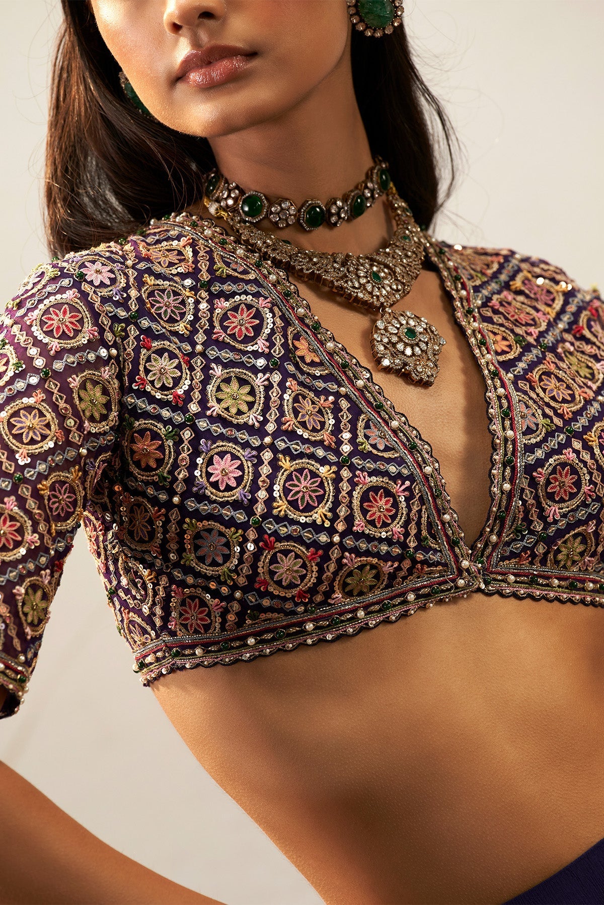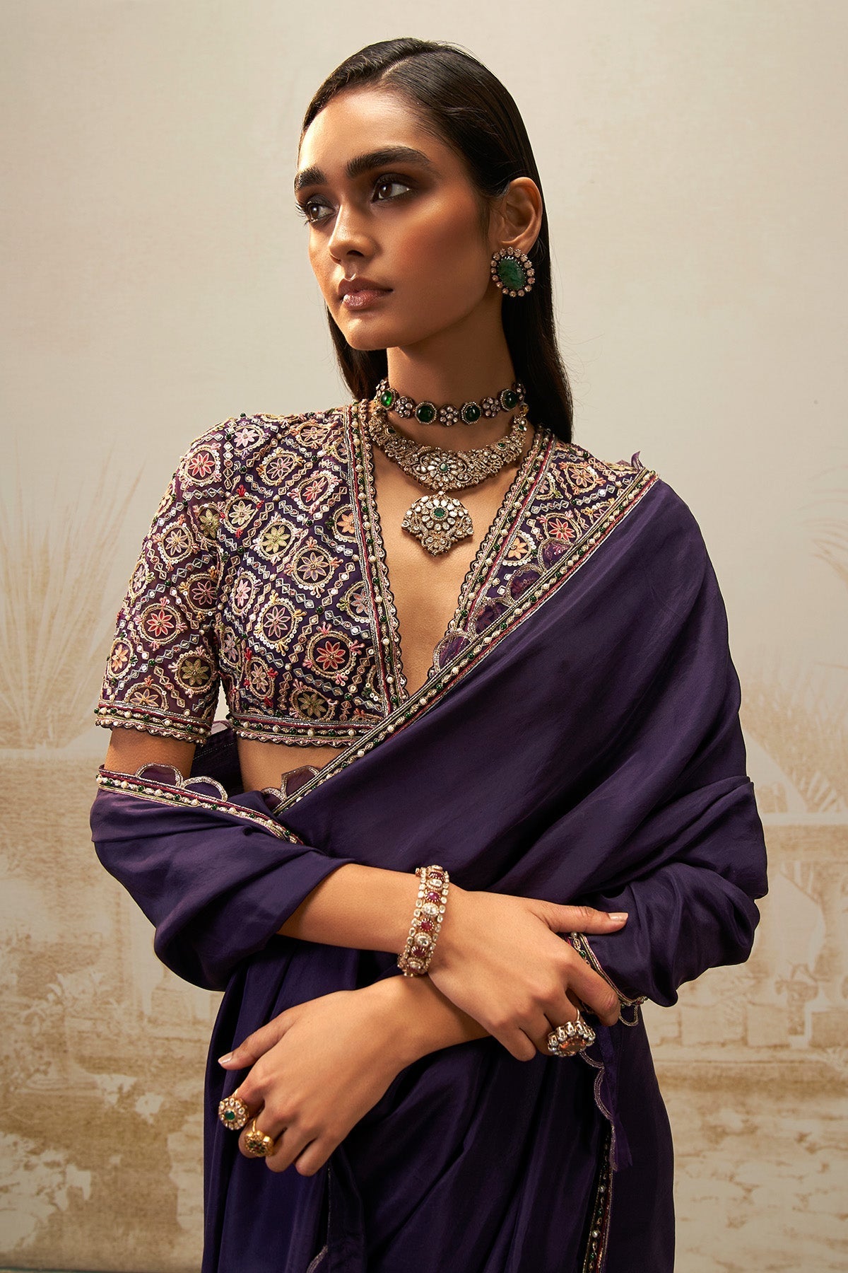 Elevate your ethnic wardrobe with our Purple Geometric Patterns Saree Set – a seamless blend of tradition and trend. This ensemble features a Silk flat saree, petticoat, and a Purple V neck embroidered blouse adorned with vibrant multi-color threadwork. The regal purple hue is versatile for any occasion, while geometric patterns and scalloped detailing bring a modern flair. Effortlessly elevate your style with this chic saree set.