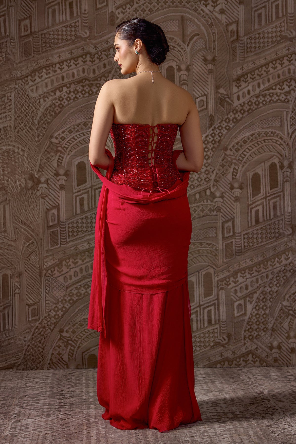 Net Embroidered Corset Paired With Chiffon Draped Saree Skirt And Chiffon Thin Dupatta