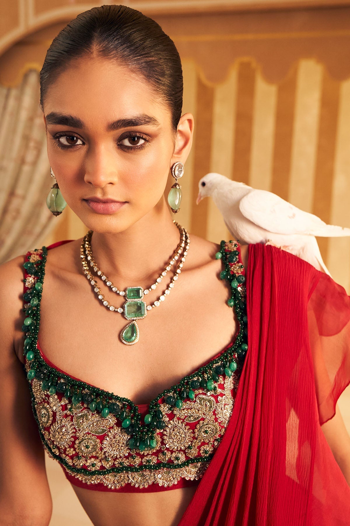 Red Net Embroidered Sleeveless Blouse With Chiffon Drape Saree and Organza Ruffle