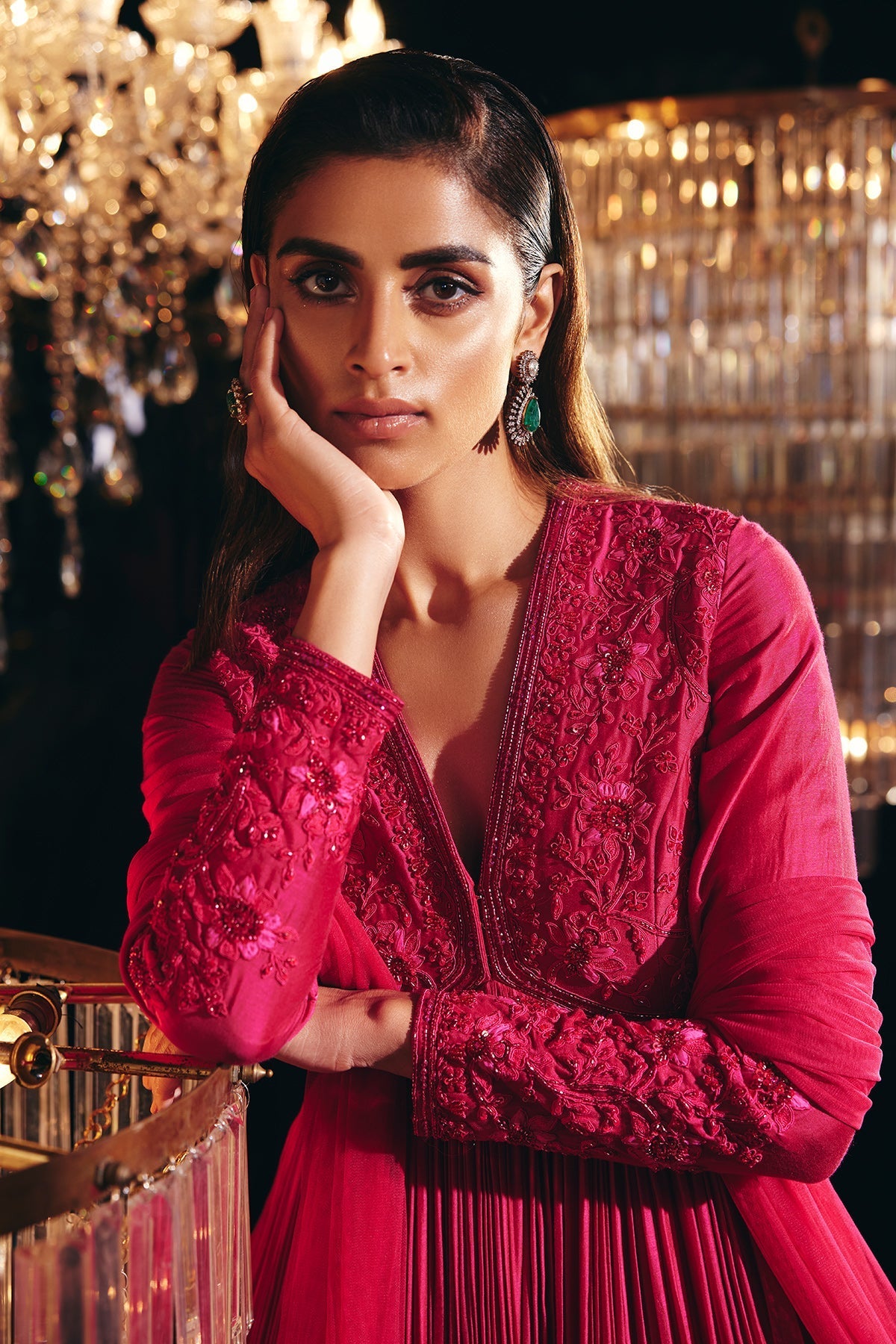 Deep fucshia thread embroidered long anarkali paired with net dupatta two side borders