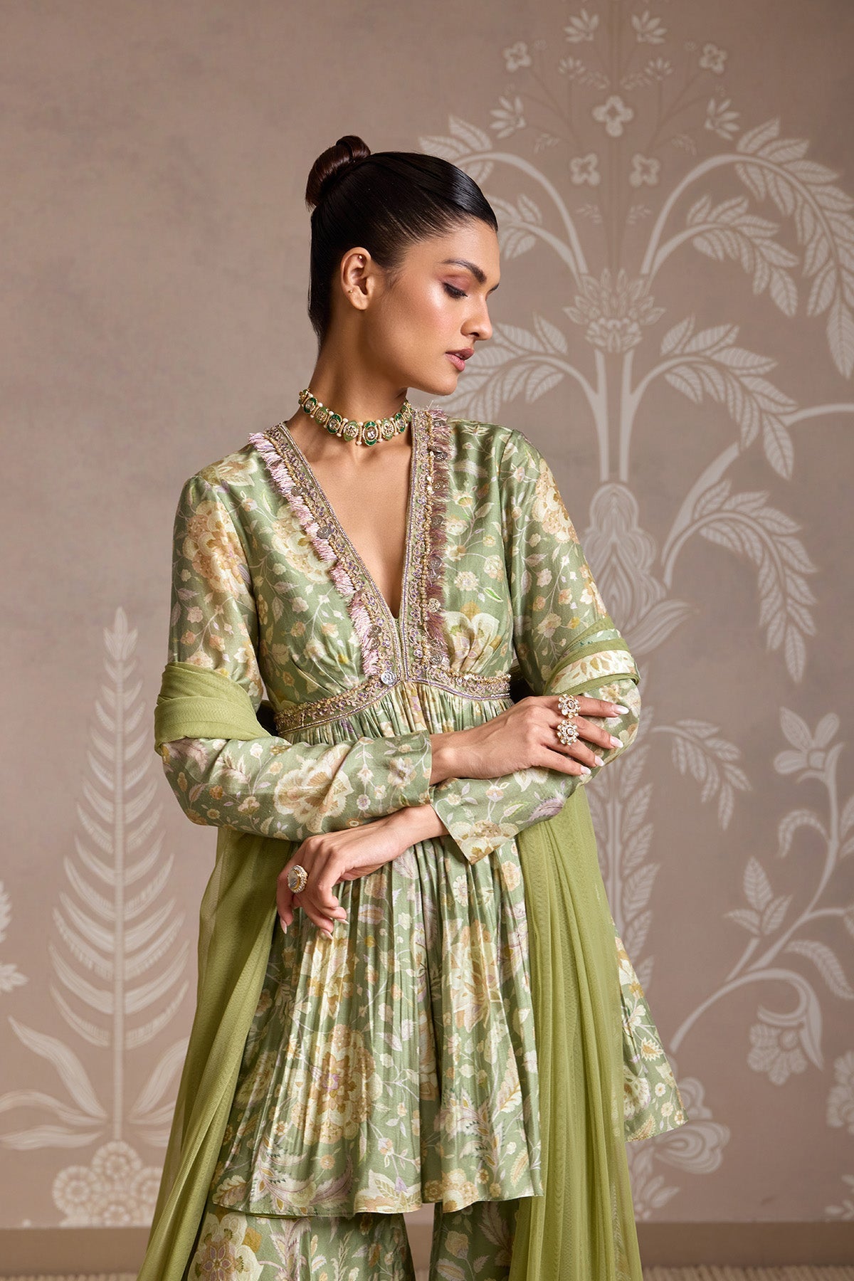 Placement Embroidered Printed Fine Silk Short Anarakali and Garara with Net Dupatta with Four Side Printed Border