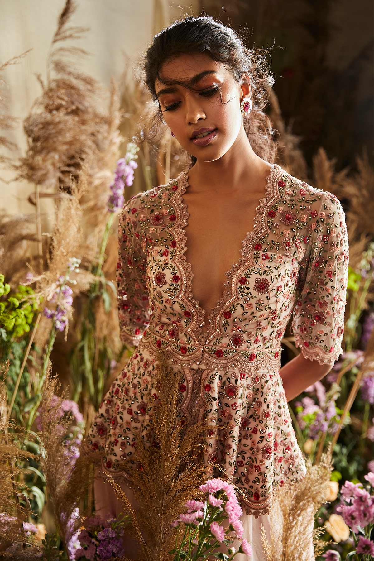 Multicolor Floral Embroidered peplum with Organza Sharara