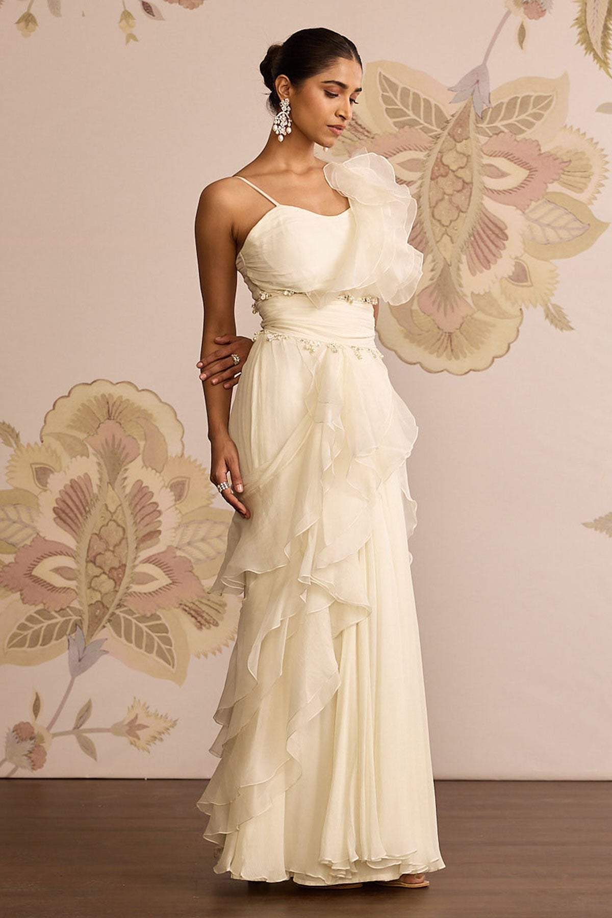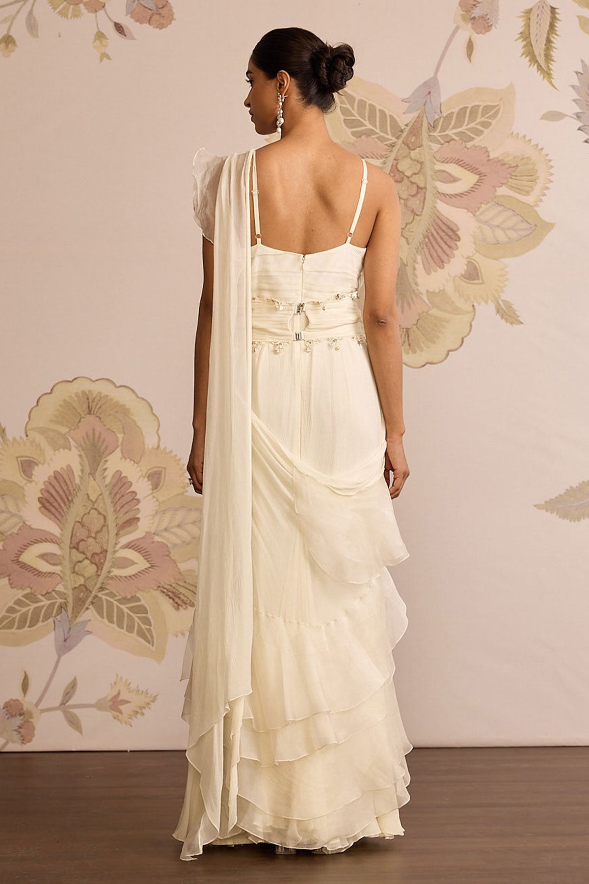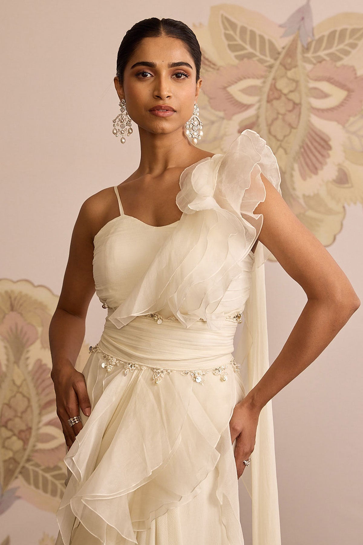Ivory Super Ruffle Saree Gown With Embroidered Rushing Belt