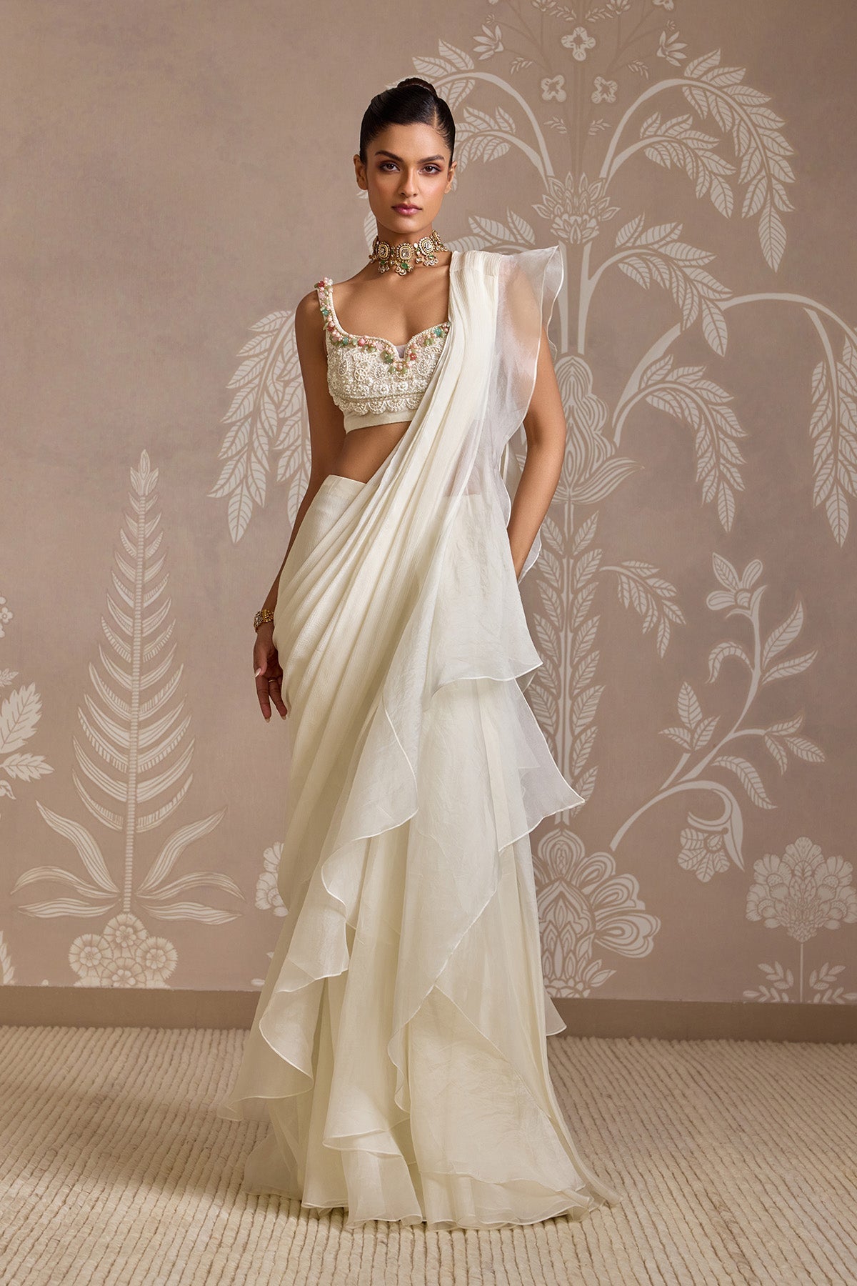 Placement Embroidered Sleeveless Raw Silk Blouse and Chiffon Drape Saree with Organza Ruffle