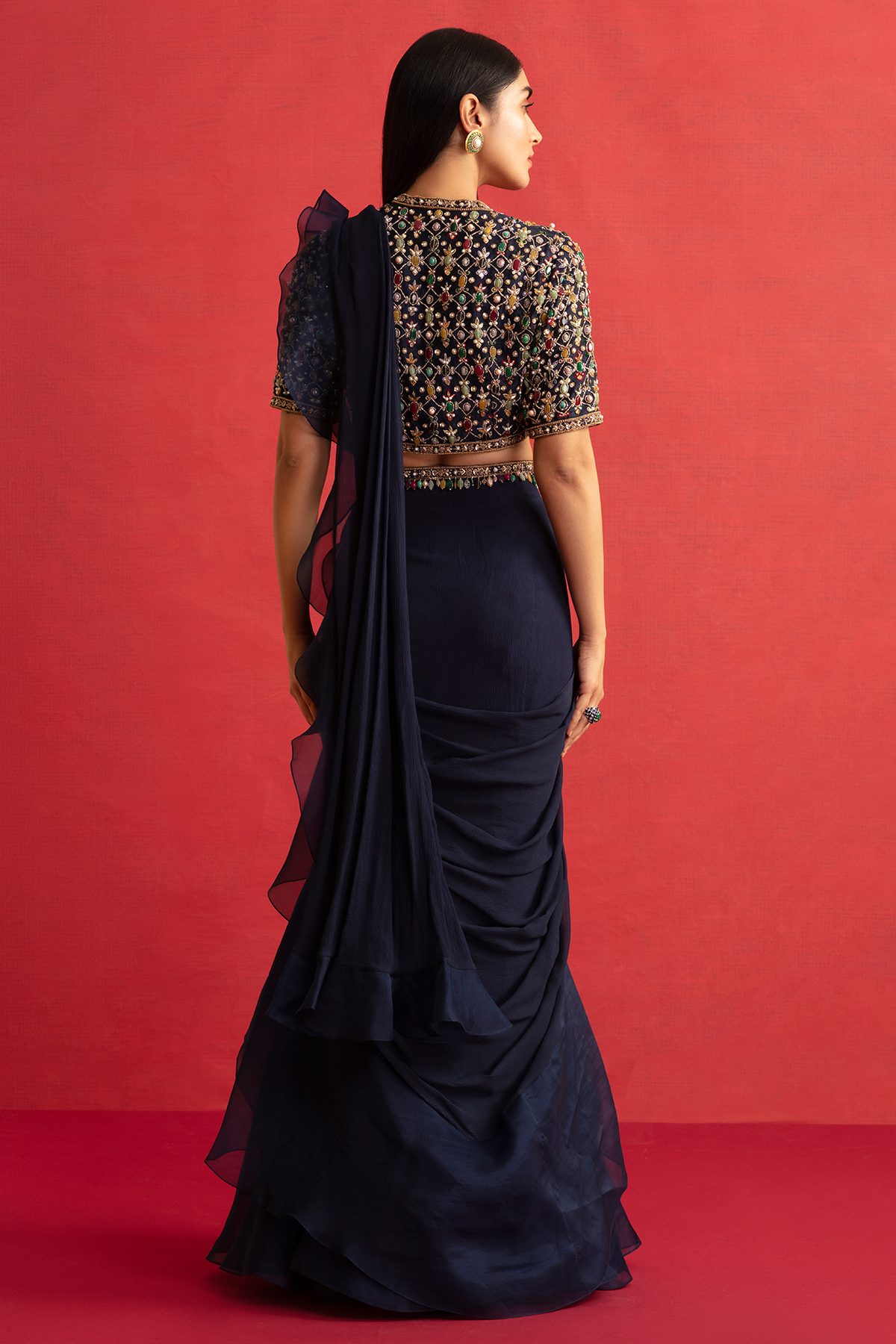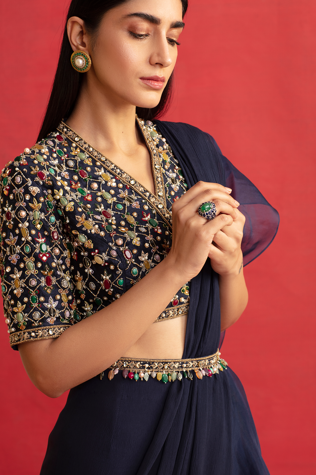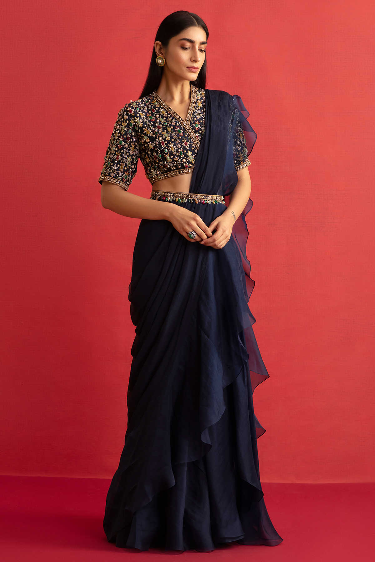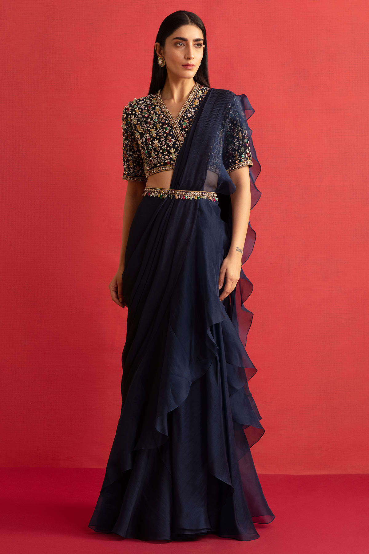 Navy raw silk jeweled embroidered blouse and chiffon-organza draped ruffle saree paired with embroidered belt.