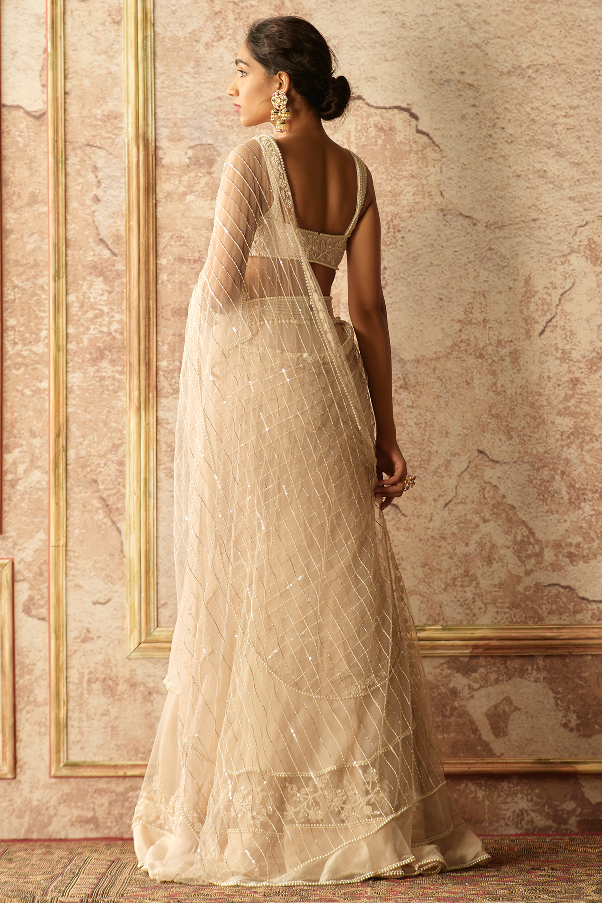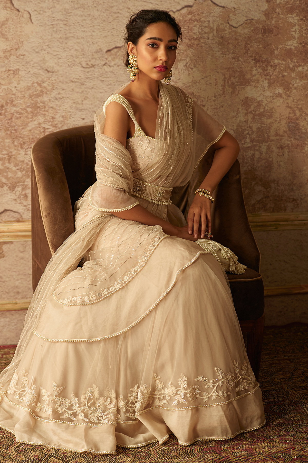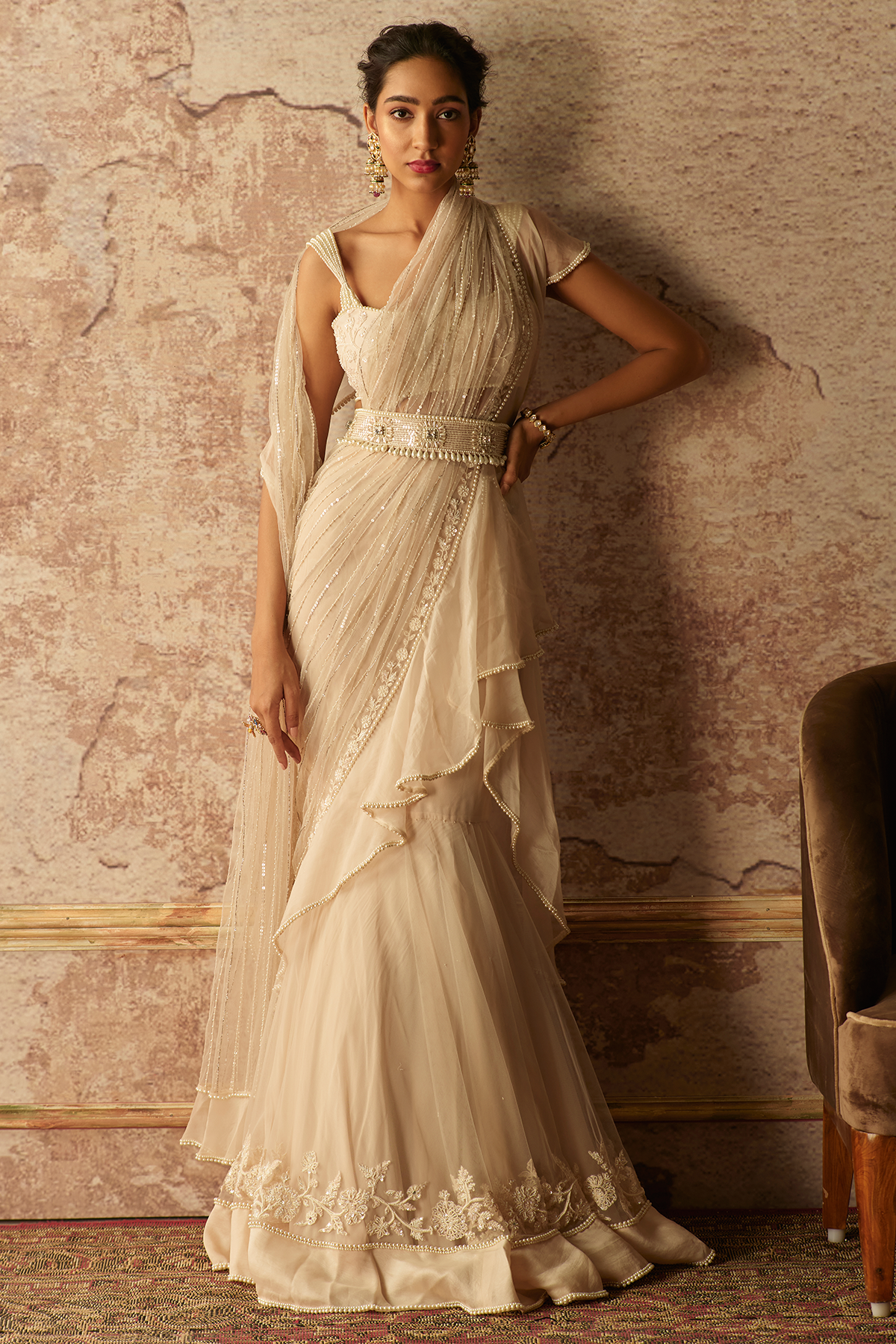 Dirty ivory net embroidered blouse and draped ruffle saree paired with pearl embroidered belt.