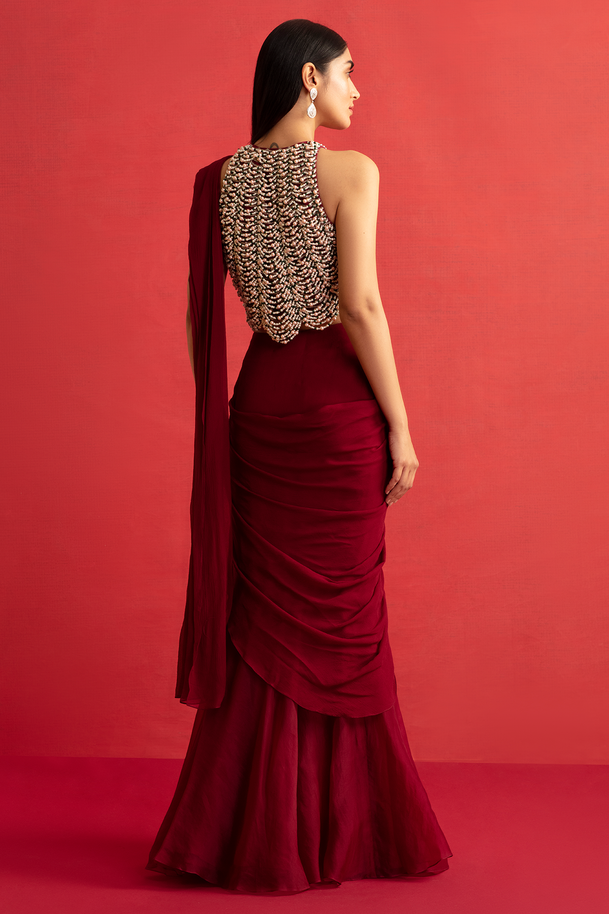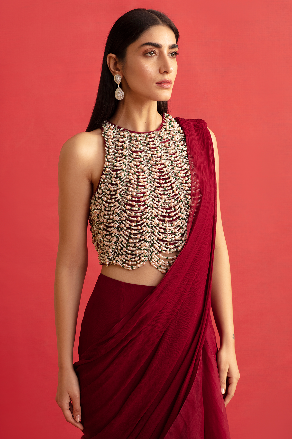 Pearl embellished blouse paired with a maroon draped chiffon saree