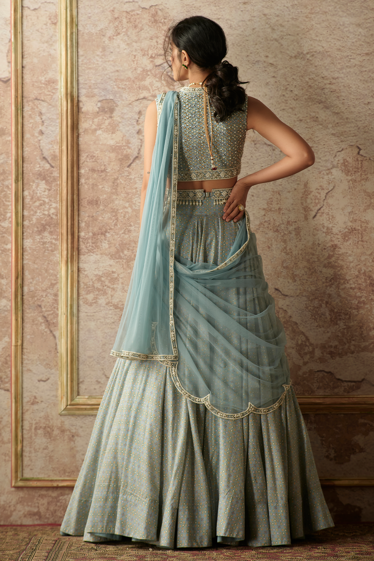 Powered Blue folk printed embroidered skirt and blouse paired with embroidered dupatta and pearl embroidered belt.