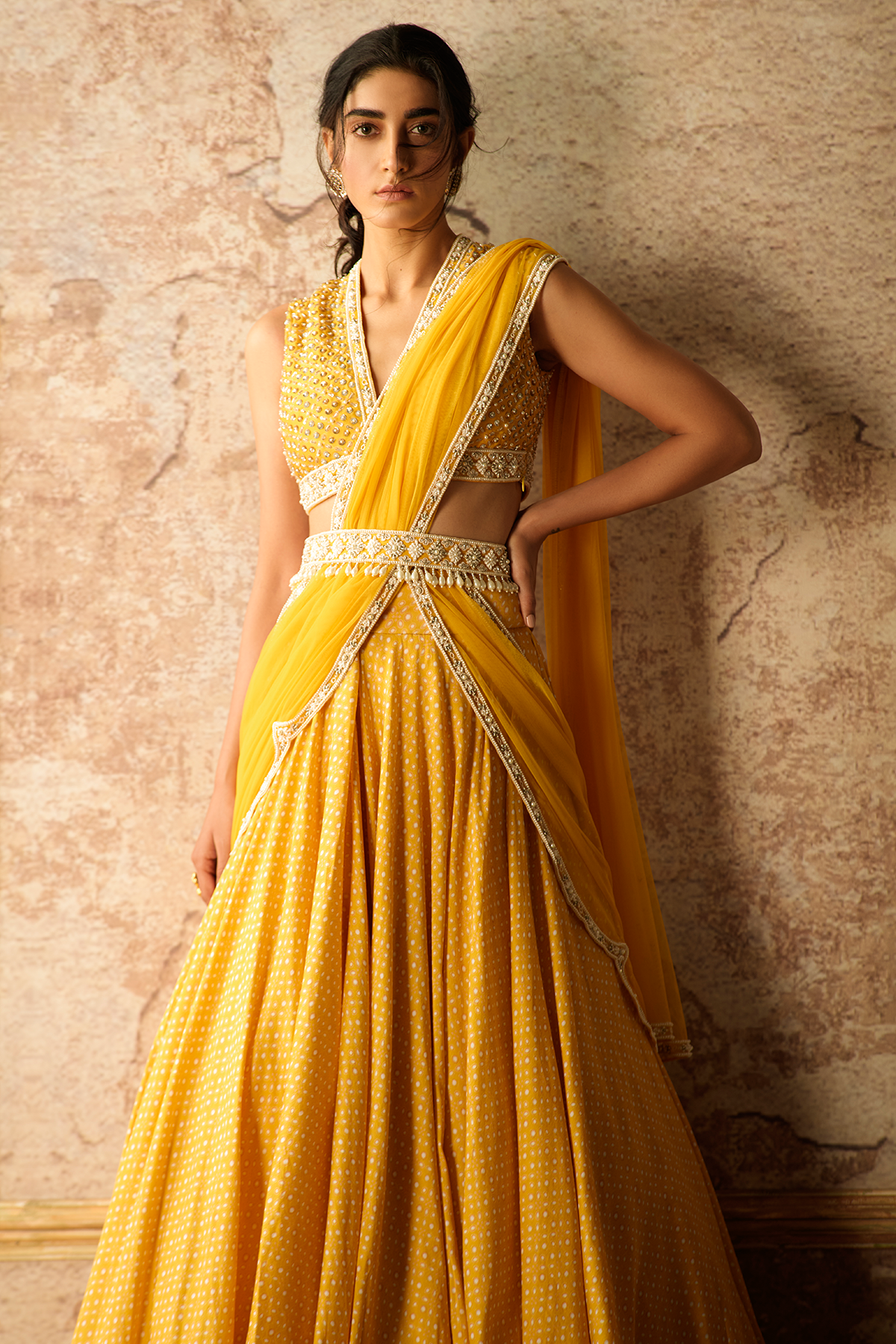 Golden yellow folk printed embroidered skirt and blouse paired with embroidered dupatta and pearl embroidered belt.