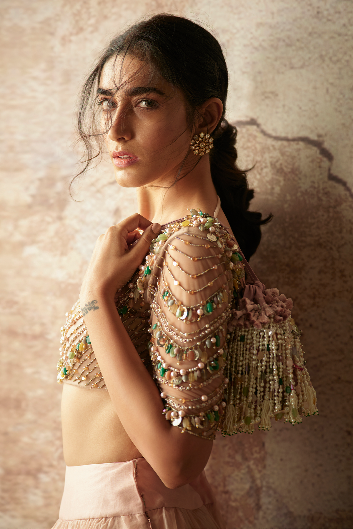 Jewelled champagne blouse paired with a peach organza skirt and an embroidered dupatta.