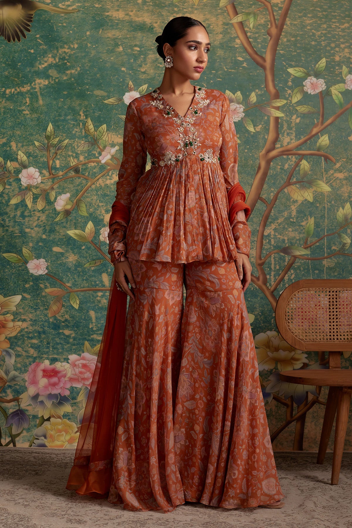 Make a style statement with our peplum sharara set, featuring a printed chiffon peplum paired seamlessly with a printed chiffon gharara and a graceful net dupatta. the yoke of the peplum is adorned with exquisite floral threadwork, pearls, and green crystals, adding a touch of elegance to the ensemble. perfect for special occasions and festive celebrations, this set effortlessly blends comfort with contemporary design. the lightweight chiffon and the thoughtful detailing make it an ideal choice for those who appreciate both style and tradition. elevate your ethnic wardrobe with this stunning peplum sharara set that promises to turn heads at every event.