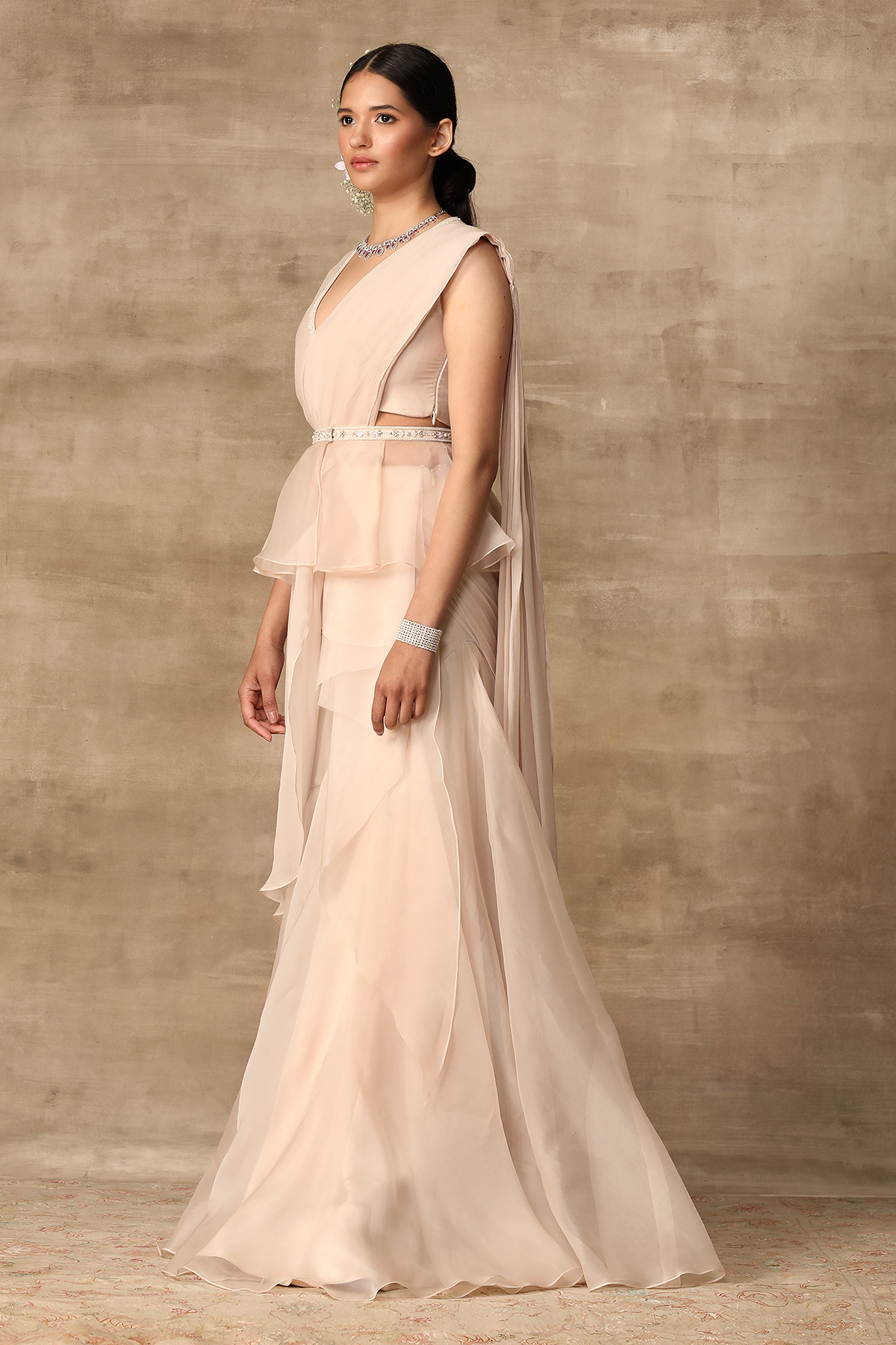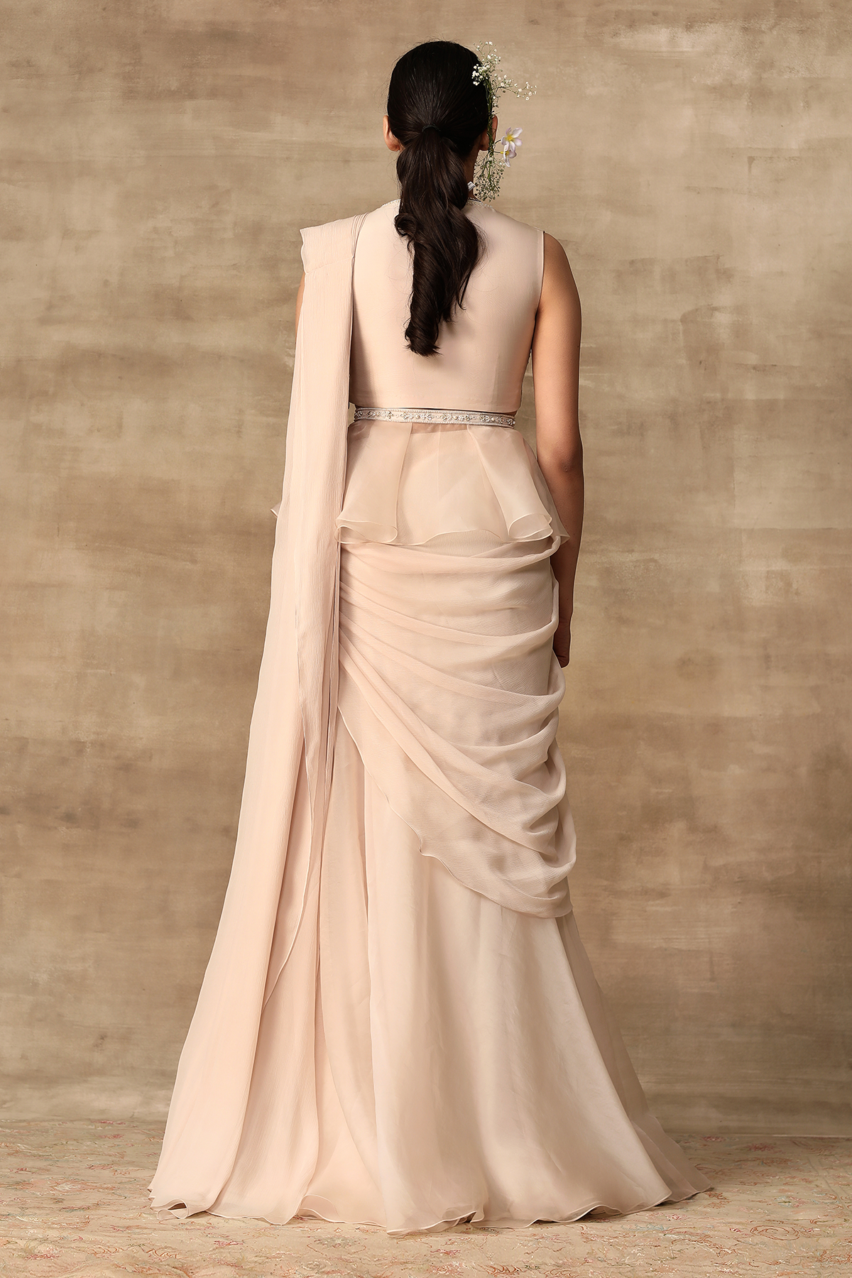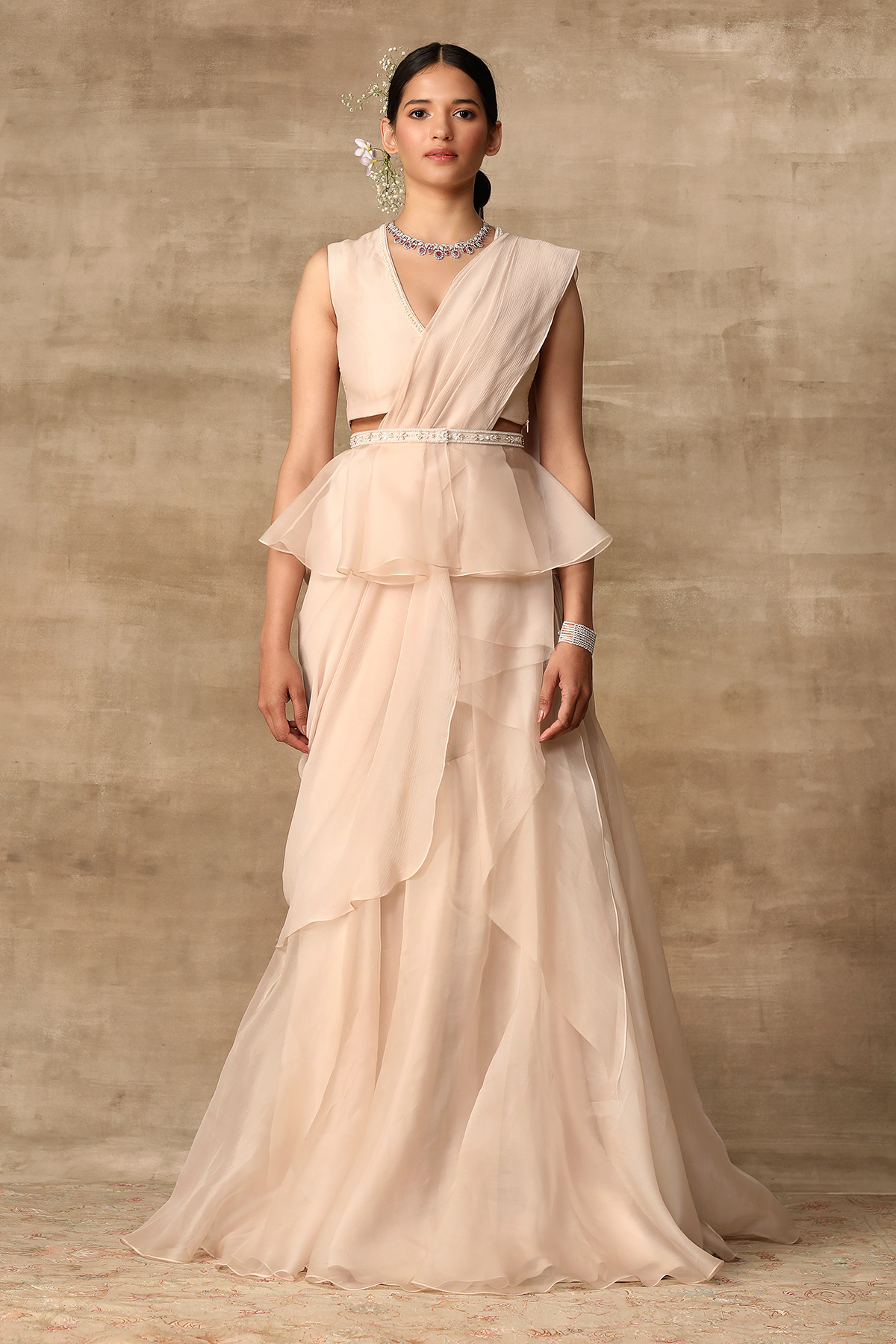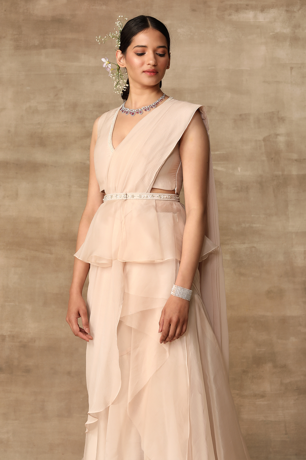 Dirty ivory pearl detailed organza blouse and chiffon-organza draped ruffle saree paired with pearl embroidered organza peplum belt.