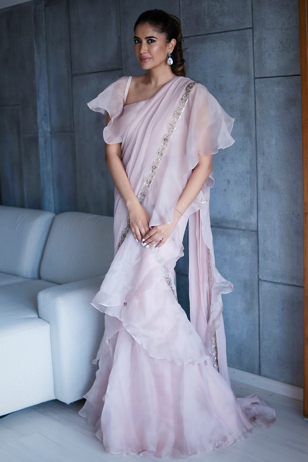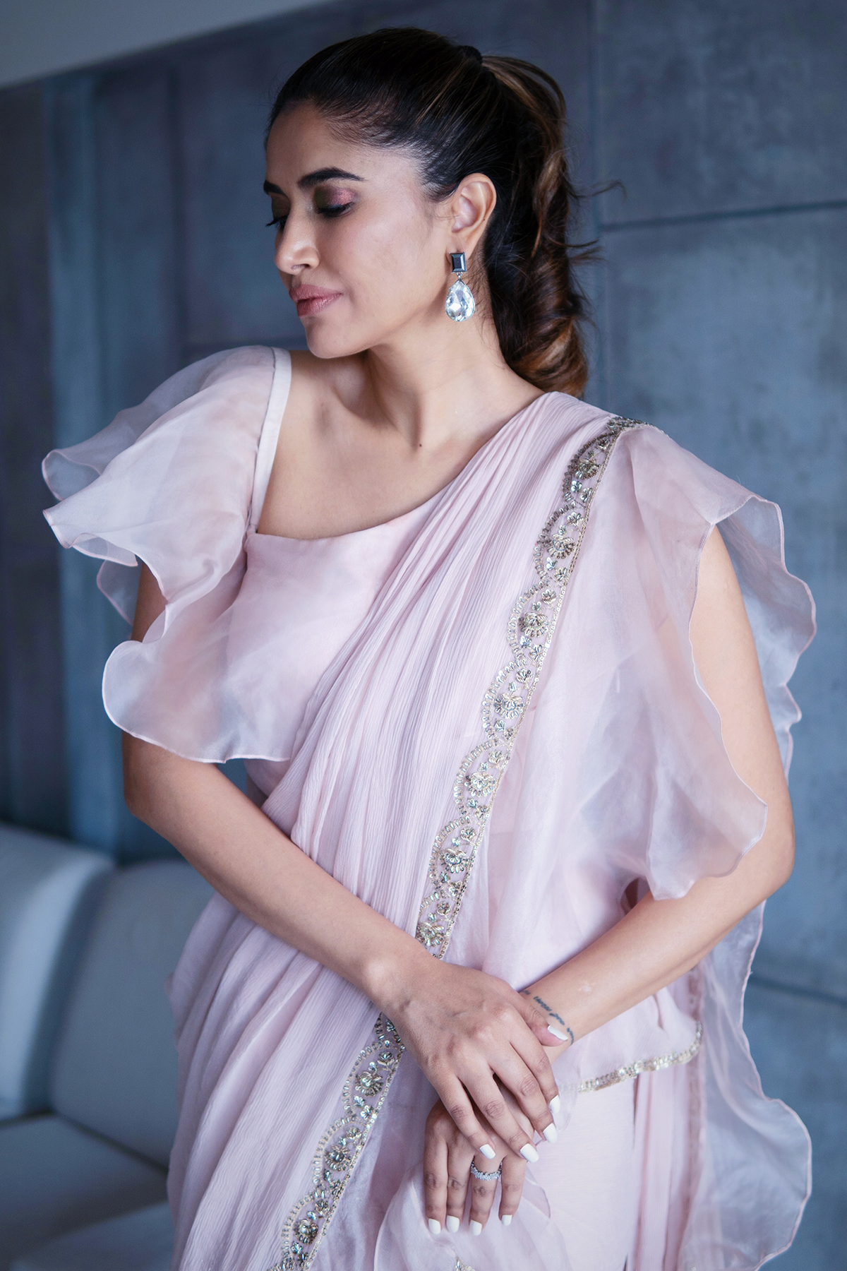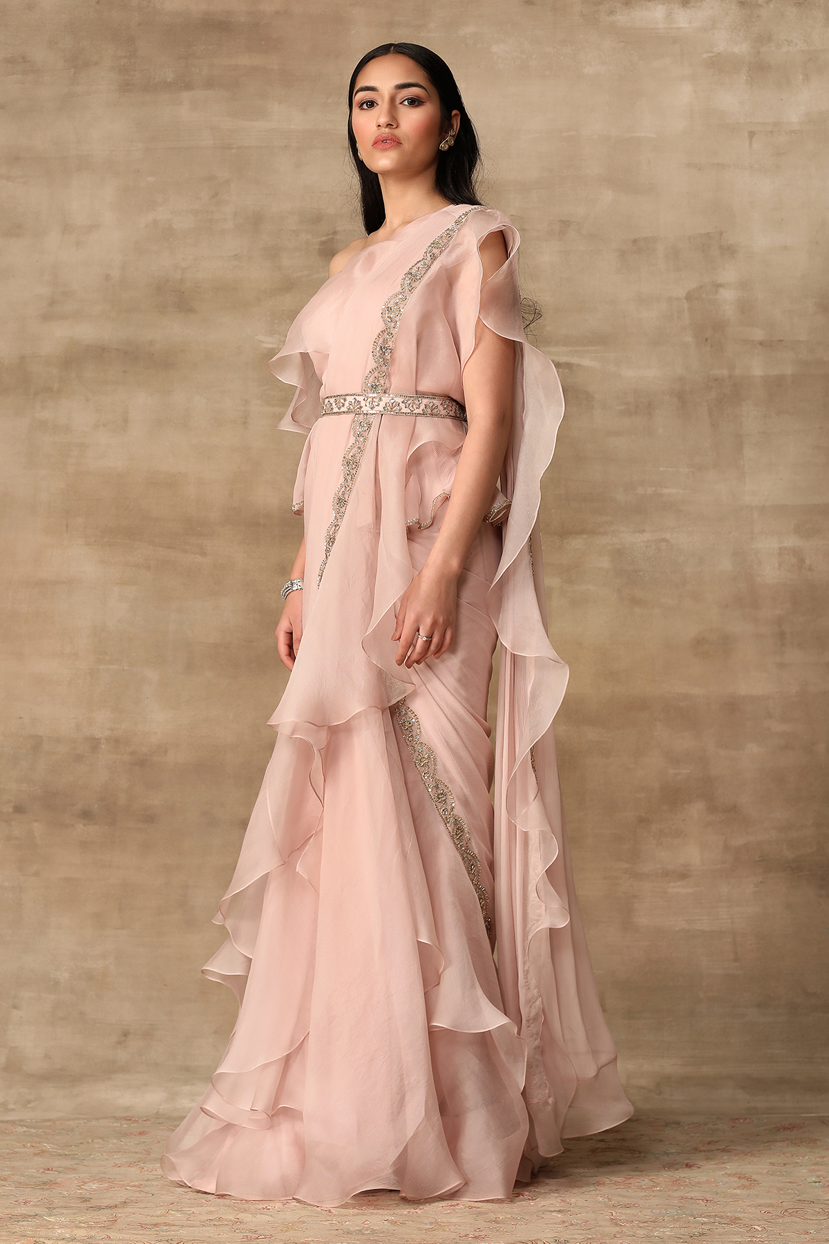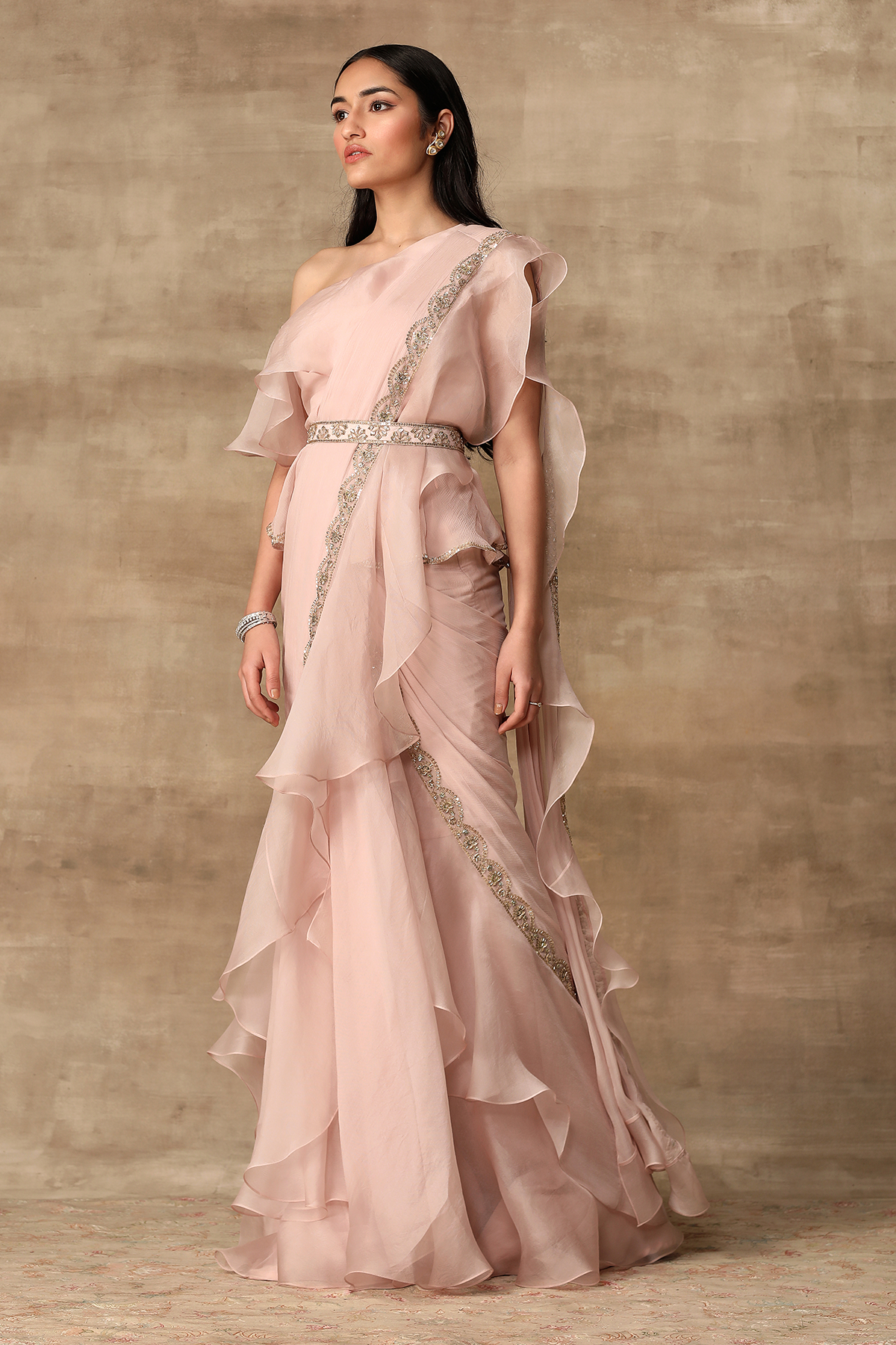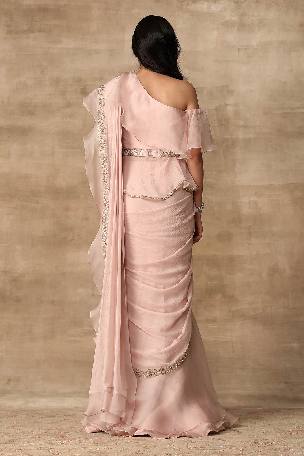 Blush pink off-shoulder sequin detailed chiffon-organza peplum and chiffon-organza draped ruffle saree paired with an embroidered belt.