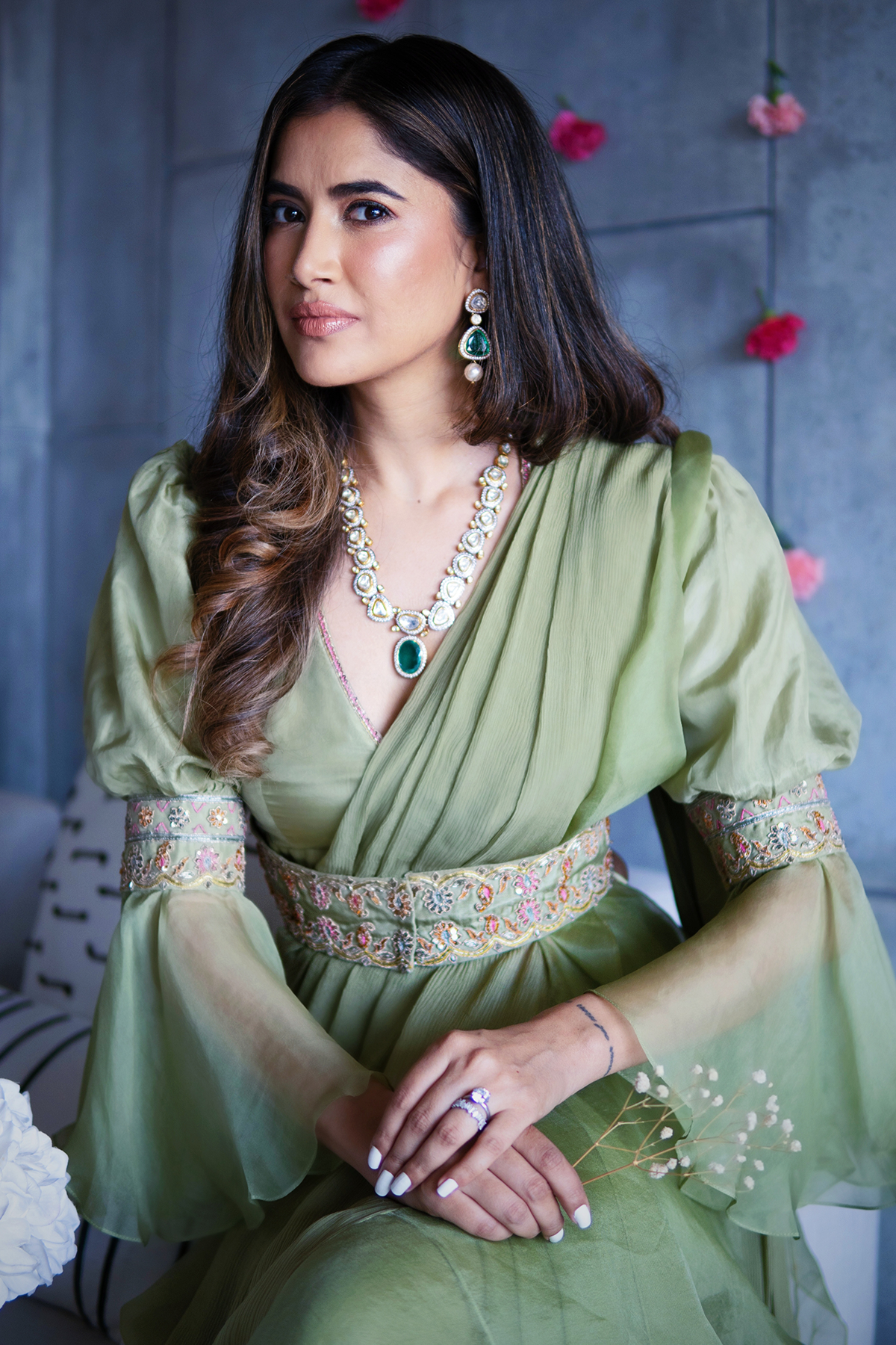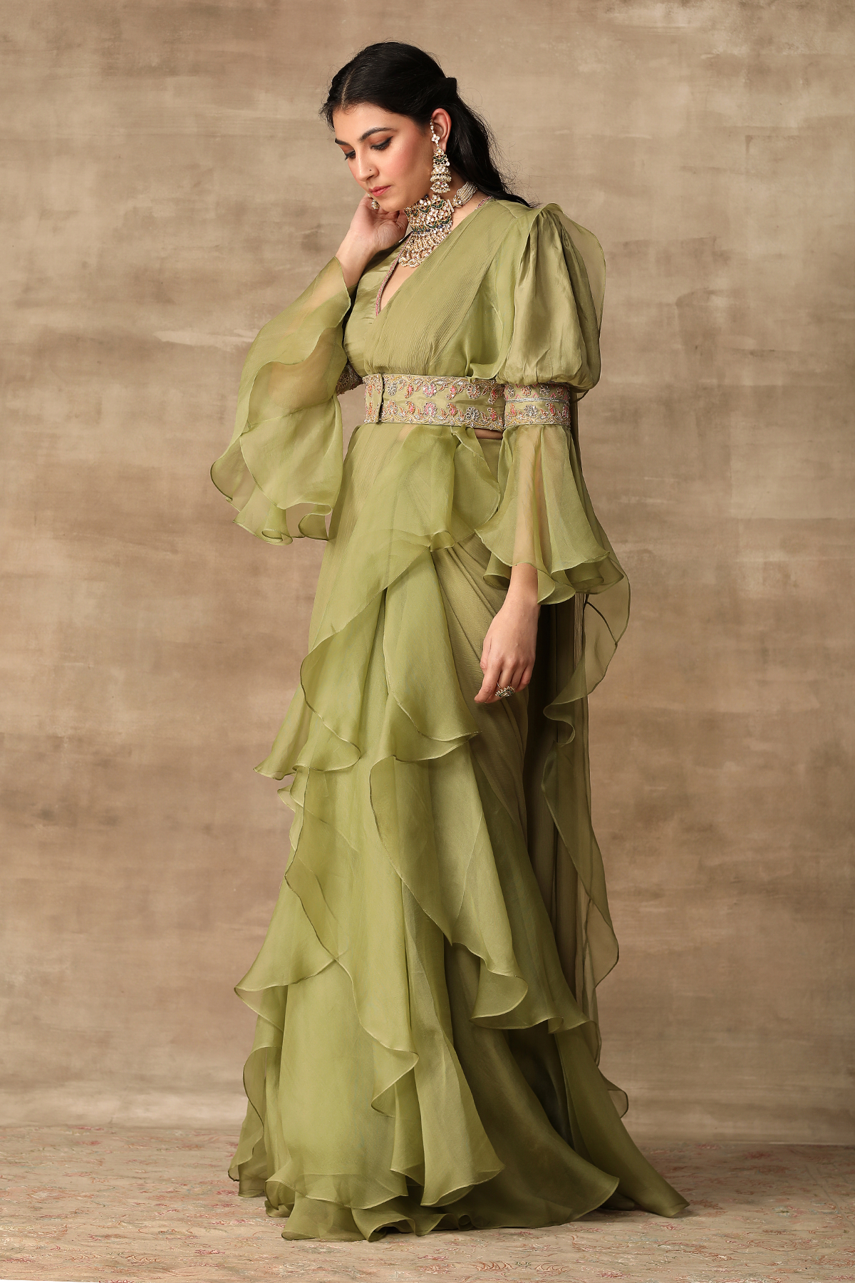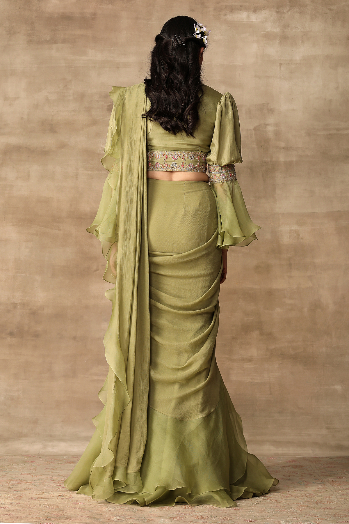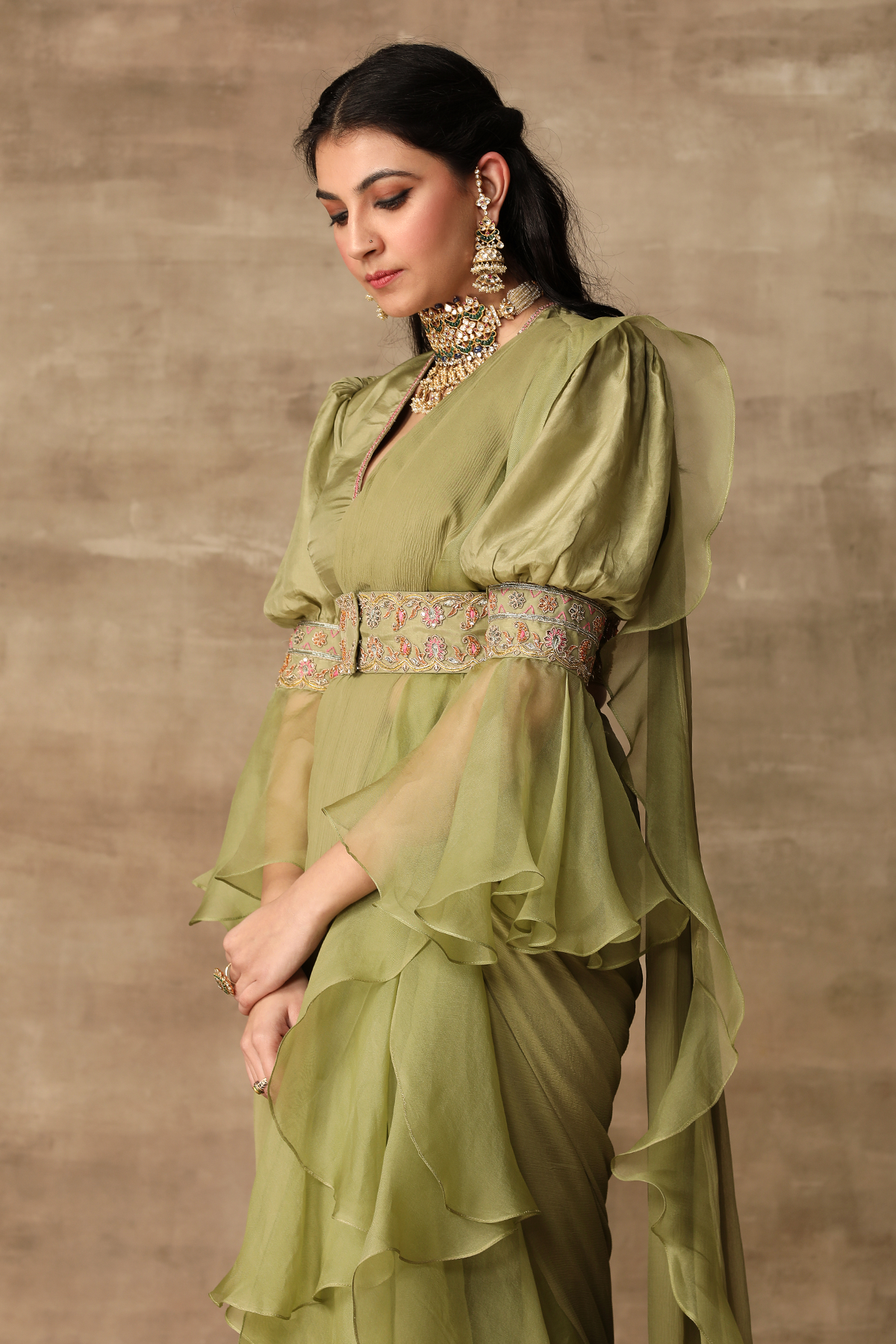 Apple green embroidered silk blouse with attached belt paired with chiffon-organza draped ruffle saree.