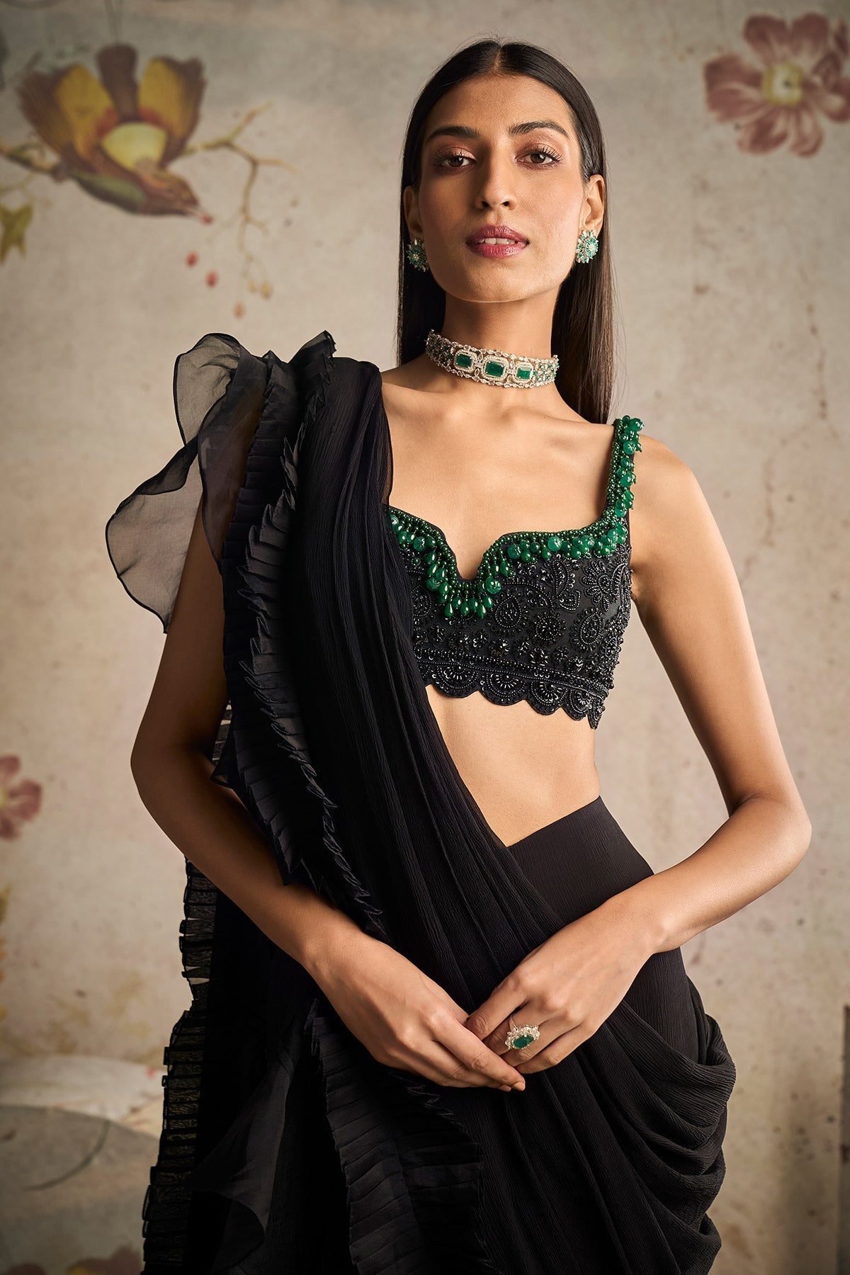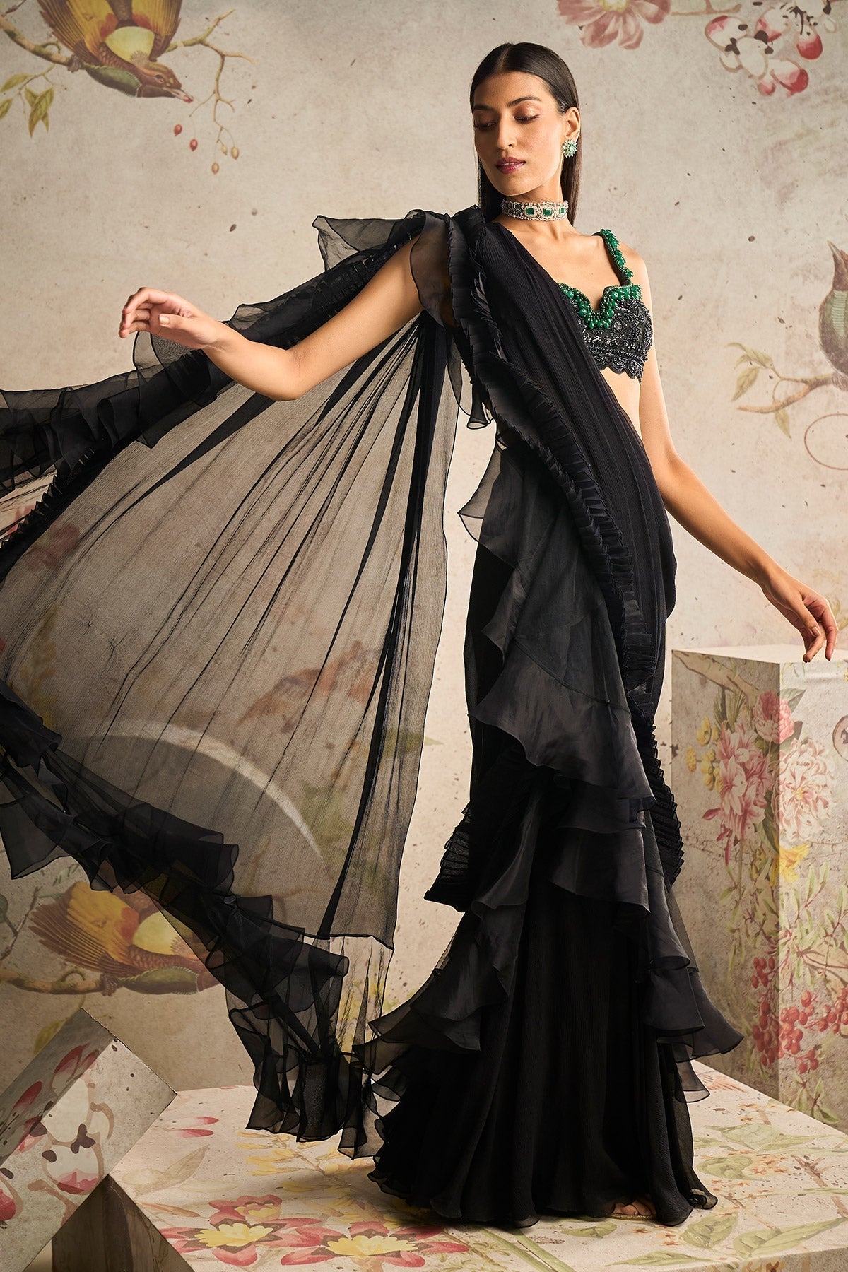 Black Heavy Jewelled Sleeveless Net Embroidered Blouse Paired With Chiffon Drape Saree With Organza Ruffle Detailing