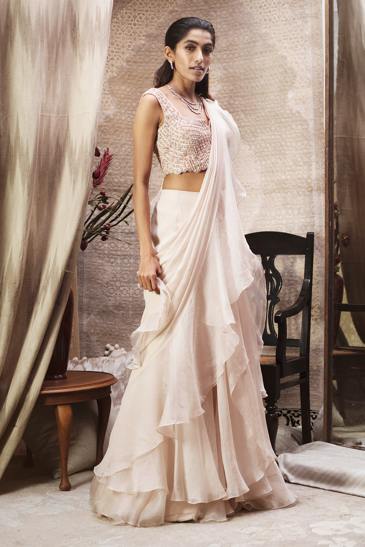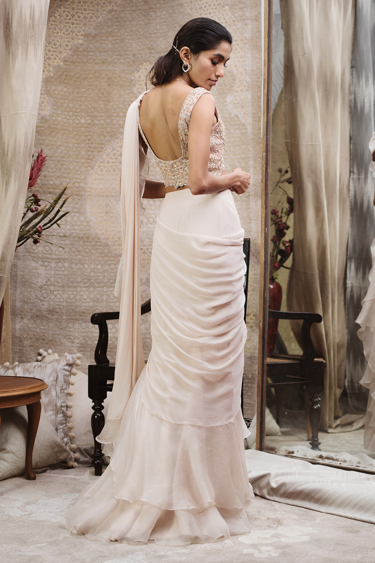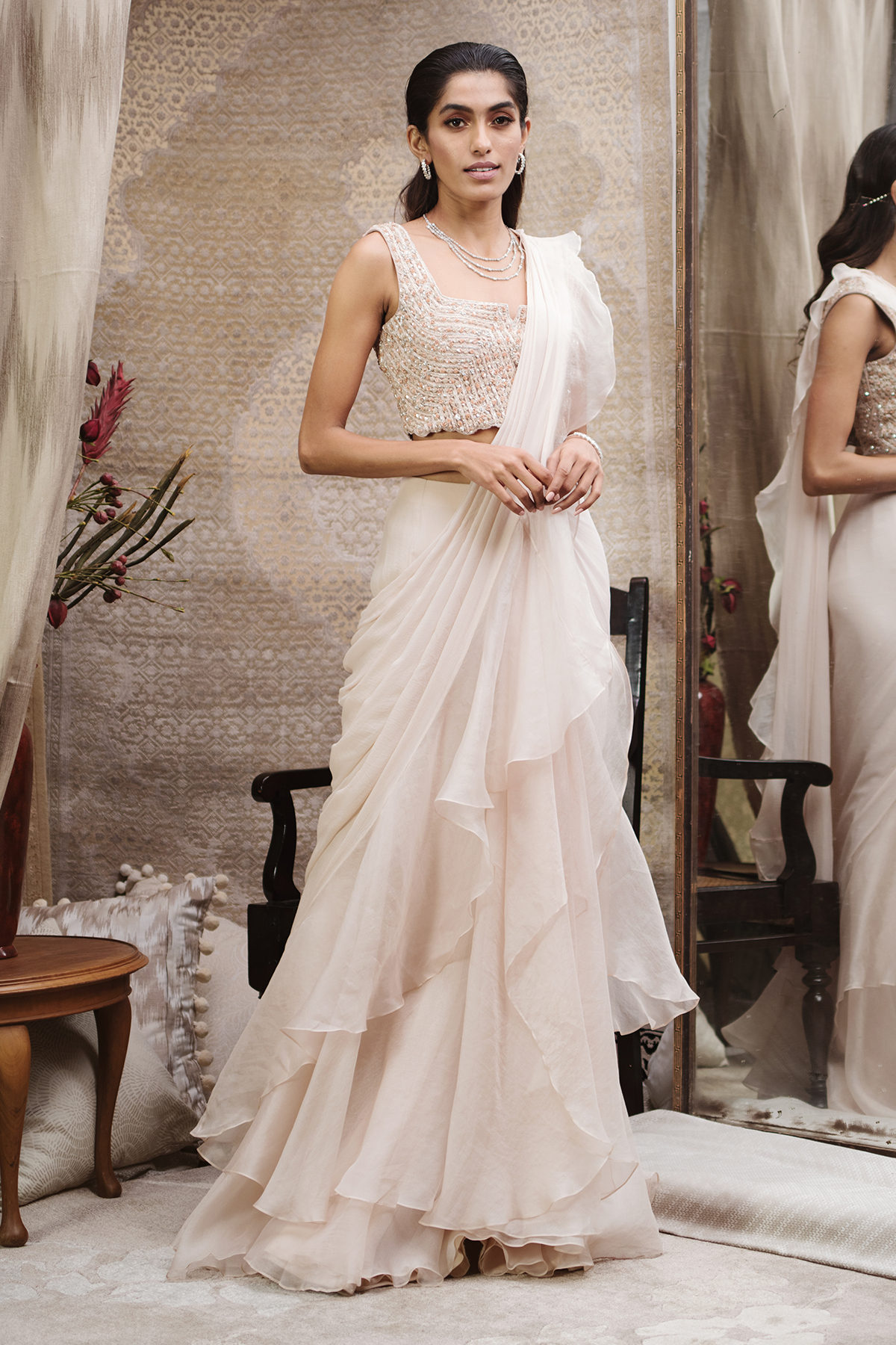 Heavily Embroidered Blouse with organza Draped Ruffle Saree