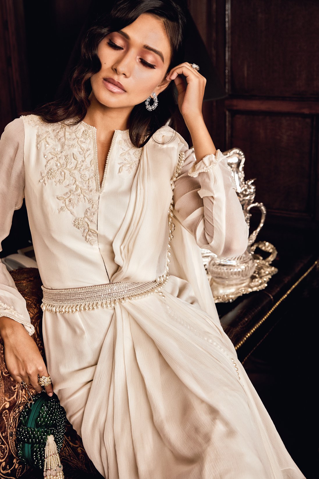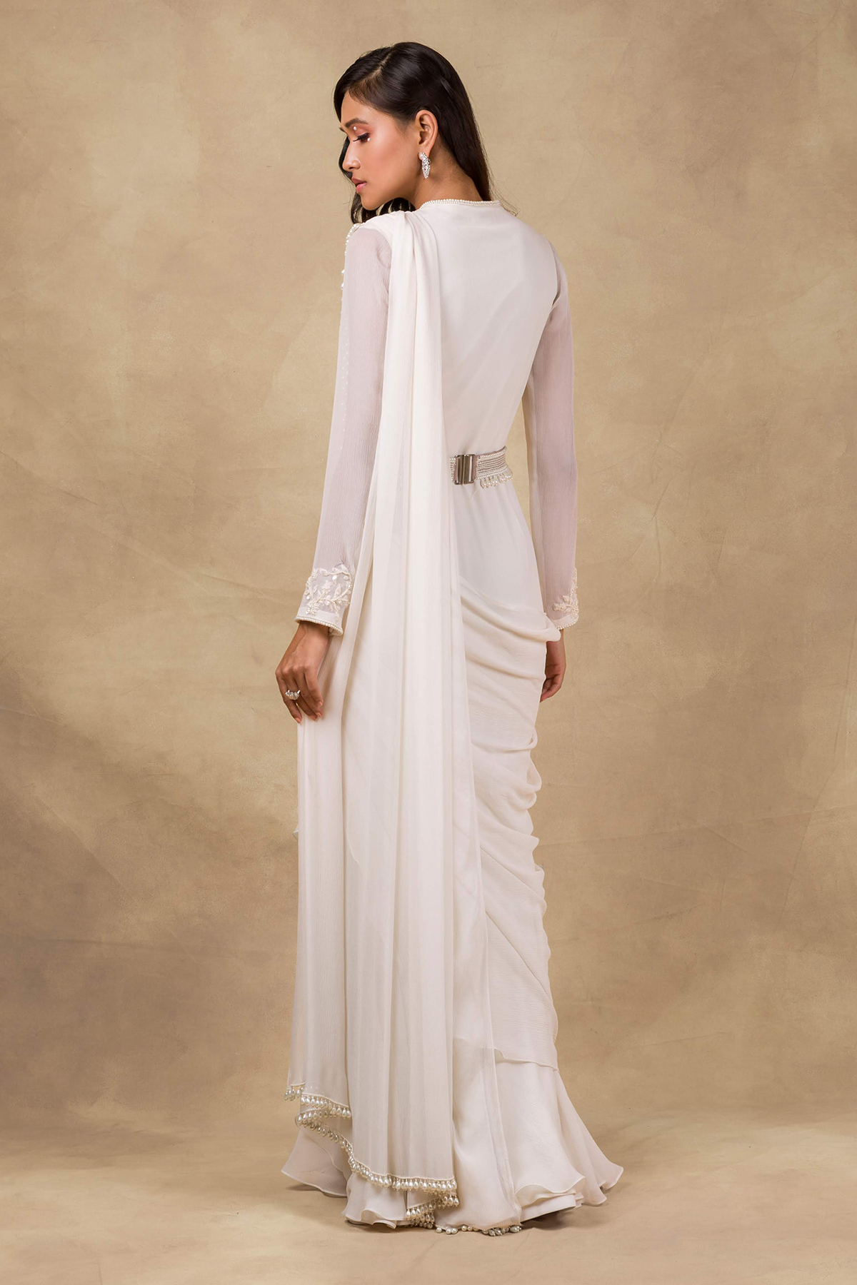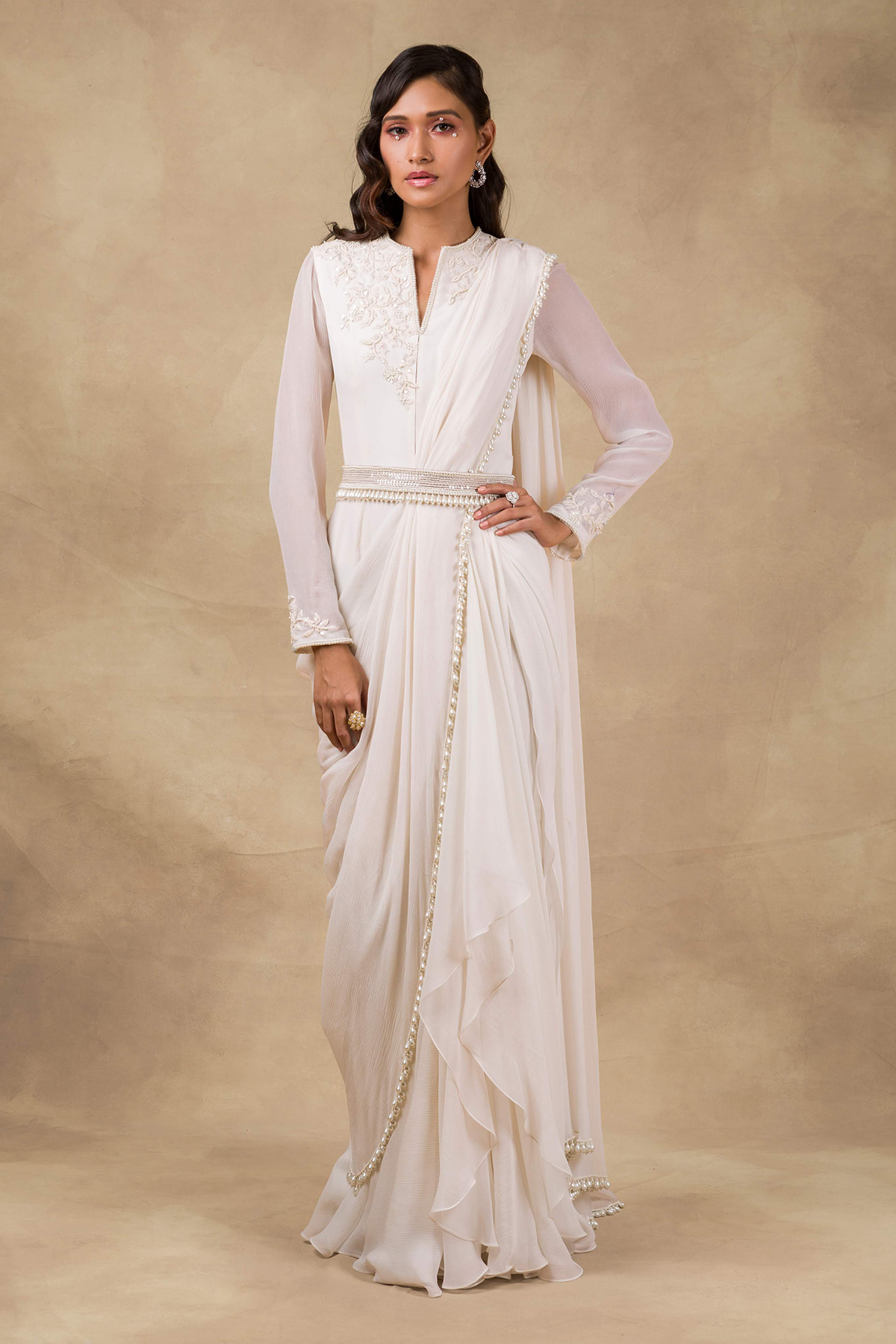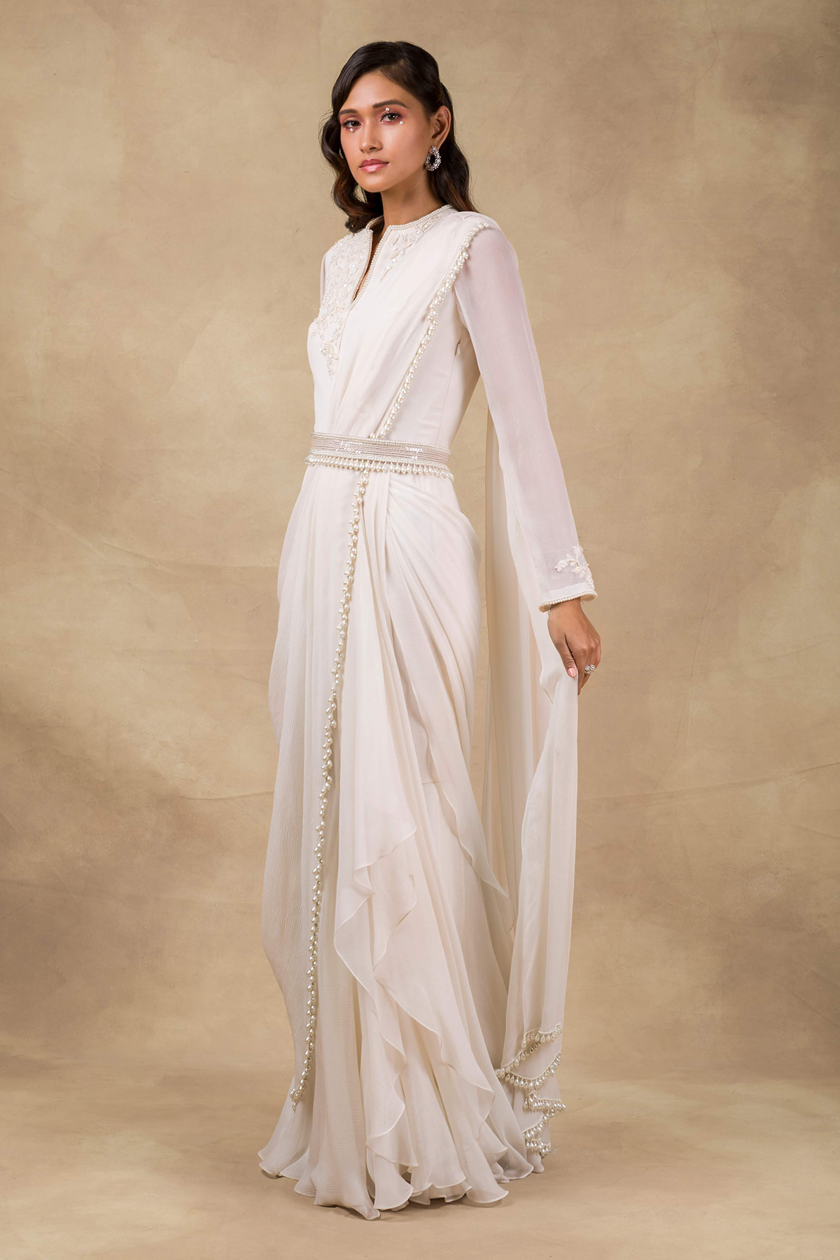 Ivory Embellished Saree Gown with Pearl Drop Detailing