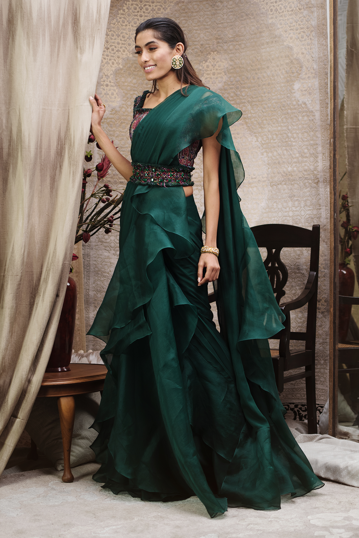 Organza and Chiffon Ruffled saree with Thread Work Boho Blouse and a Belt