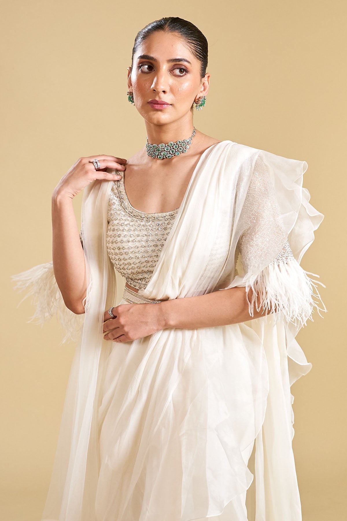Embroidered net blouse with organza chiffon draped saree paired with embroidered belt