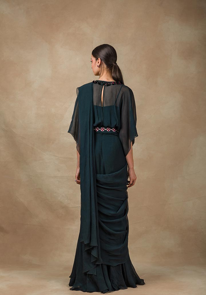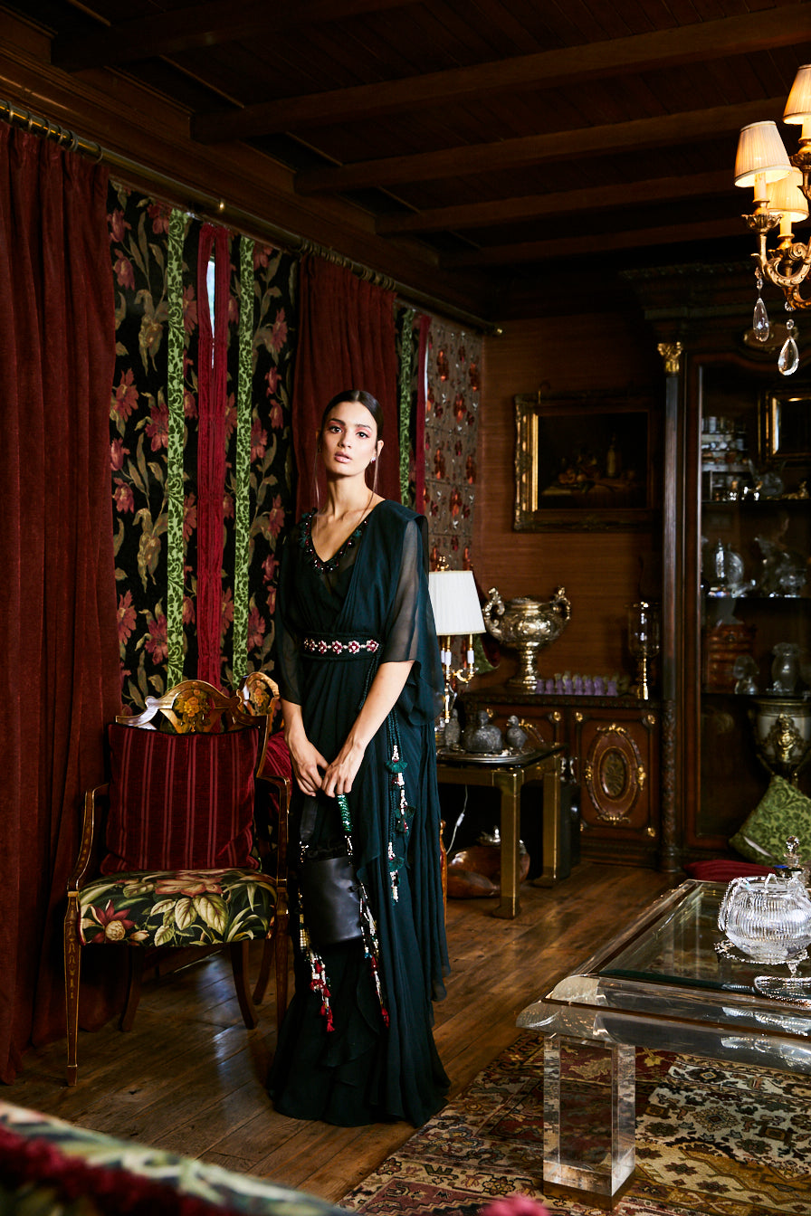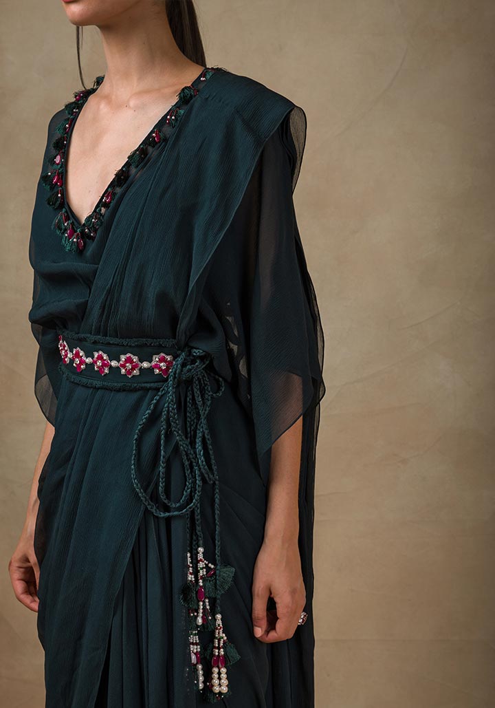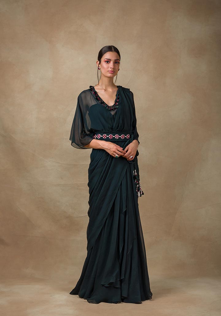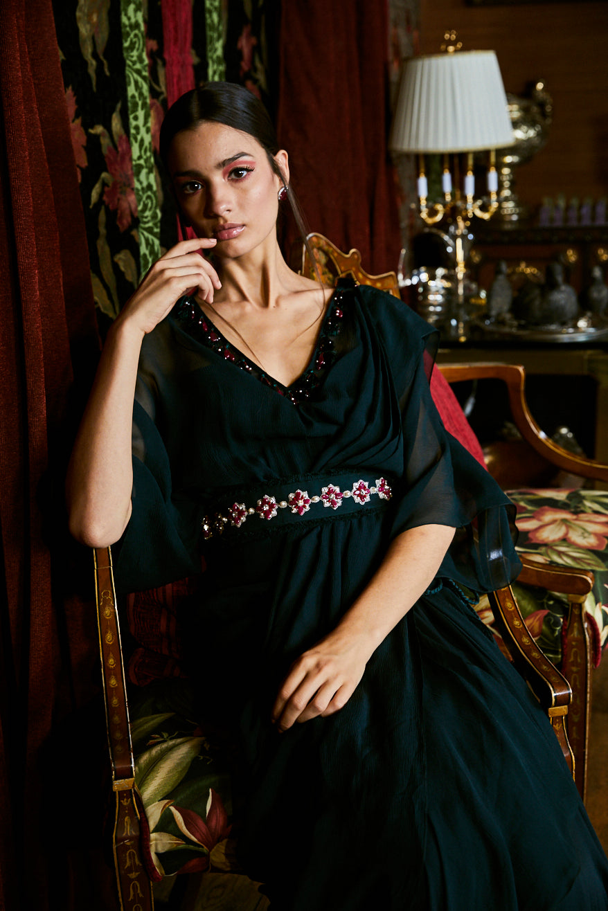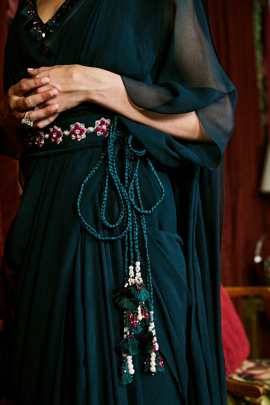 Chiffon Emerald Saree with Emerald and Ruby Stone Belt