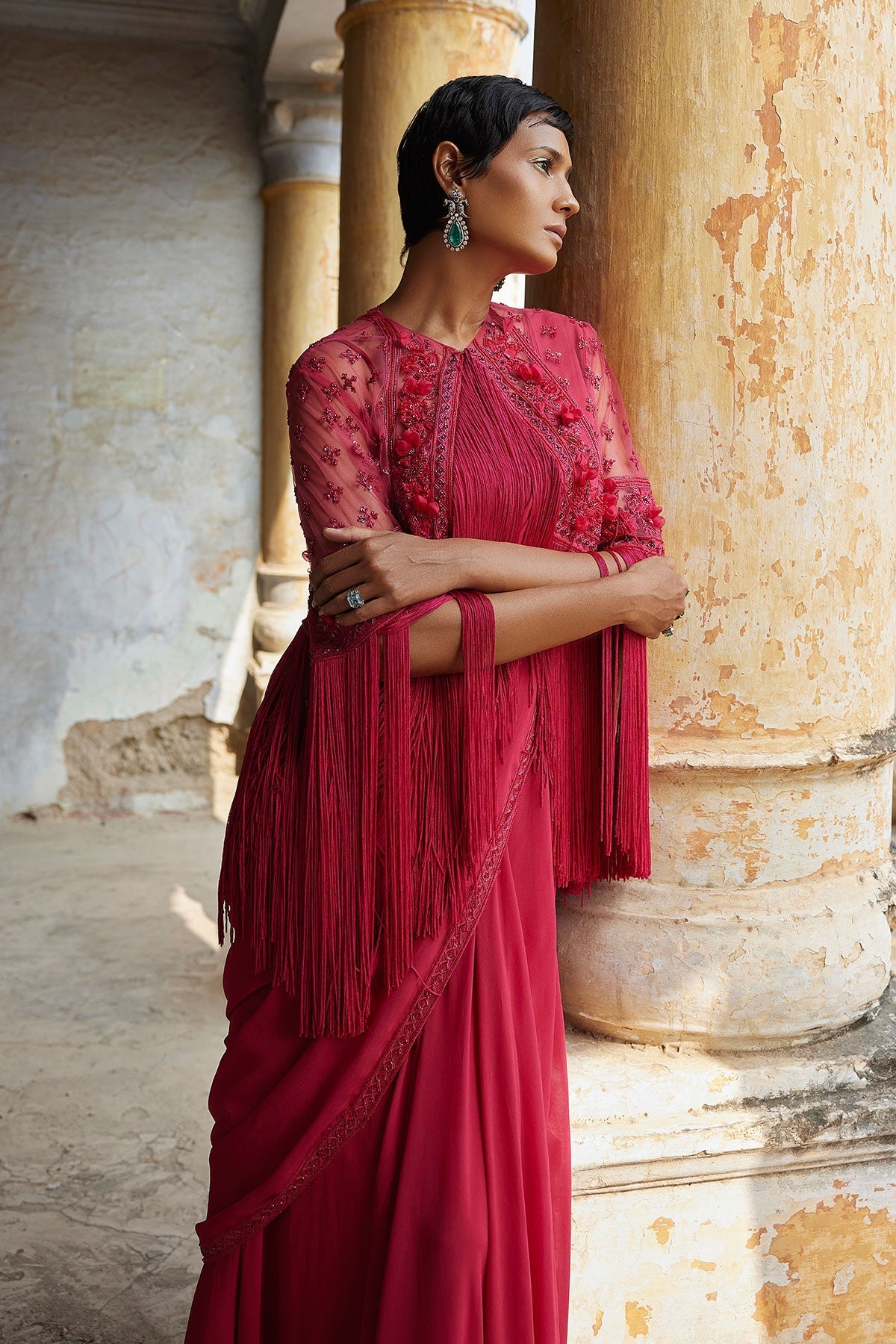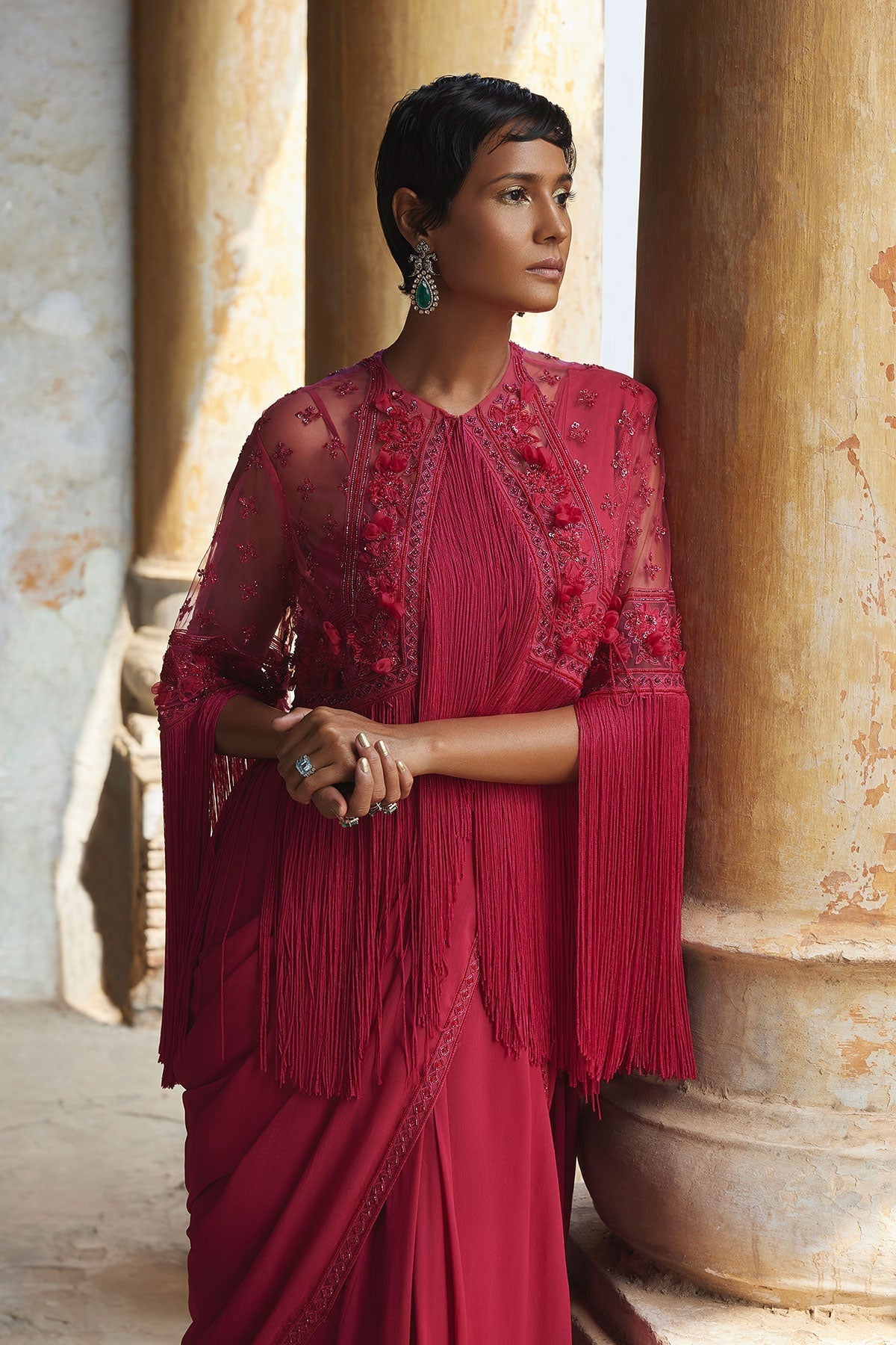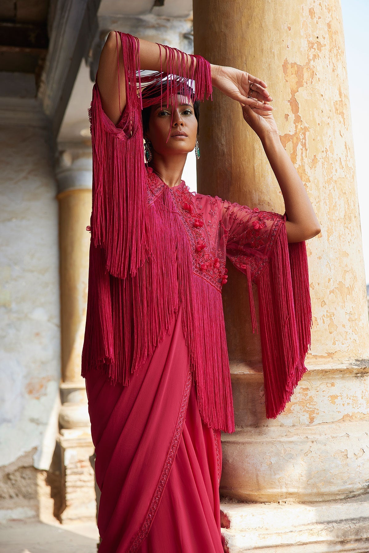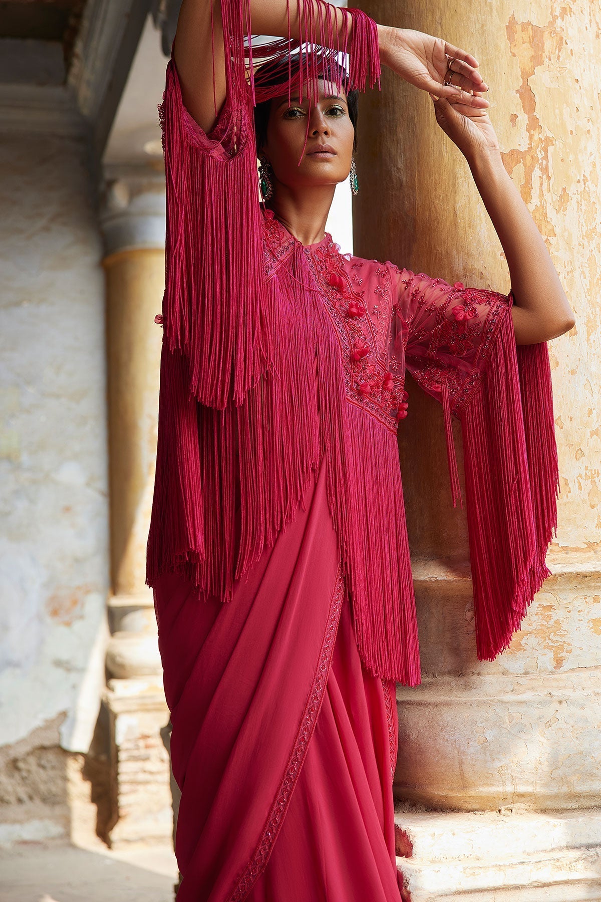 Fuchsia Georgette Saree With Embroidered Border And Georgette Sleeveless Plain Blouse Paired With Embroidered Fringed Cape