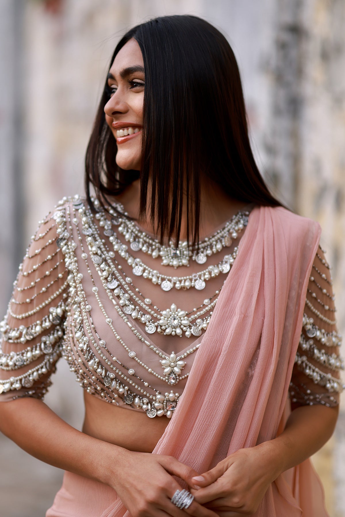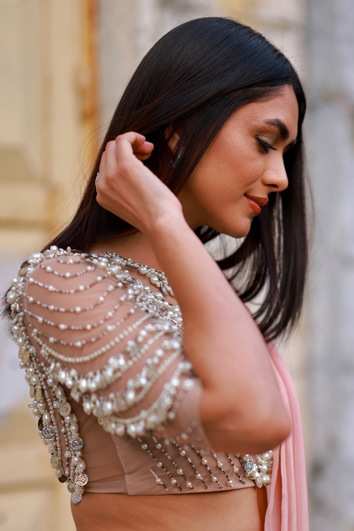 Champagne net jeweled embroidered blouse with peach chiffon draped ruffle saree.