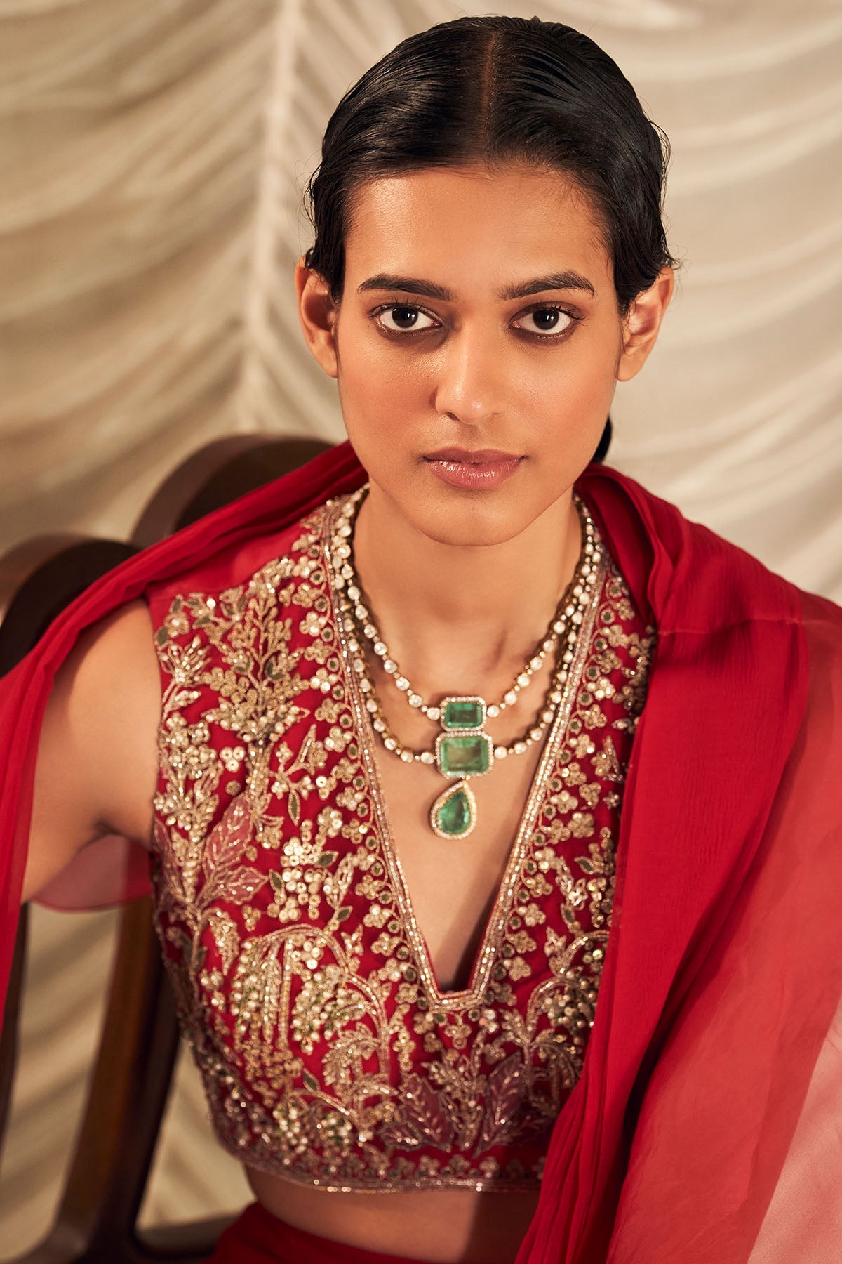 Red Net Embroidered Blouse With Chiffon Drape Saree and Organza Ruffle