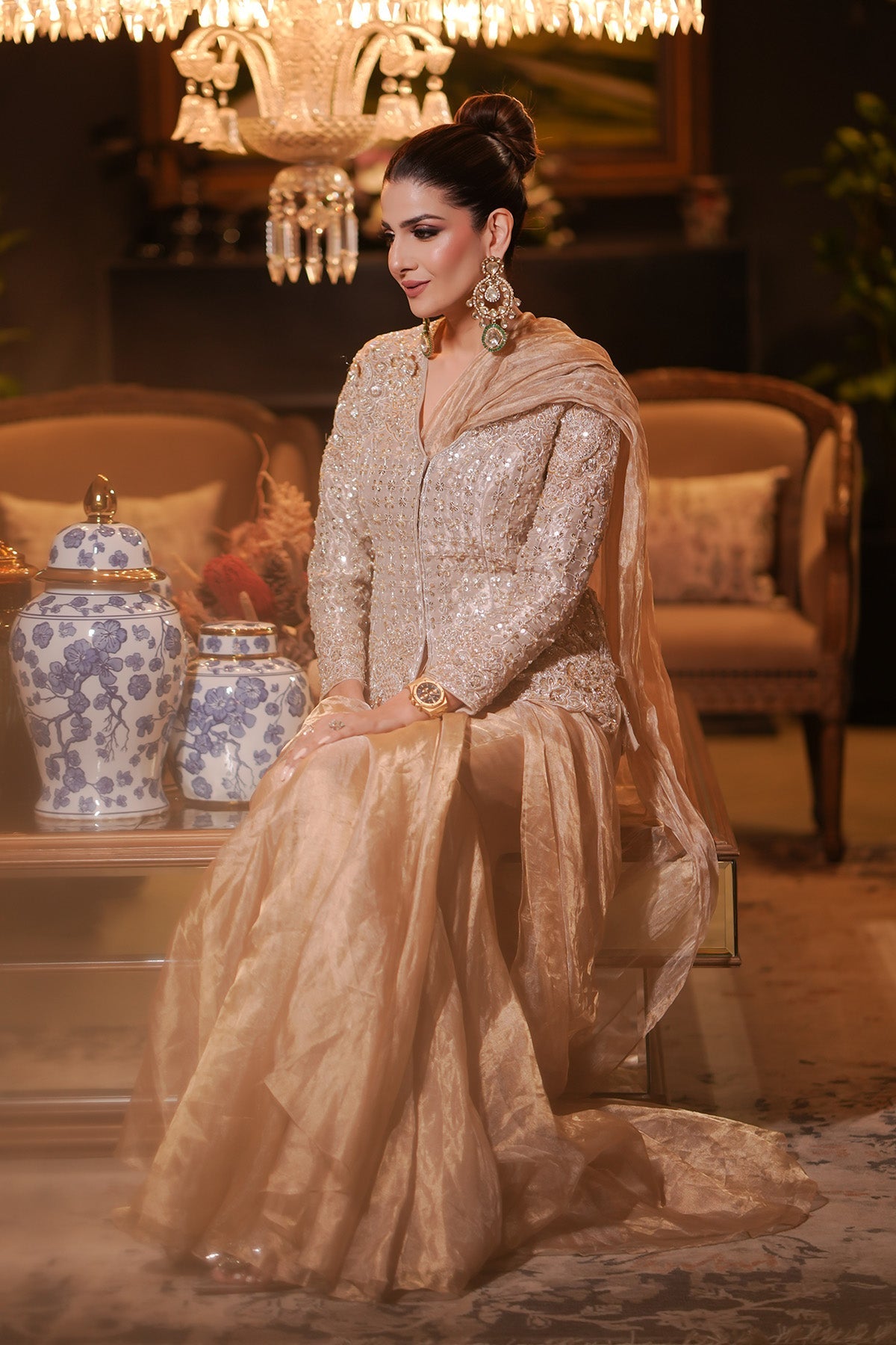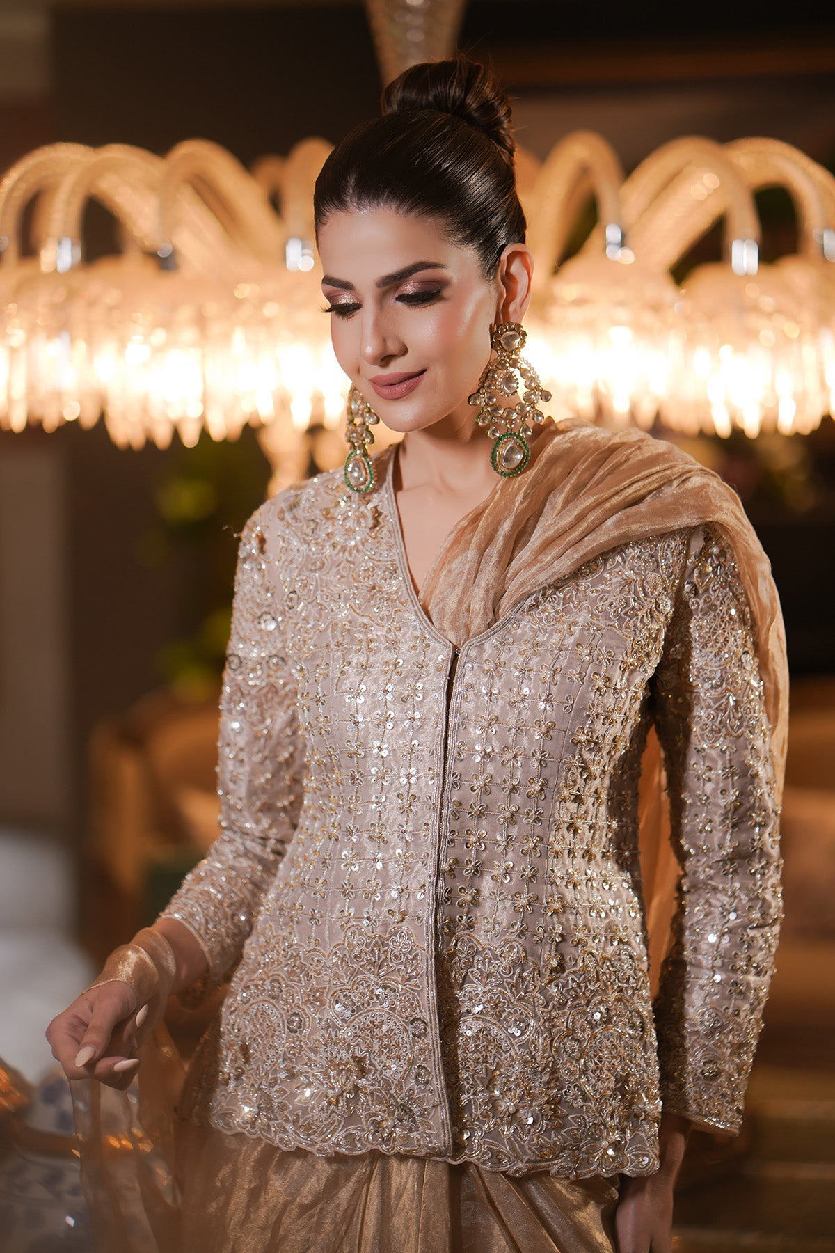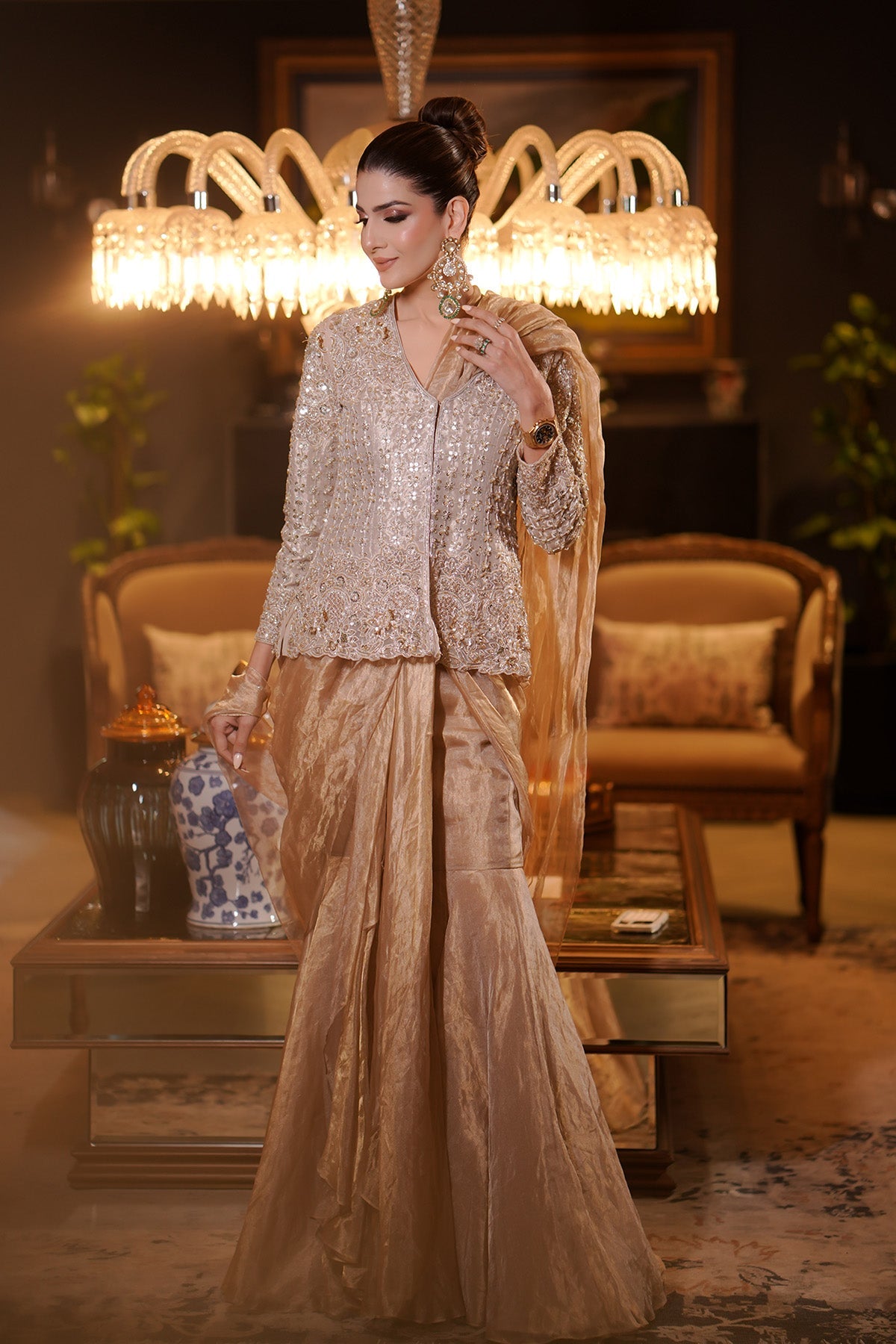 Allover Embroidered Tissue Short Jacket with Plain Tissue Draped Saree