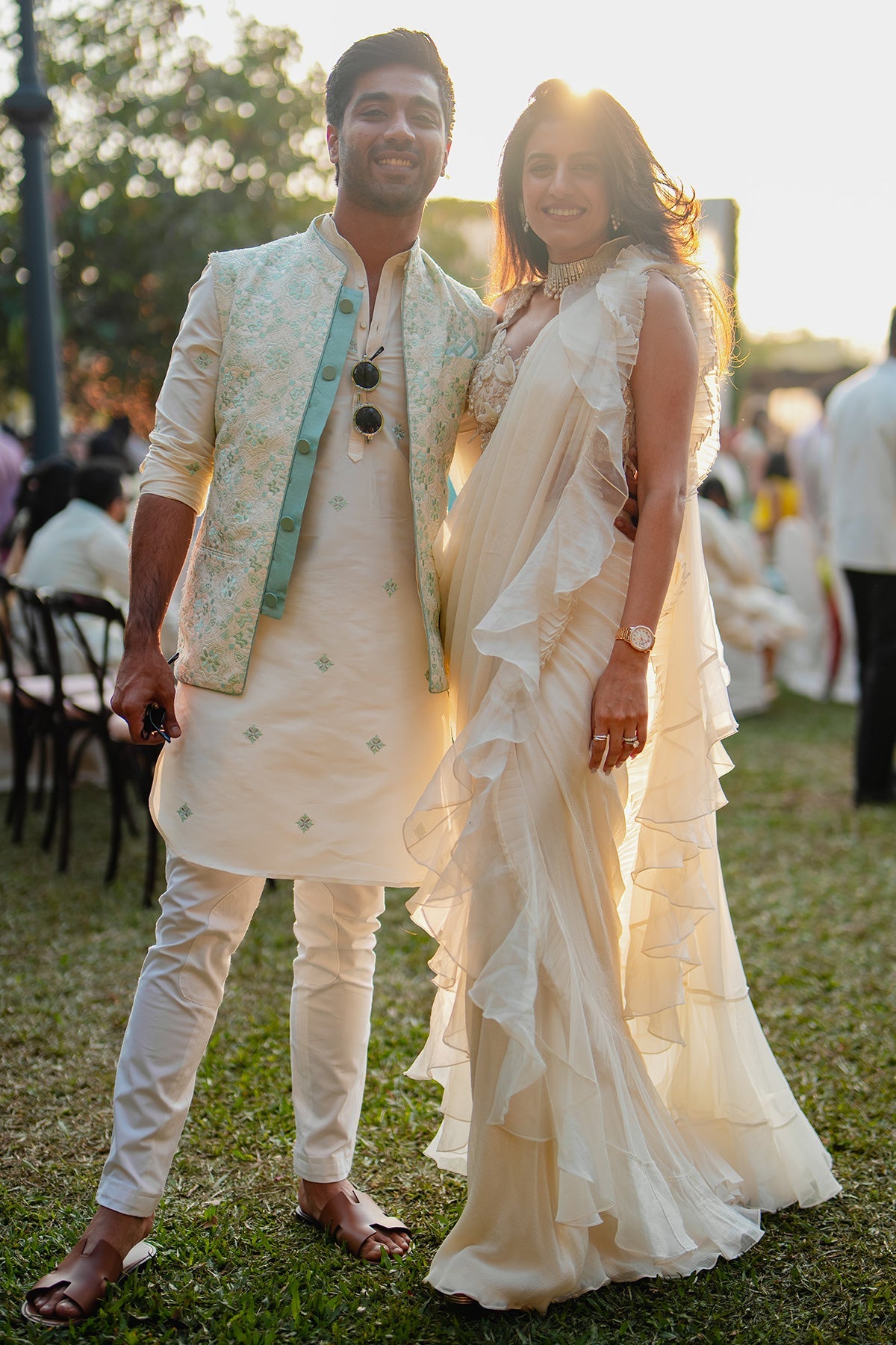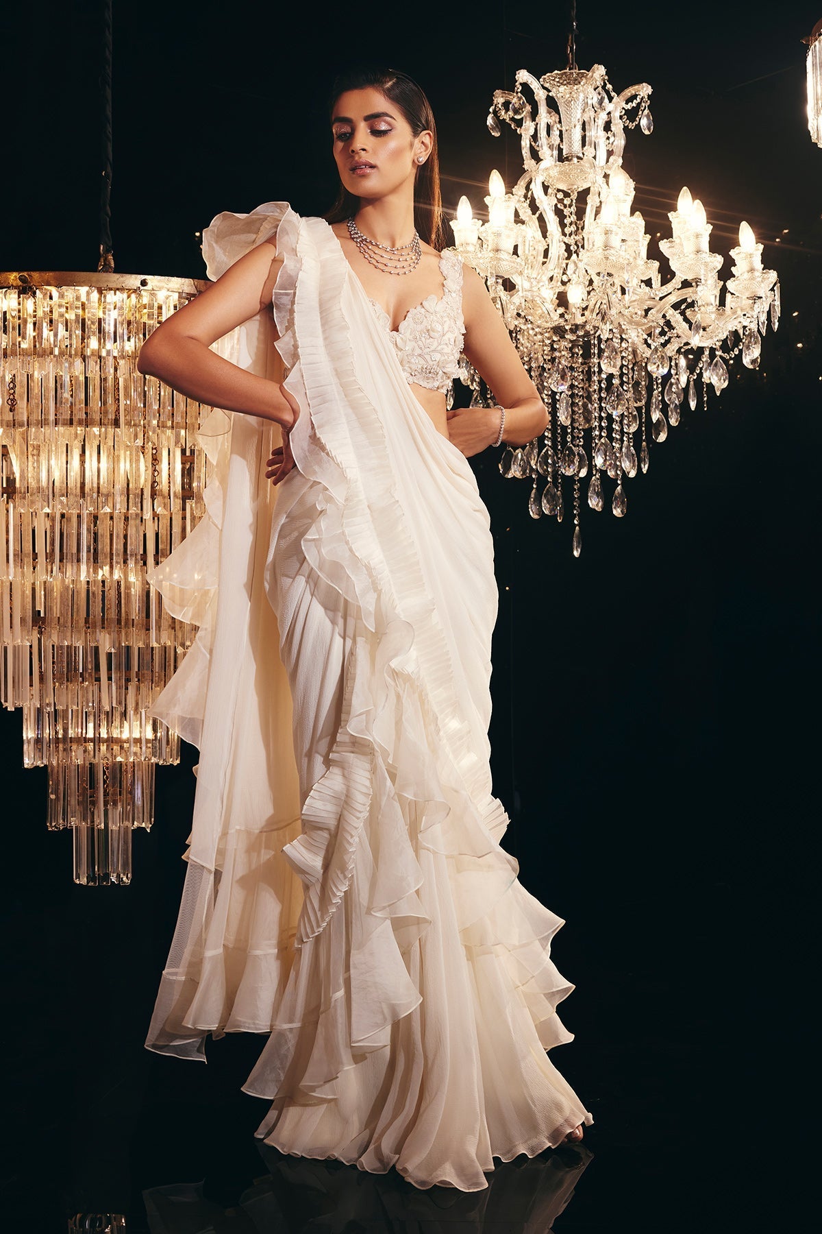 Ivory thread embroidered net blouse with Chiffon organza Double draped ruffle saree