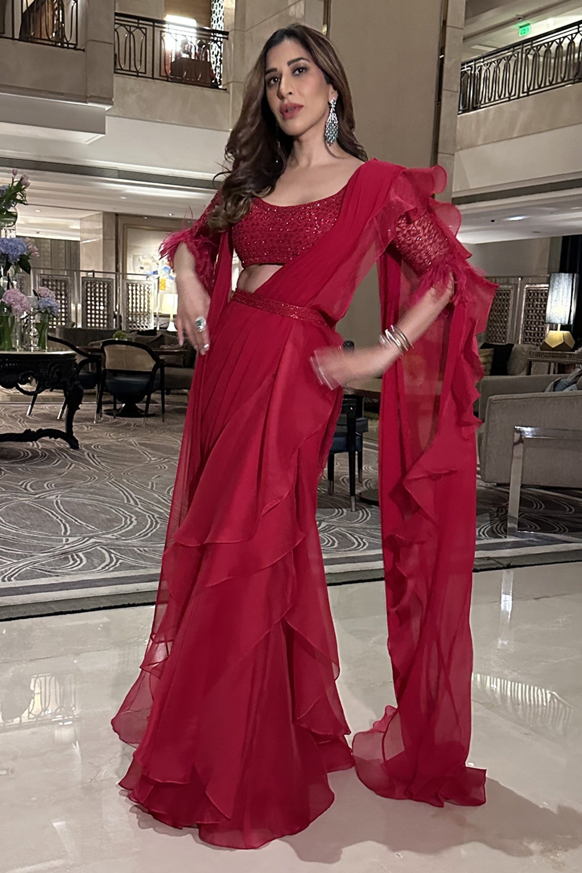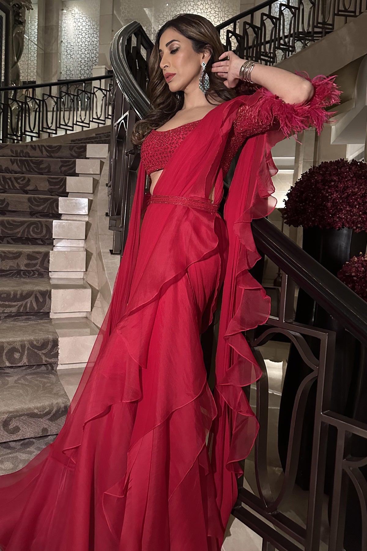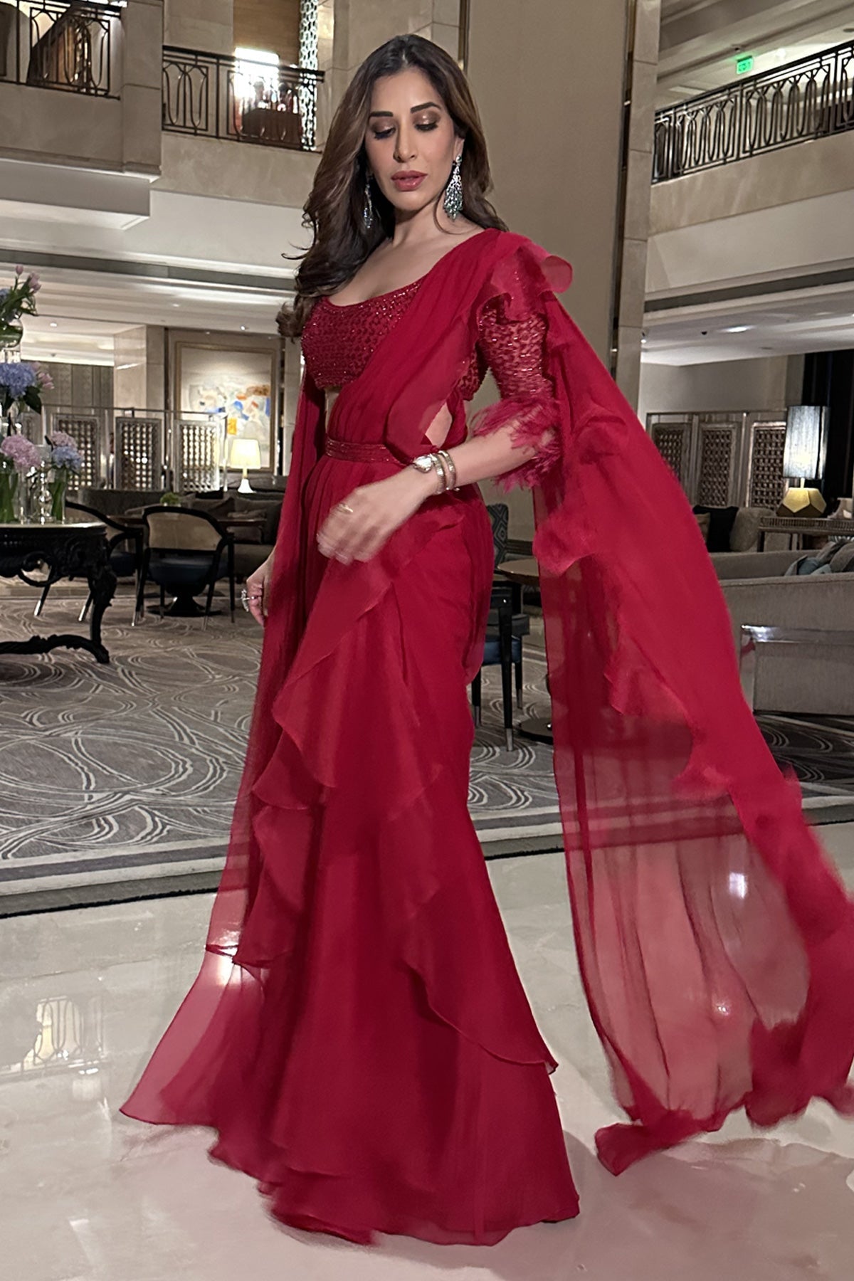 Red net allover embroidered blouse with net drape and organza chiffon draped ruffle saree paired with embroidered belt