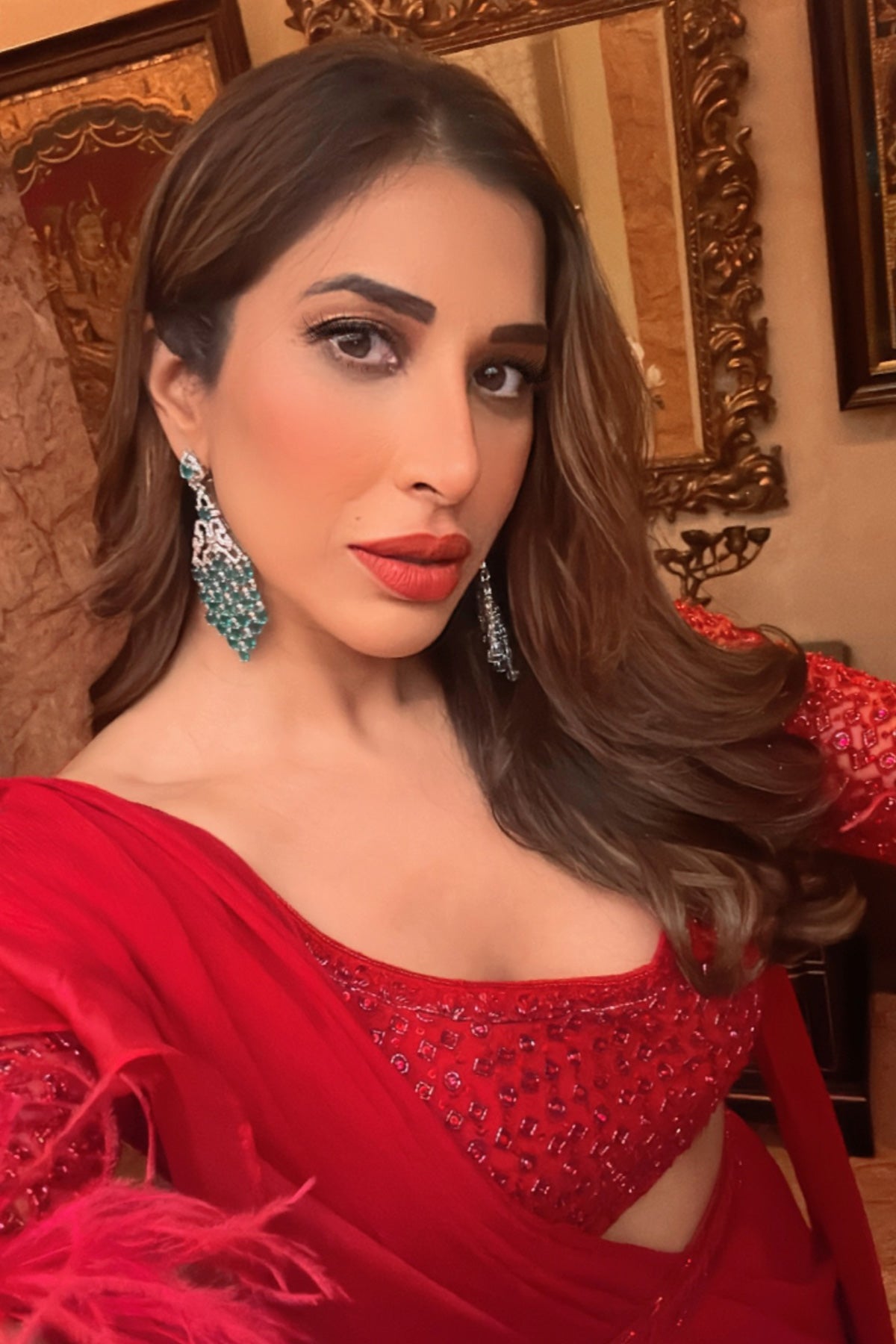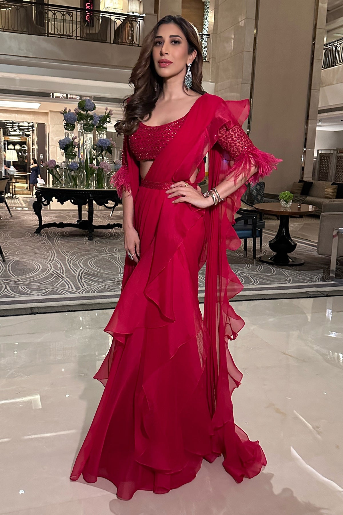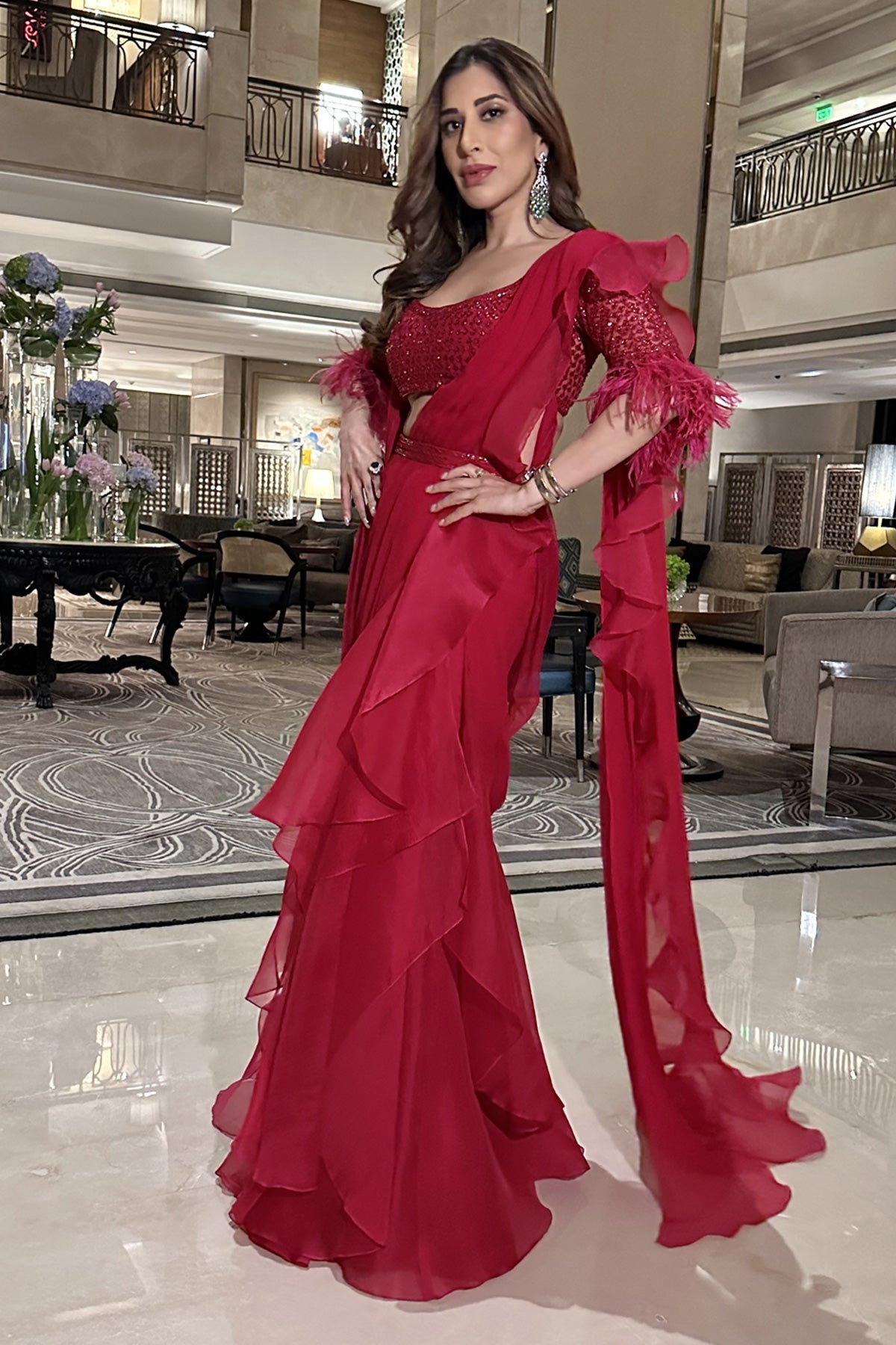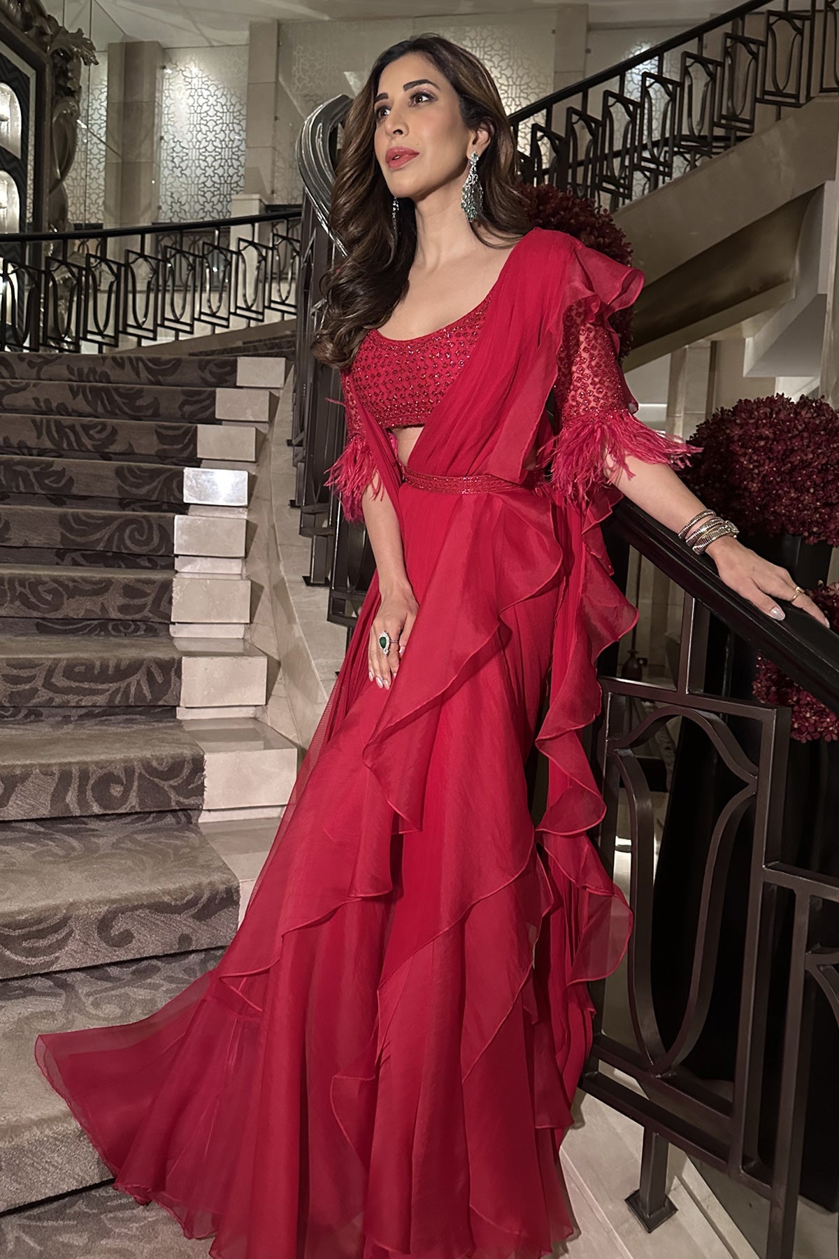 Red net allover embroidered blouse with net drape and organza chiffon draped ruffle saree paired with embroidered belt