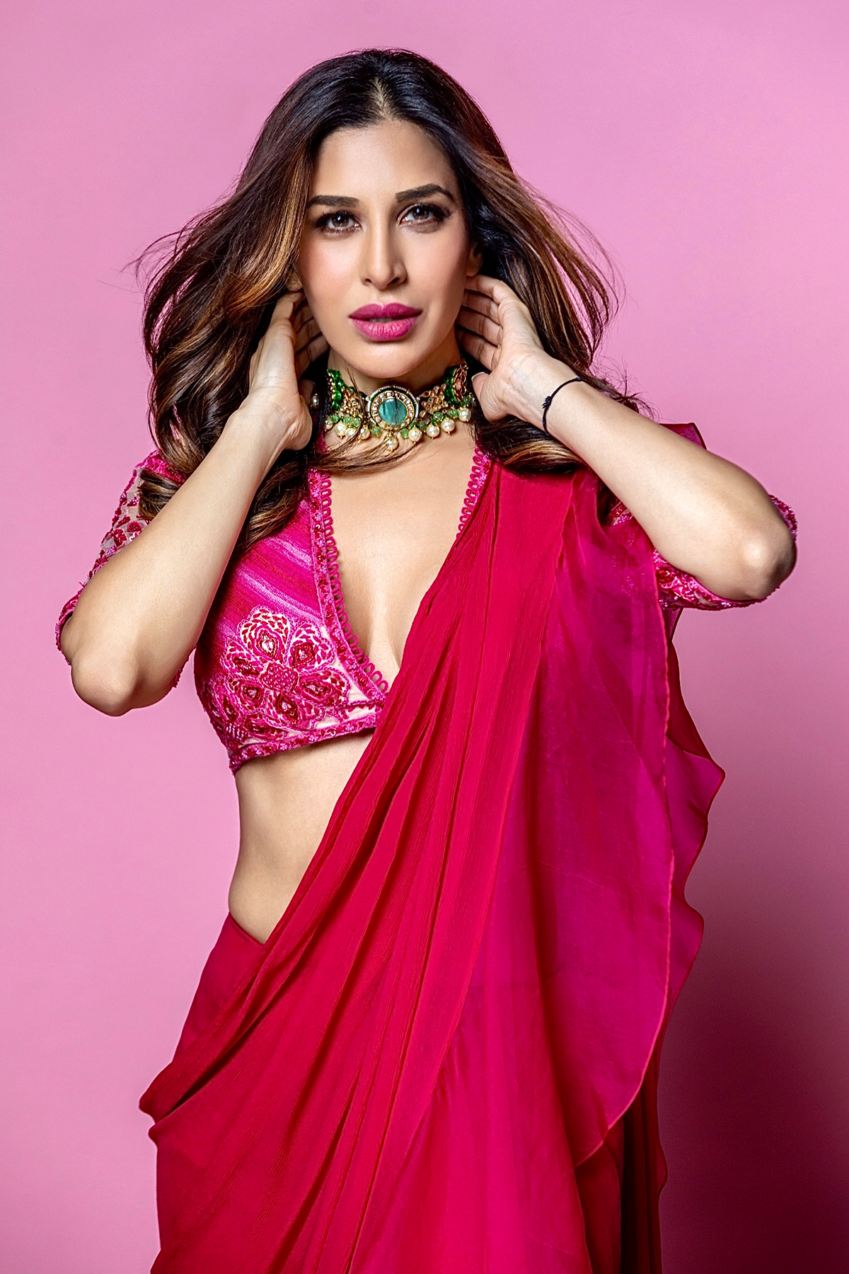 Champagne net blouse with fuschia embroidered and fuschia chiffon-organza draped ruffle saree
