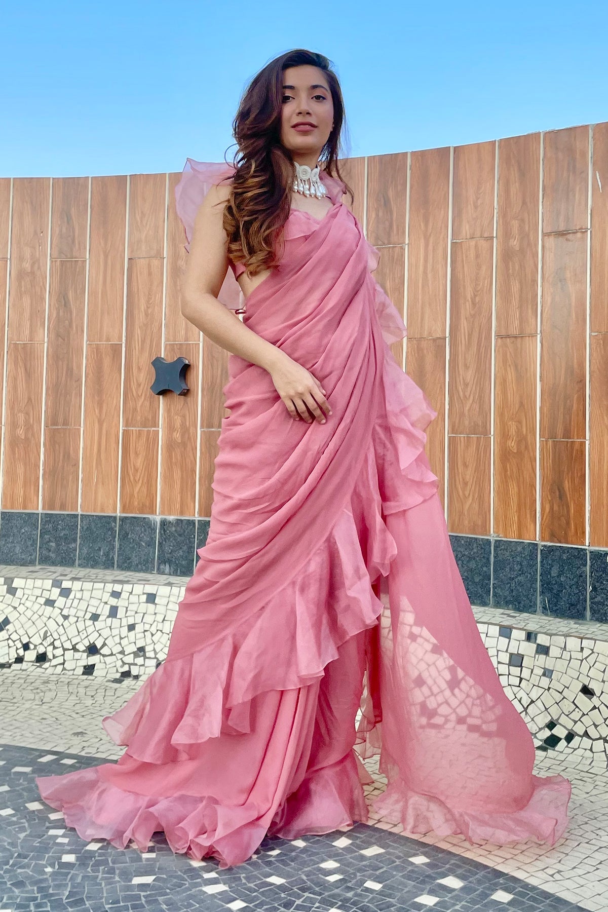 Onion pink georgette ruffled saree with ruffled sleeves blouse and crepe petticoat and jeweled navratan Belt