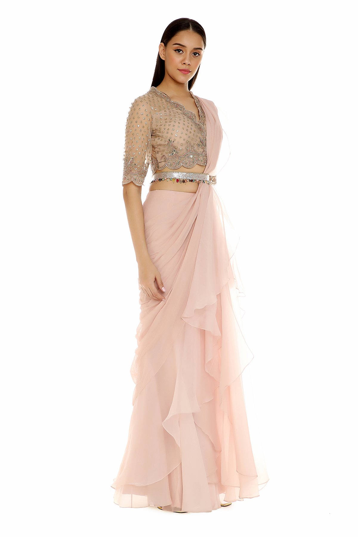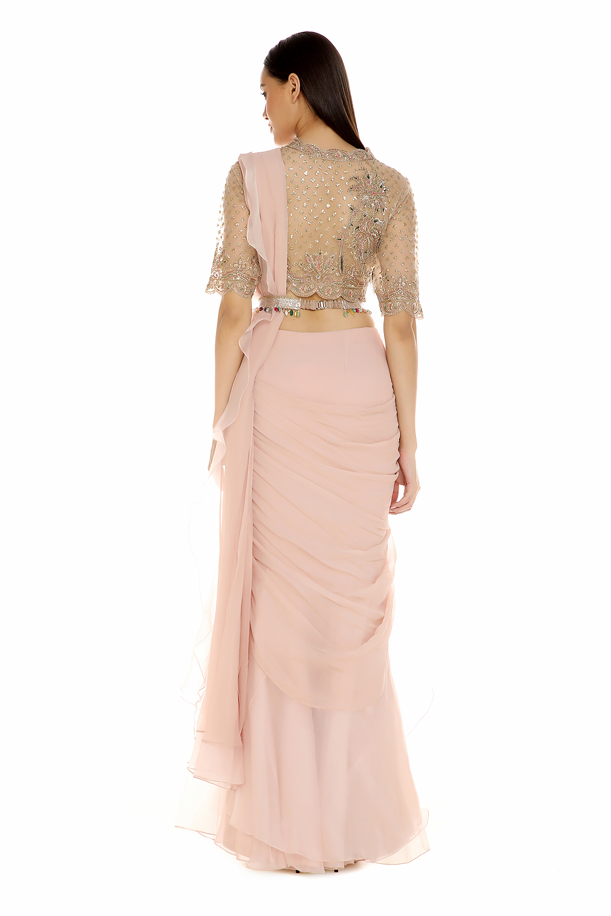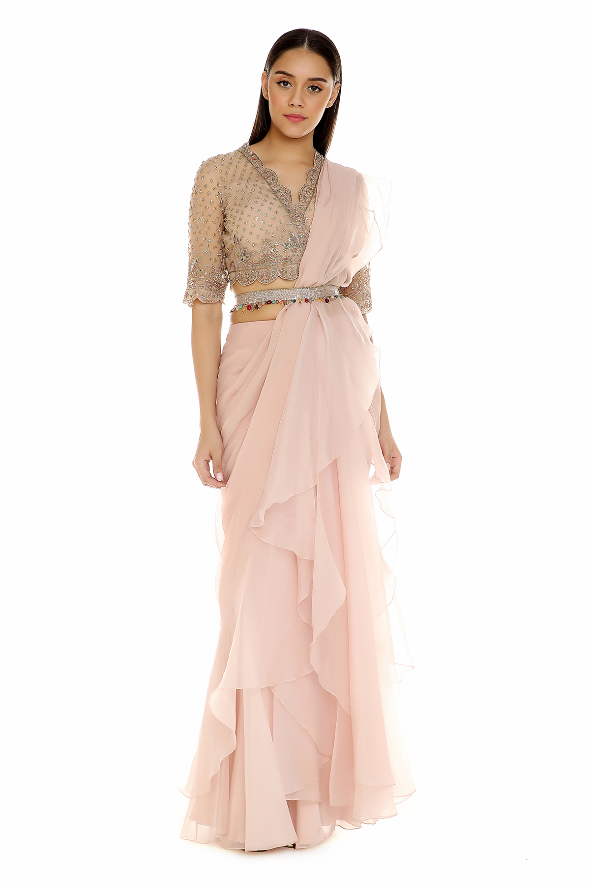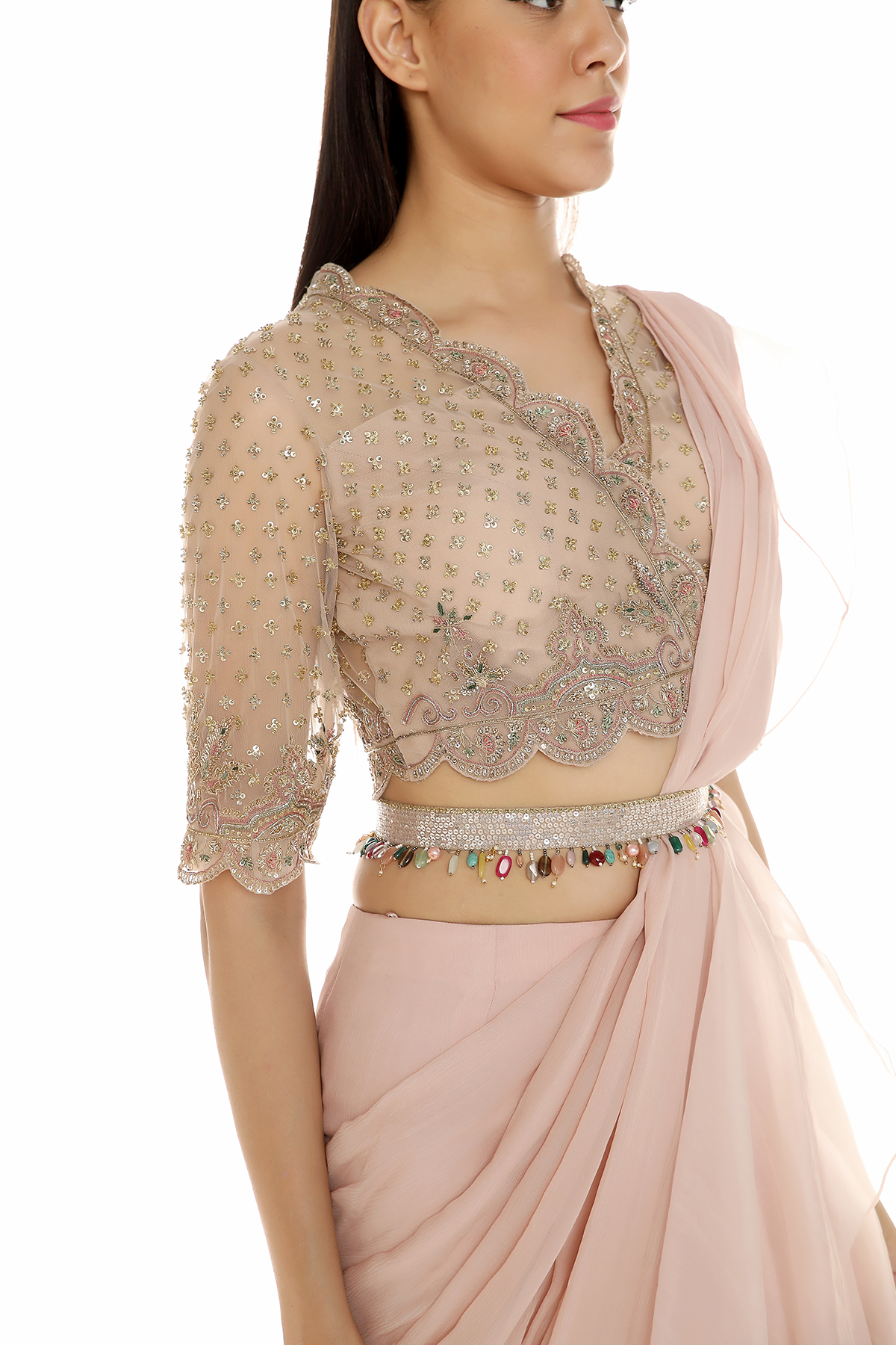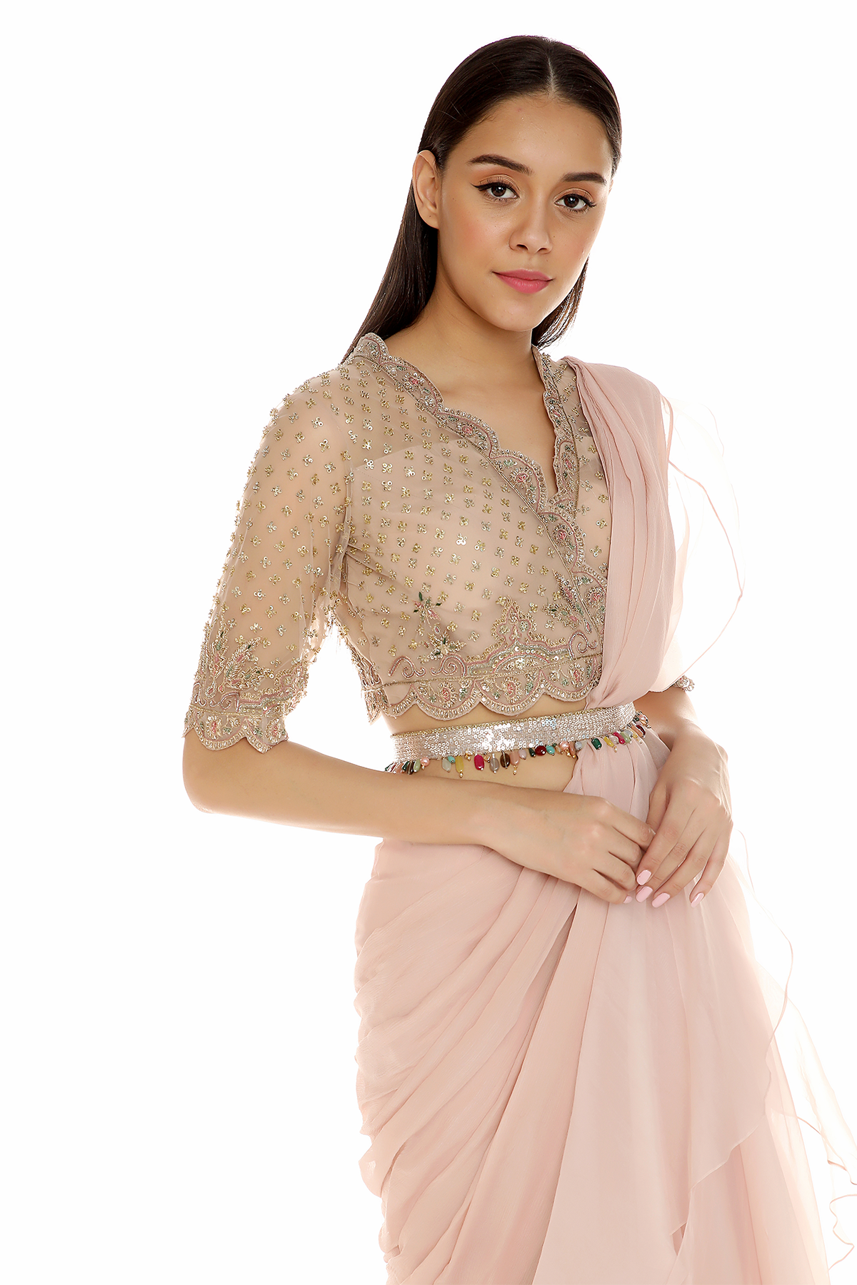 Blush Pink embroidered net blouse with teal chiffon-organza draped ruffle saree paired sequin embroidered belt.