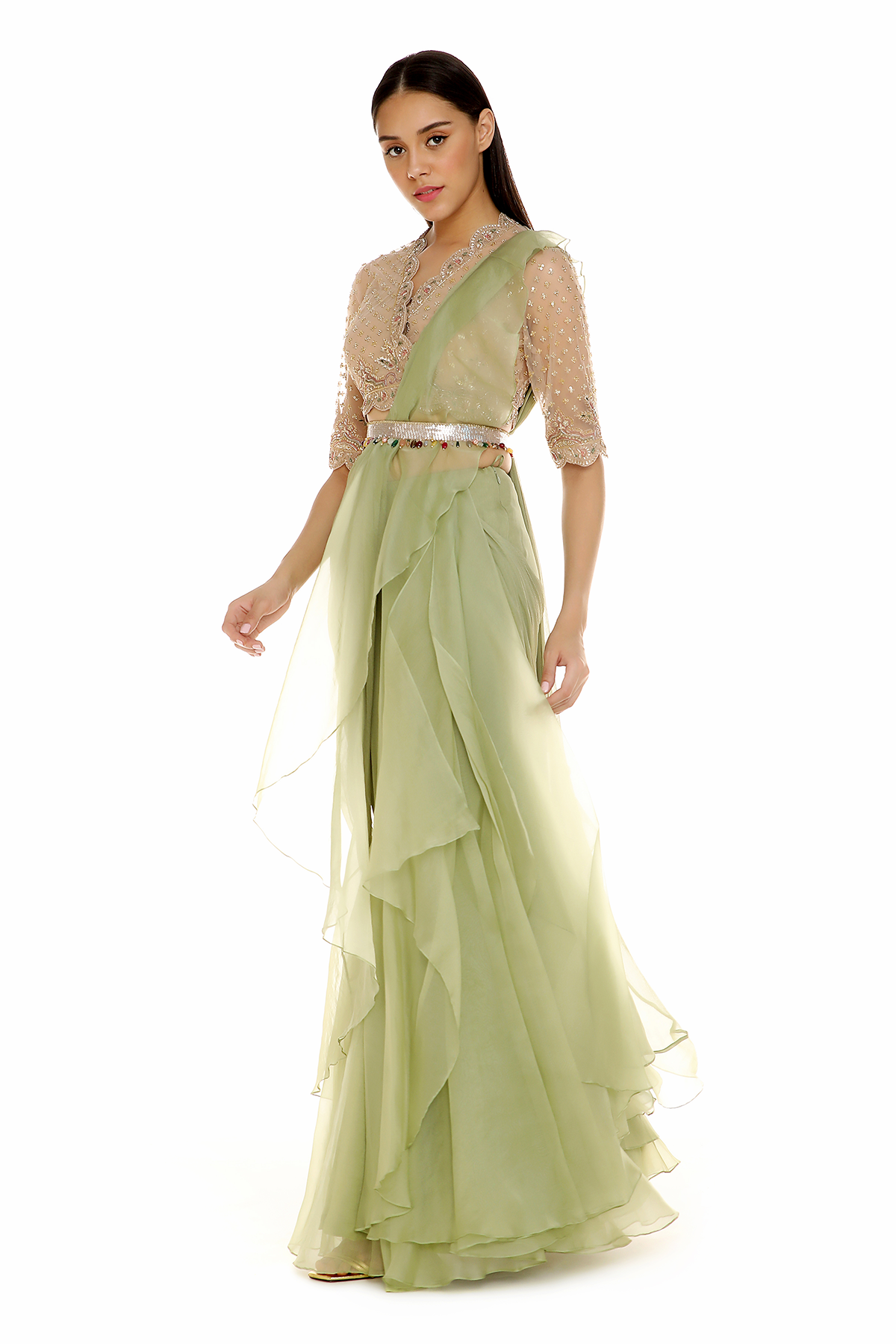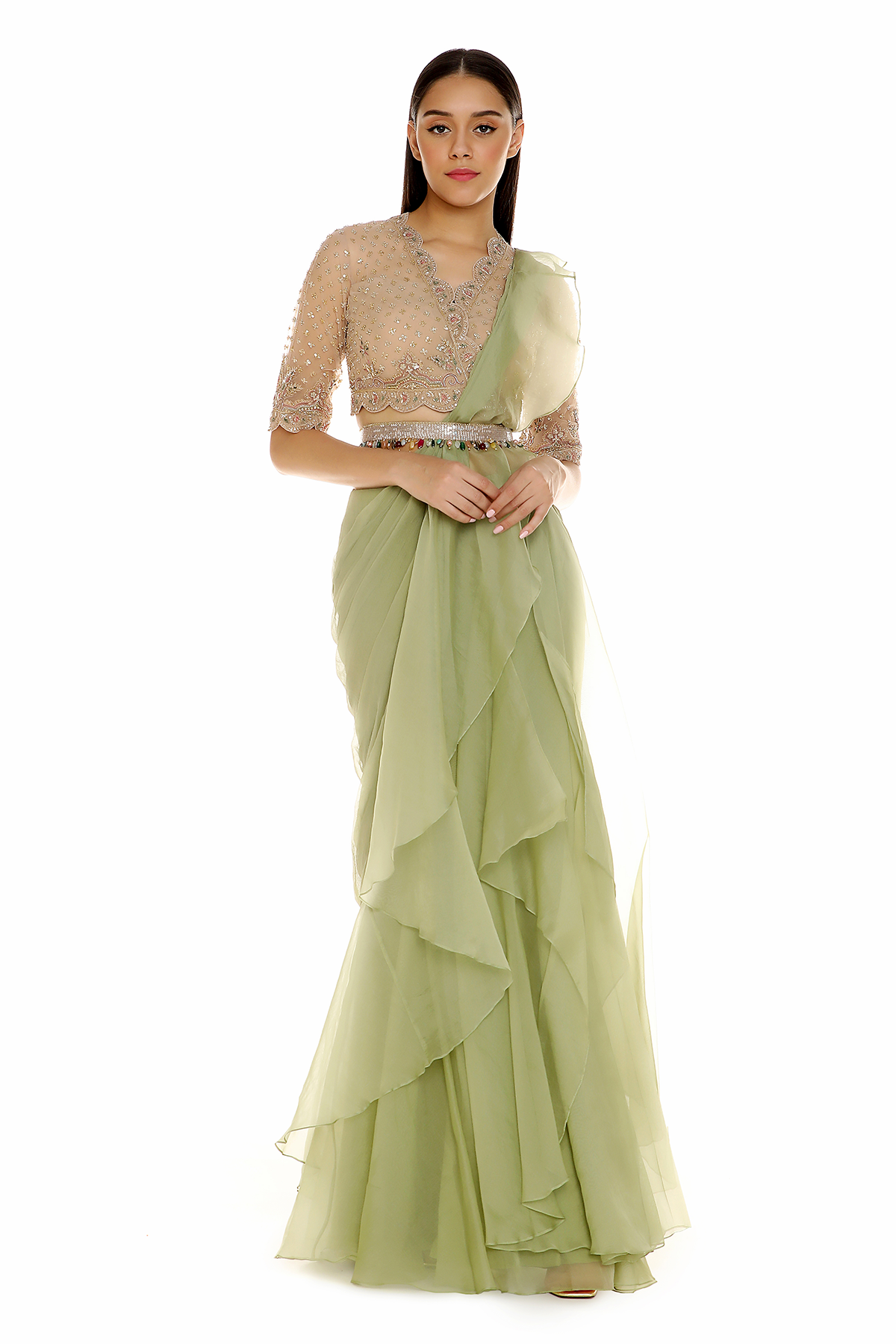 Champagne embroidered net blouse with Green Apple chiffon-organza draped ruffle saree paired sequin embroidered belt.