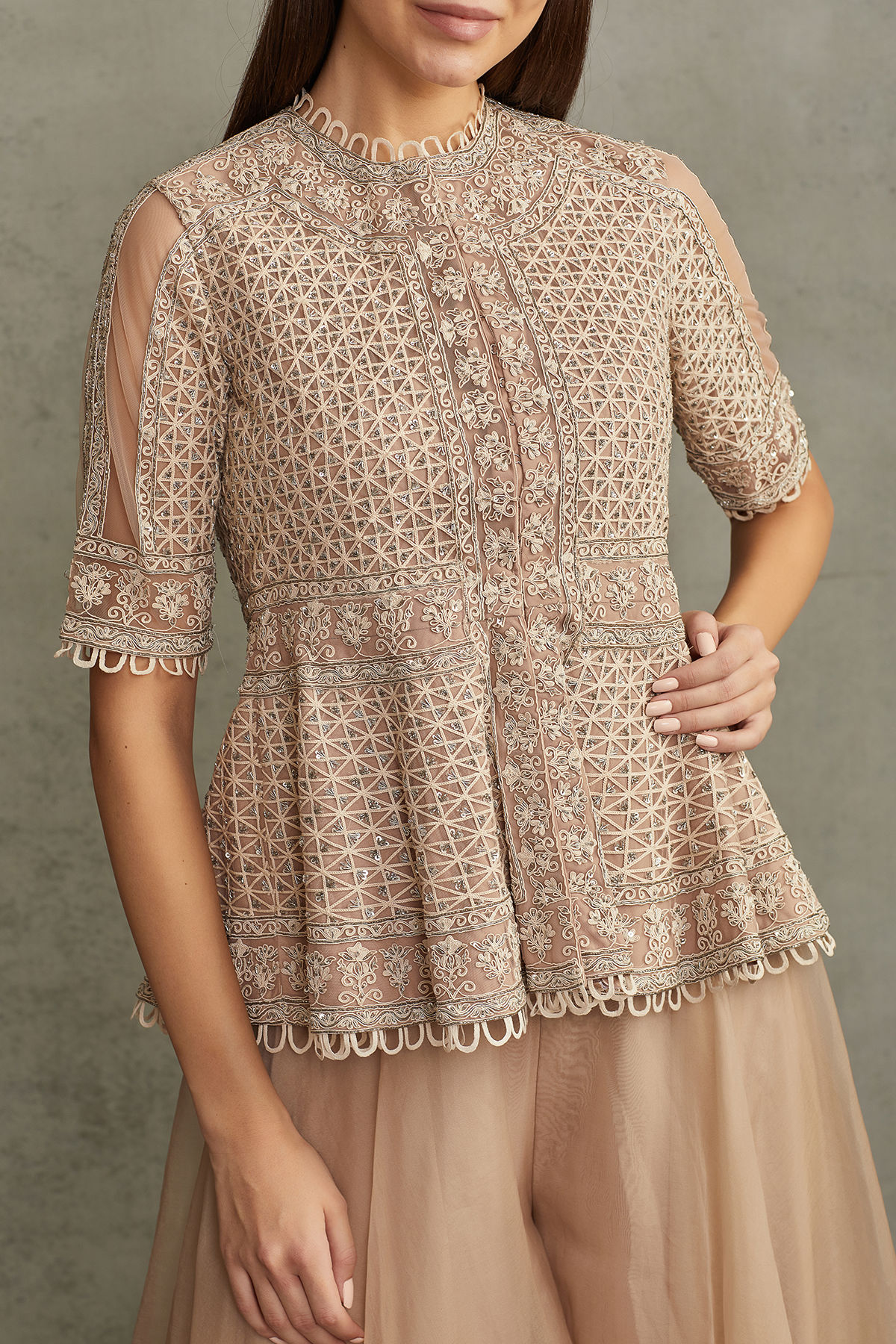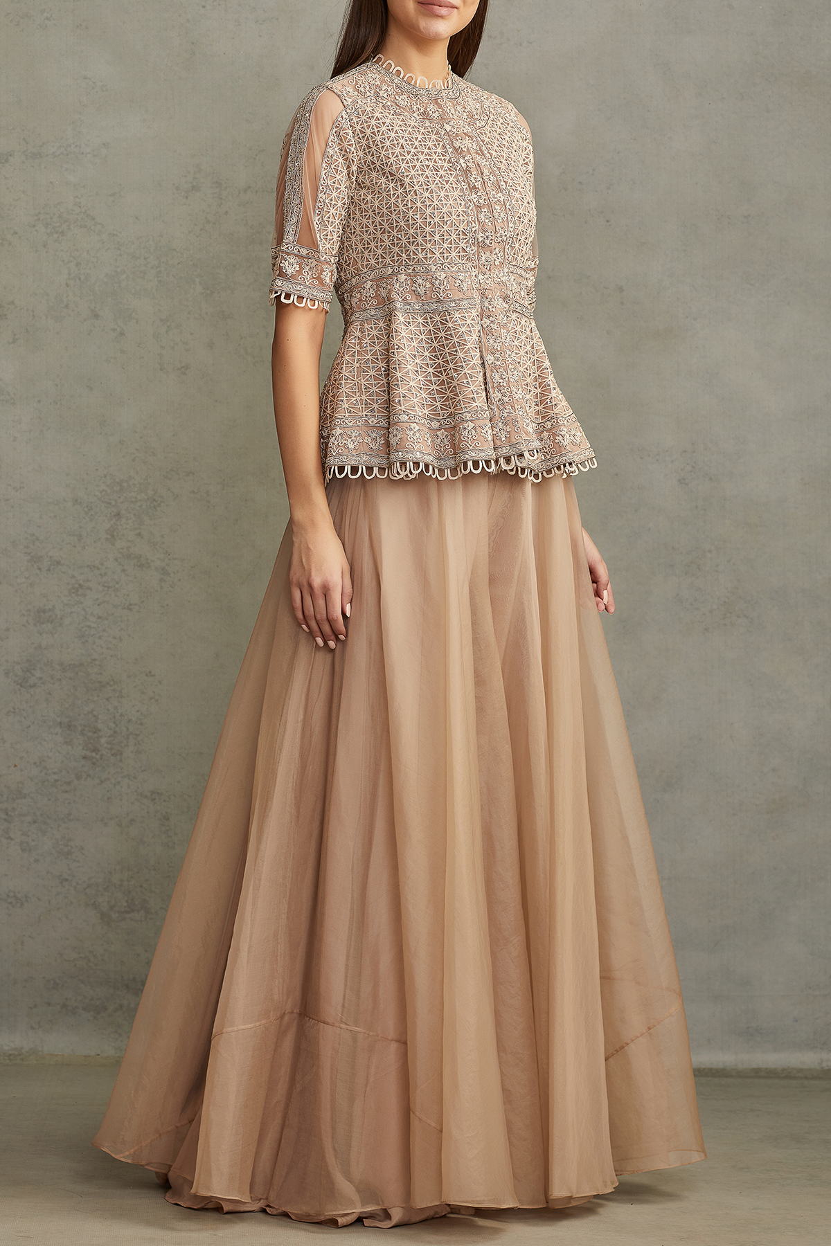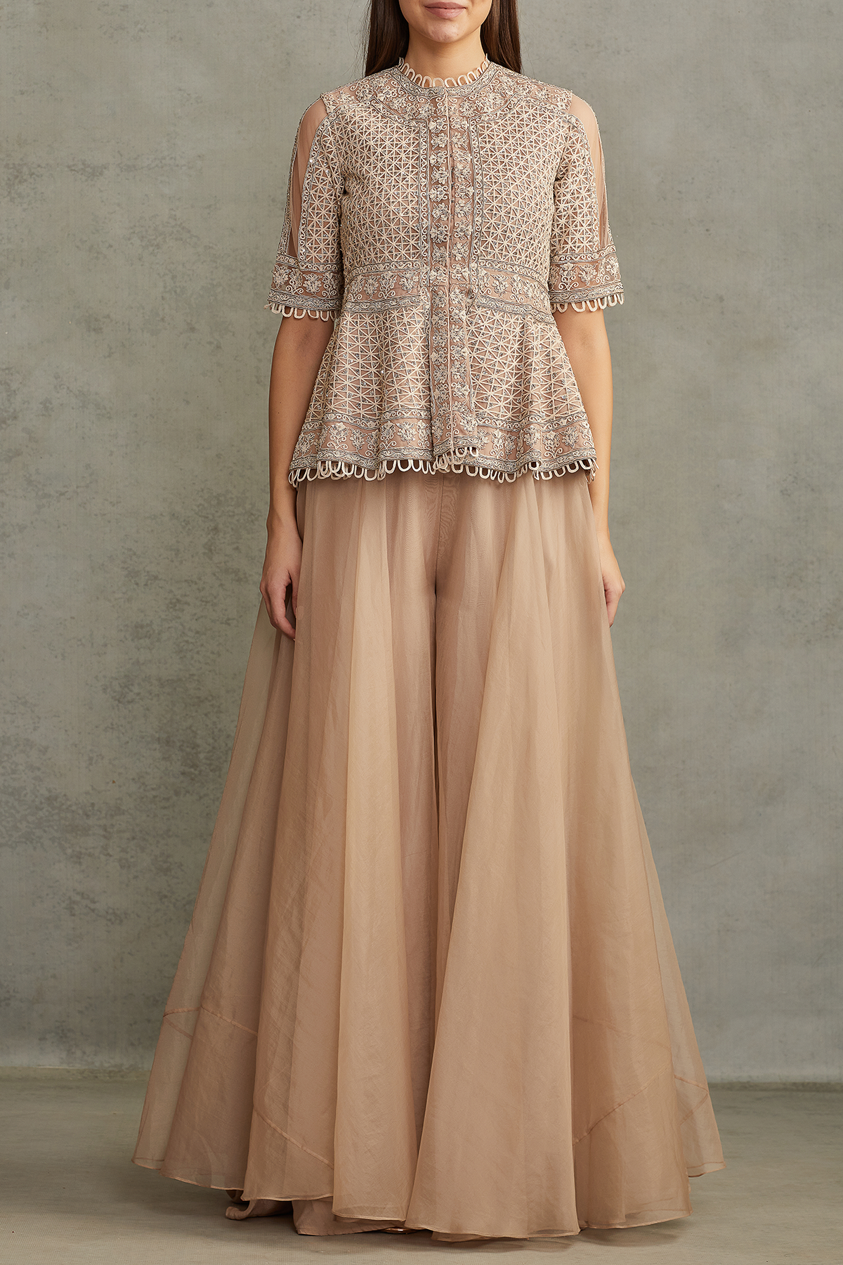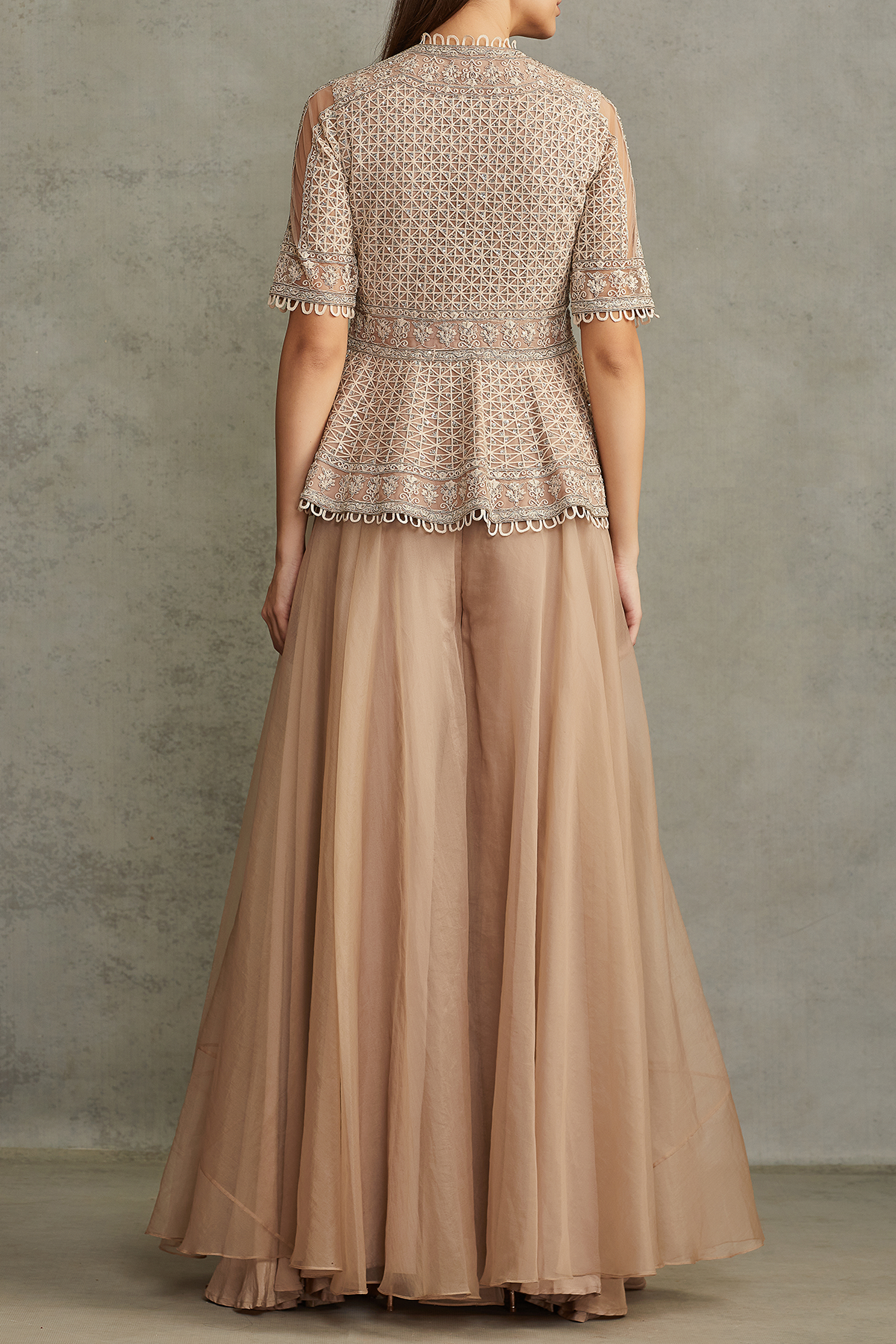 Signature Ridhi Mehra embroidered peplum paired with organza sharara